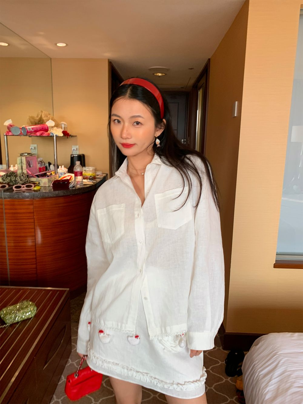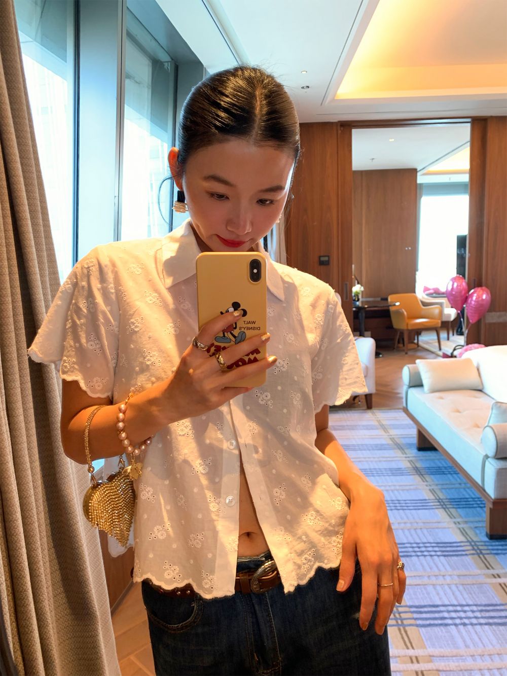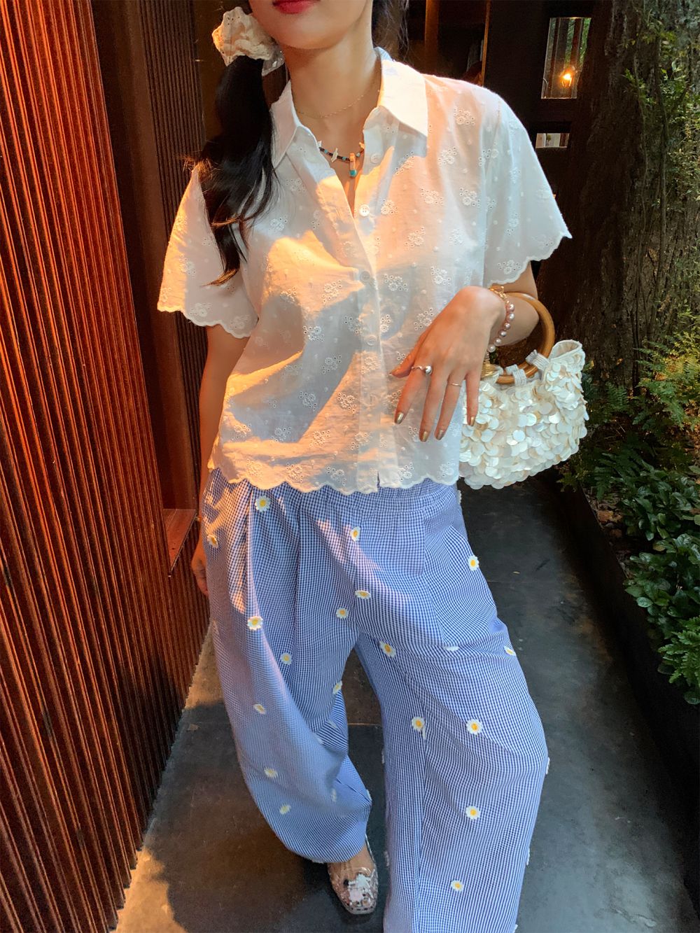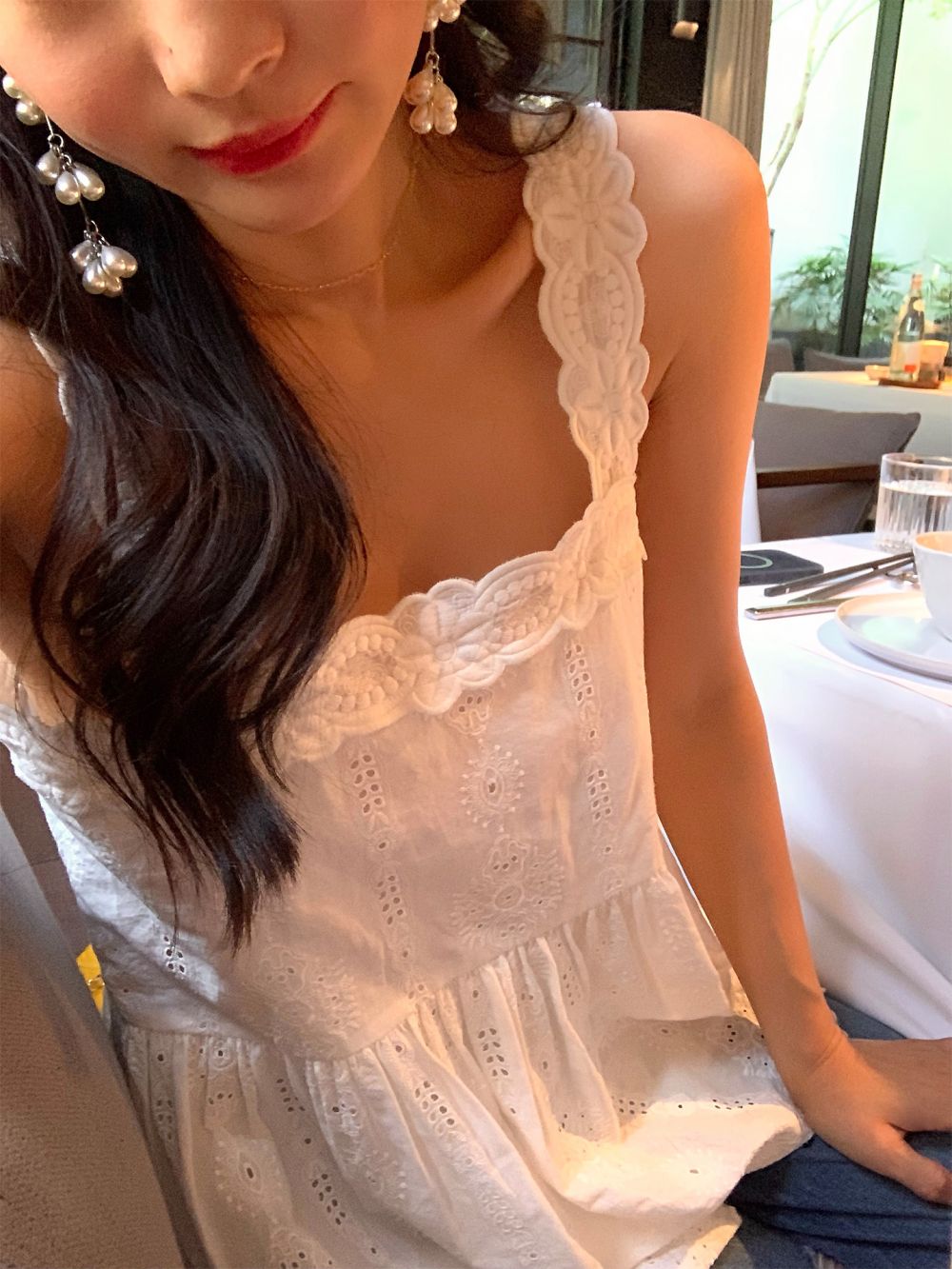 LUO refreshing short-sleeved embroidered hollow white shirt