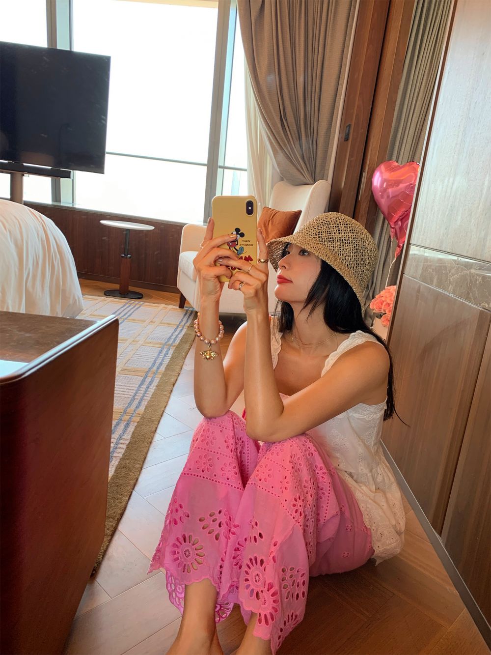 LUO Pink elastic waist lace hollow wide-leg pants