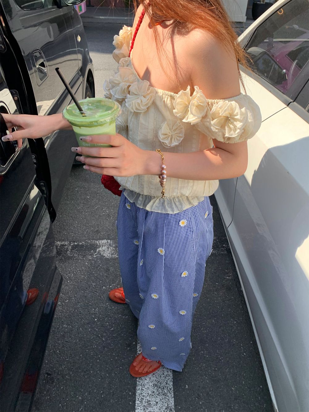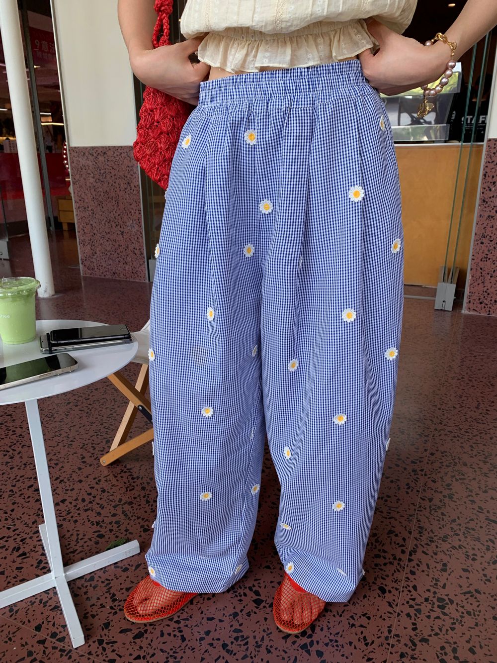 LUO blue plaid pants embroidered high waist wide leg pants