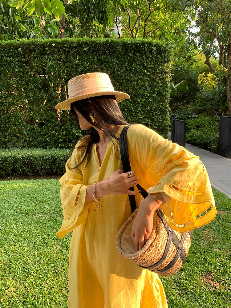LUO linen loose V-neck embroidered hollow long-sleeved dress