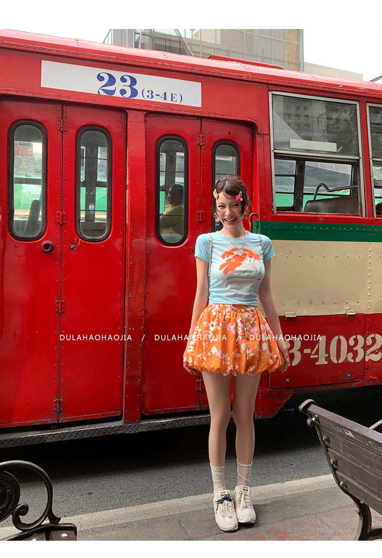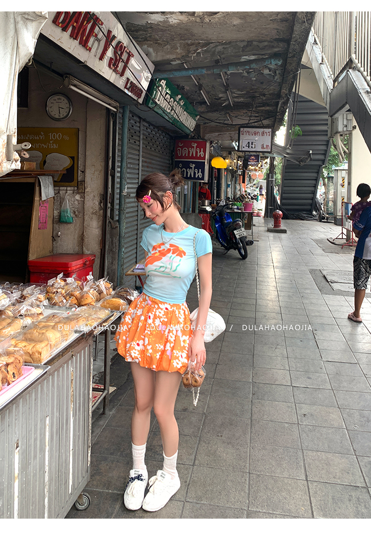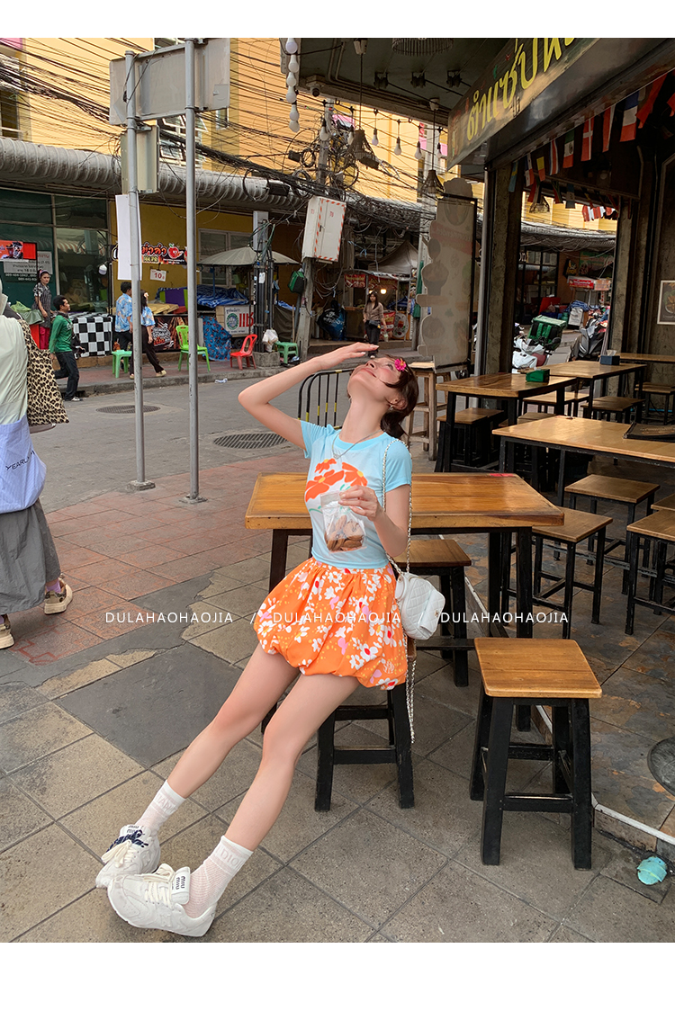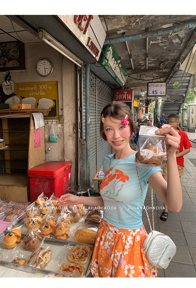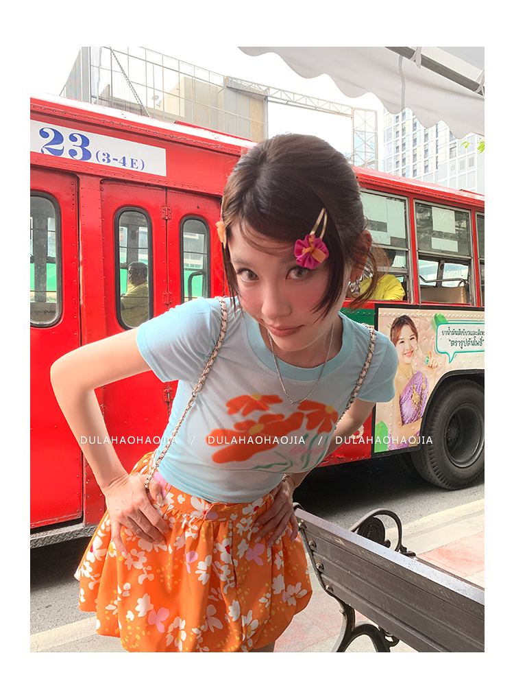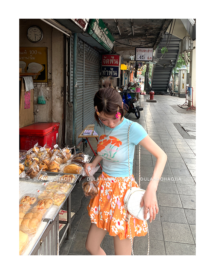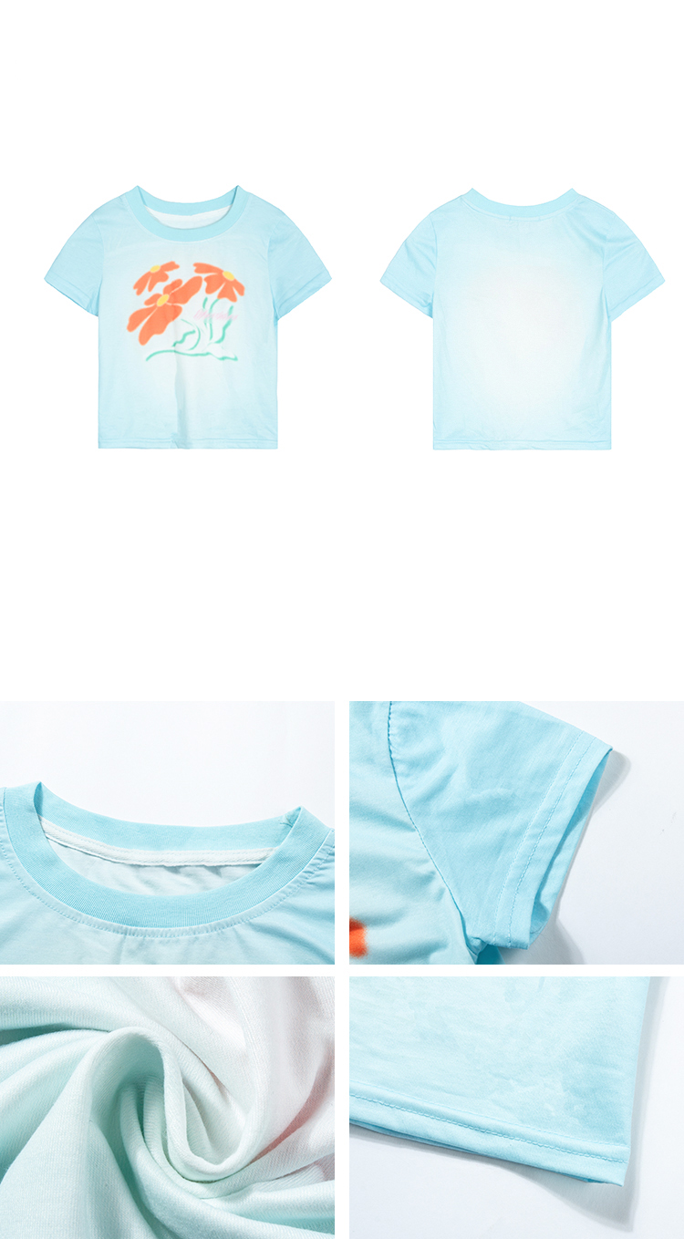DULA Blue Gradient Flower Shoulder Short Sleeve T-Shirt