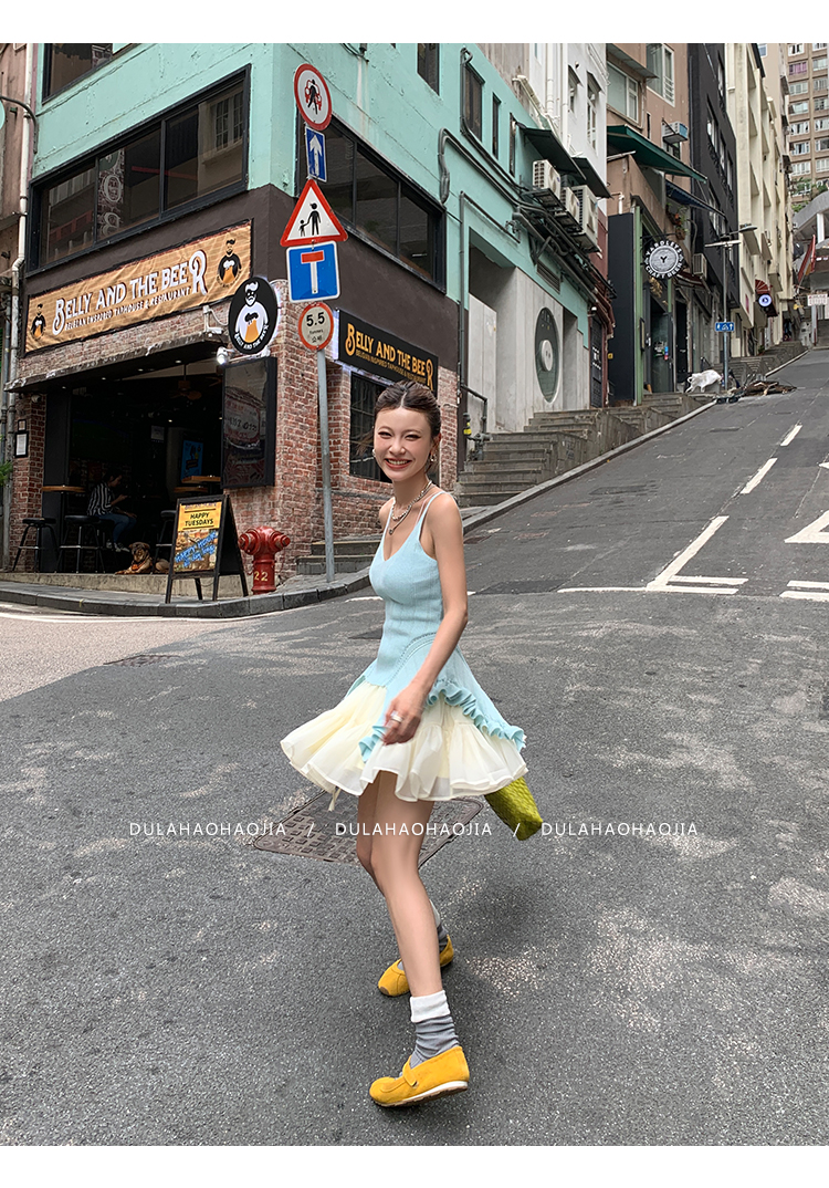 DULA Irregular Lotus Leaf Edge Blue Knit Strap Top