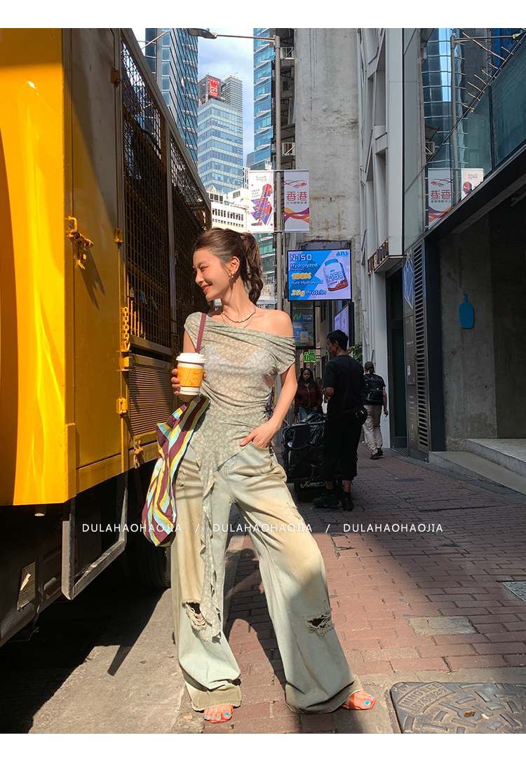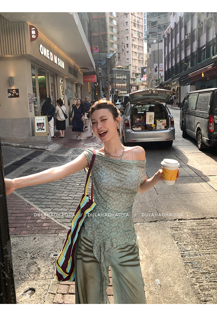 DULA Irregular Mesh One-Shaped Shoulder T-Shirt