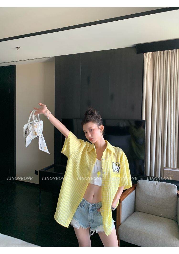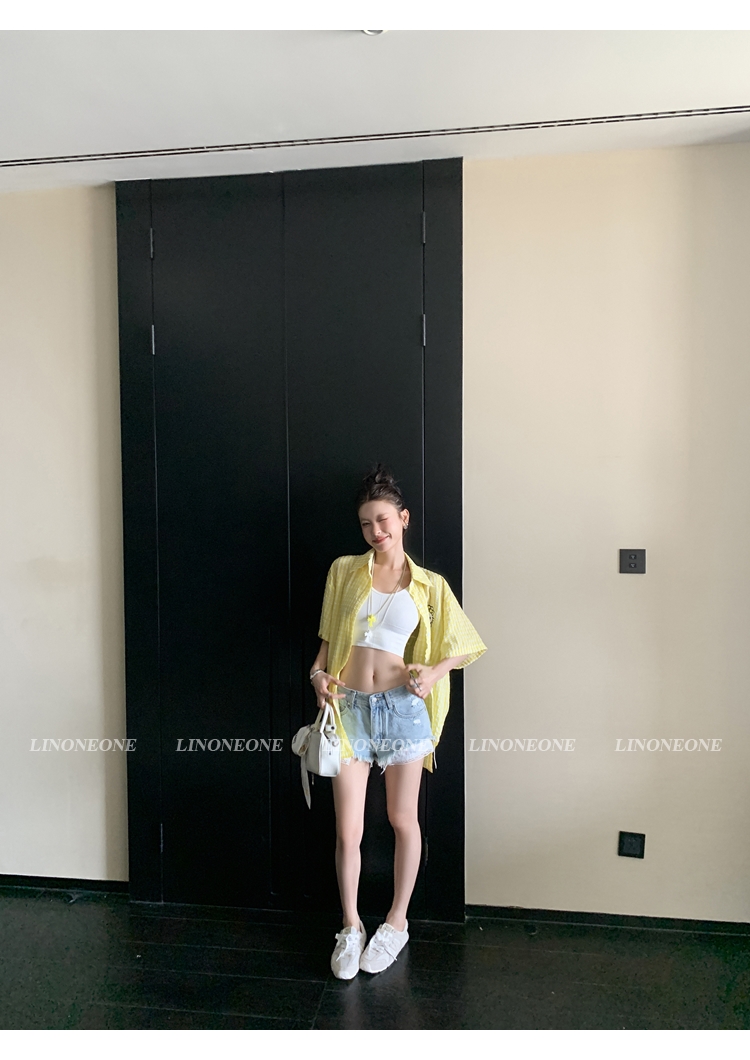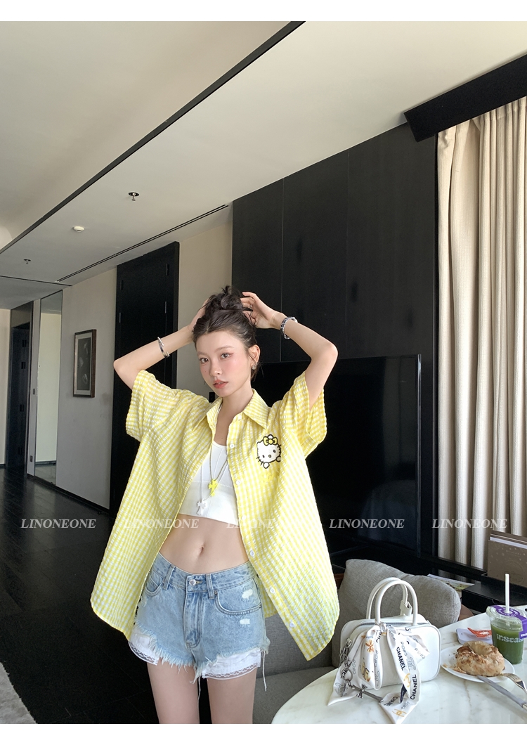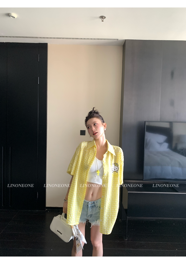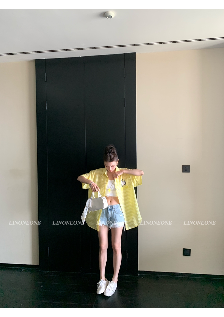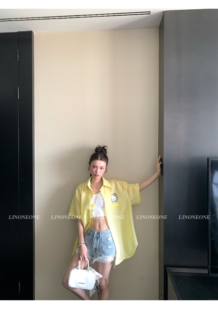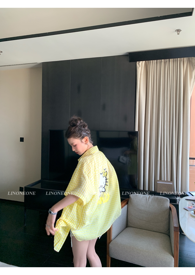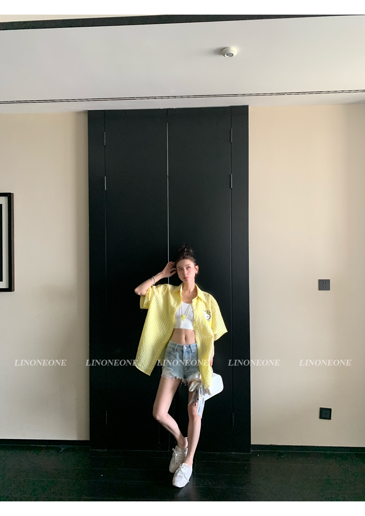 LIN bubble yellow and white plaid short sleeve lazy sun protection shirt
