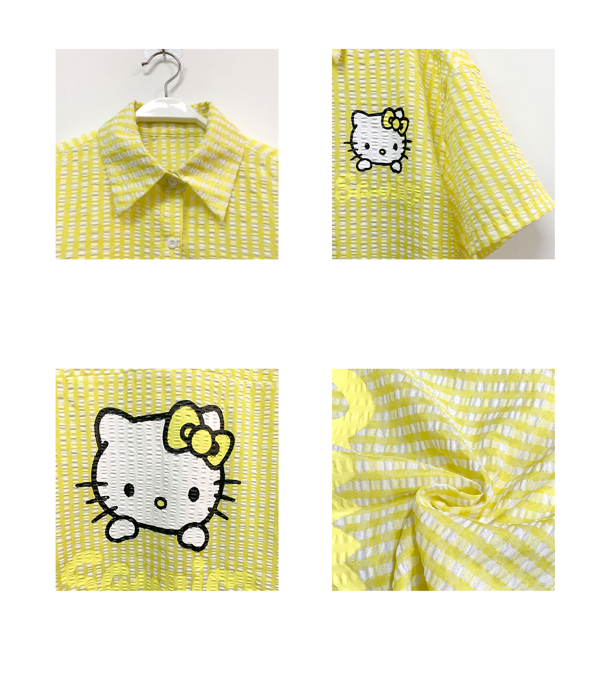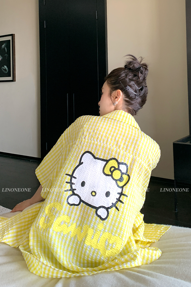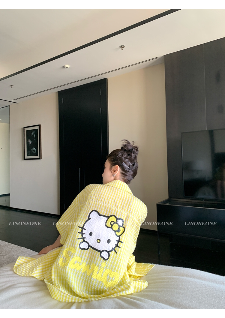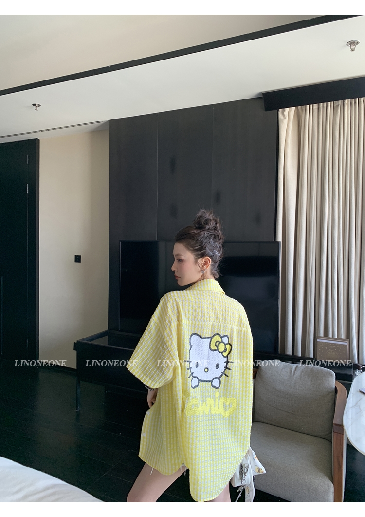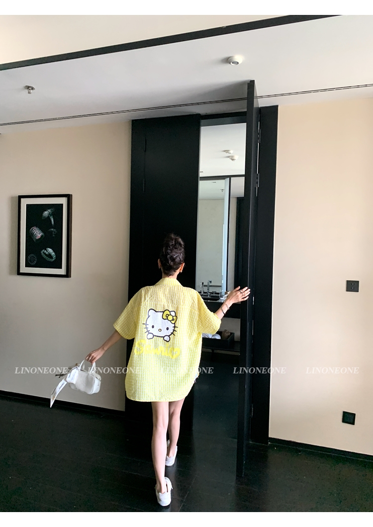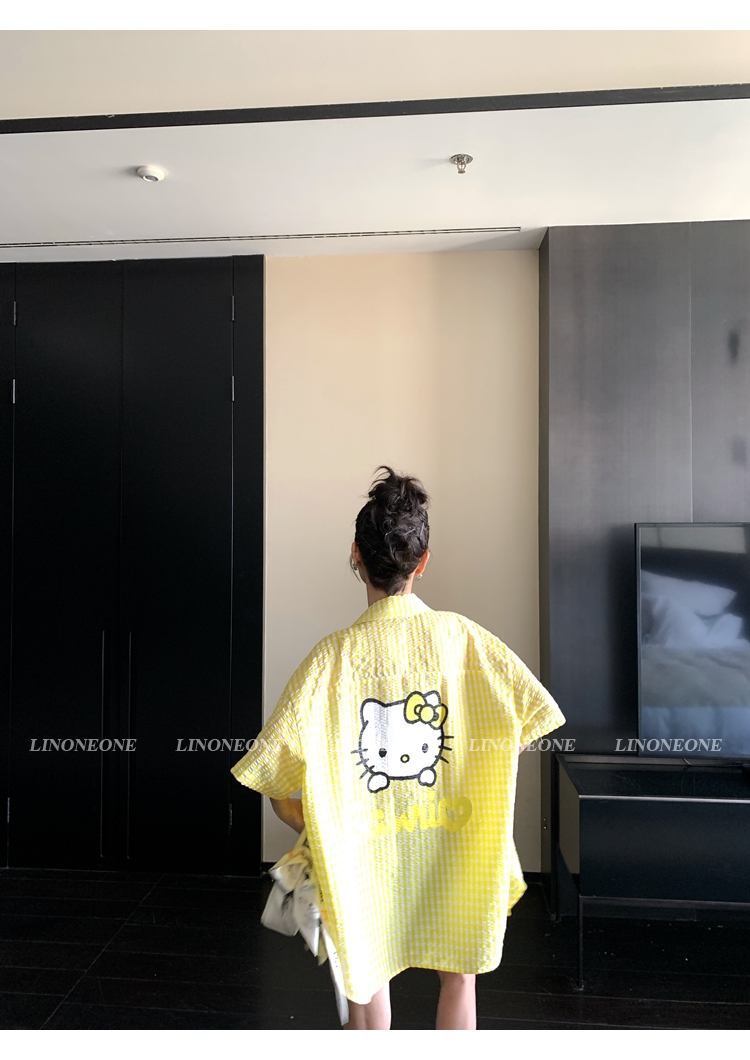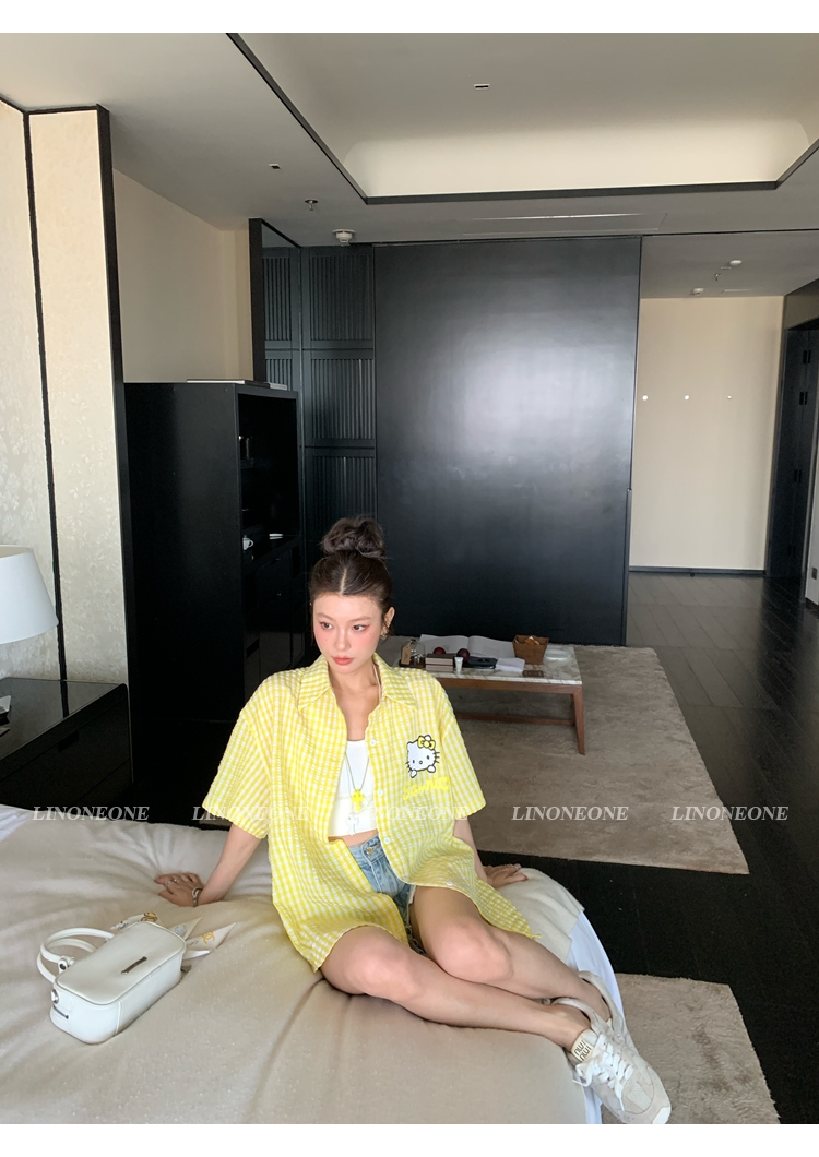 LIN bubble yellow and white plaid short sleeve lazy sun protection shirt