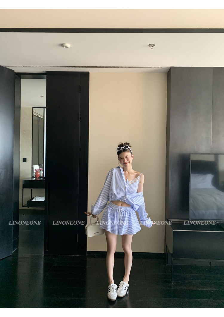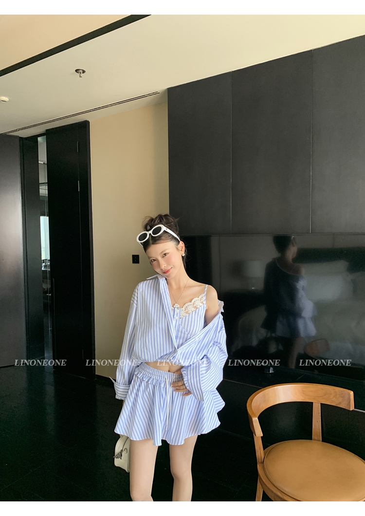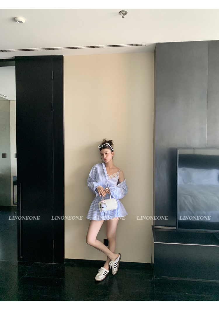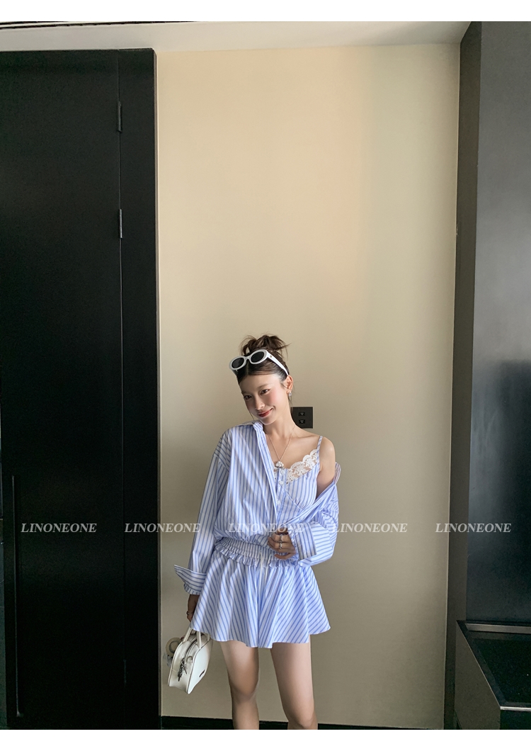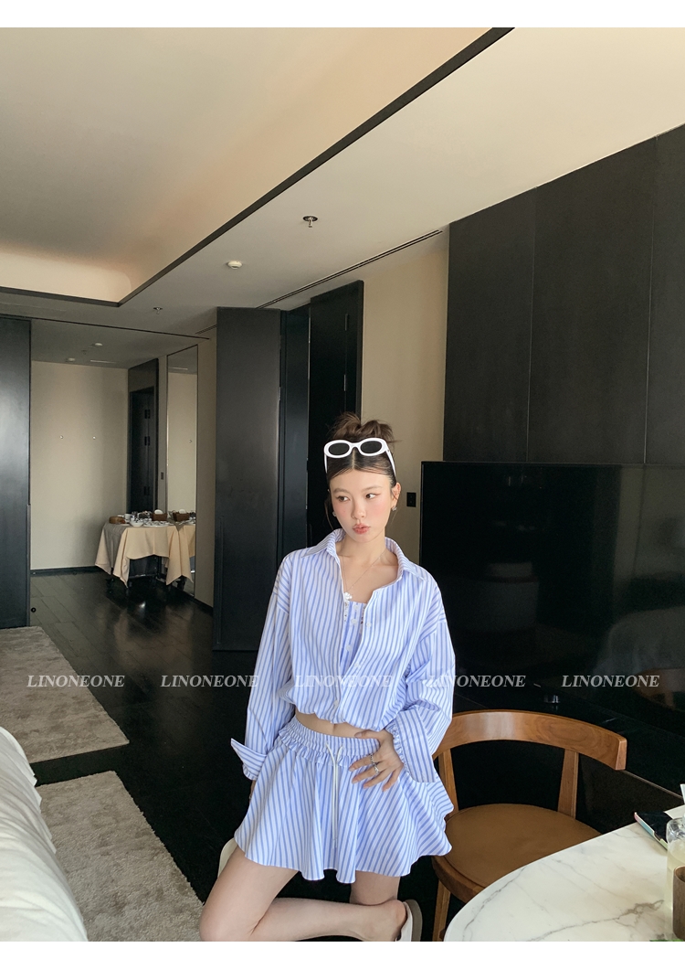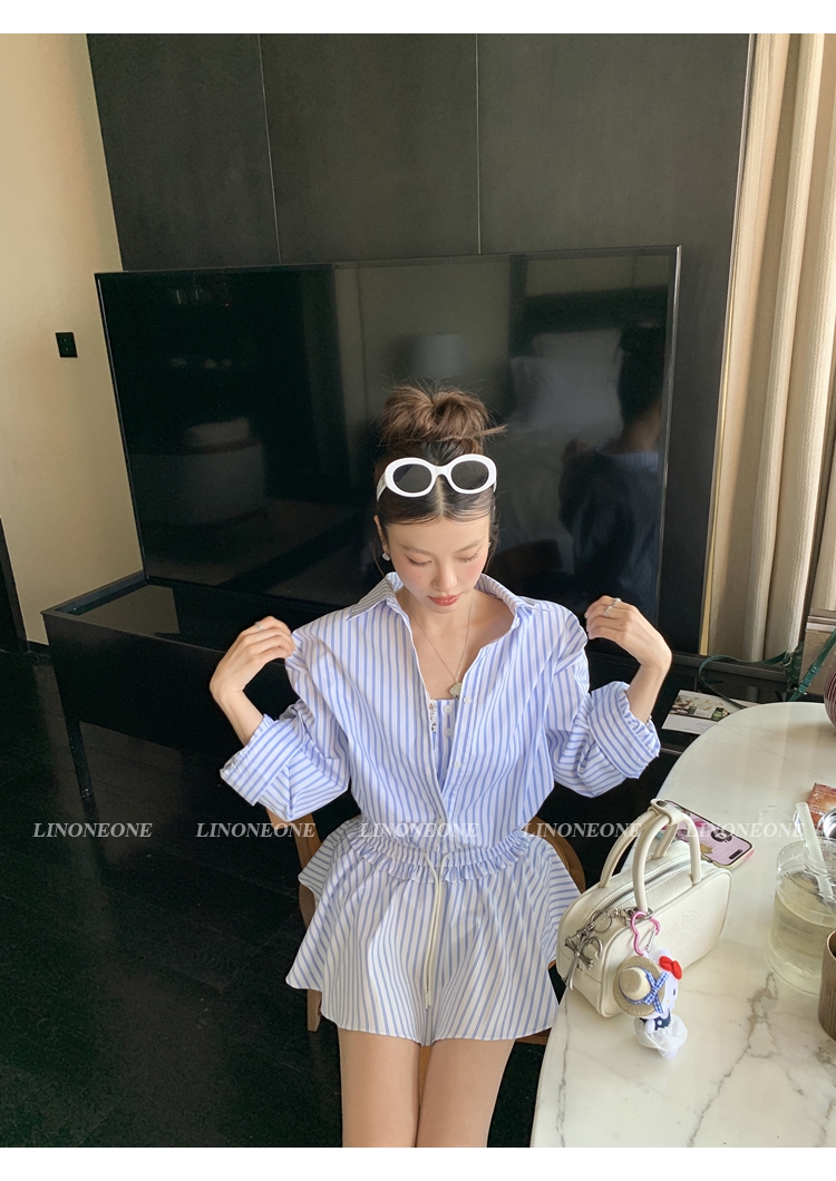 LIN vertical stripes fake two-piece suspenders shirt skirt pants set