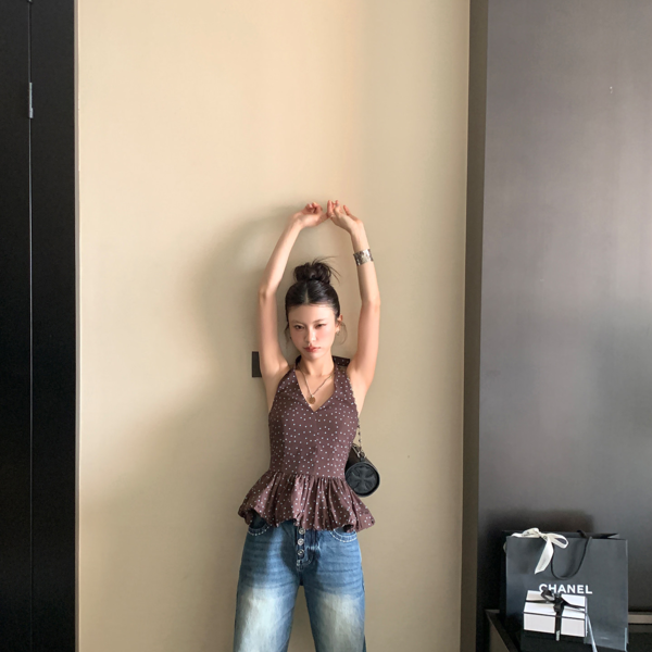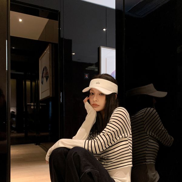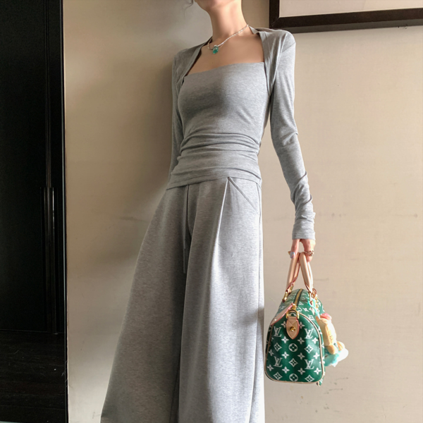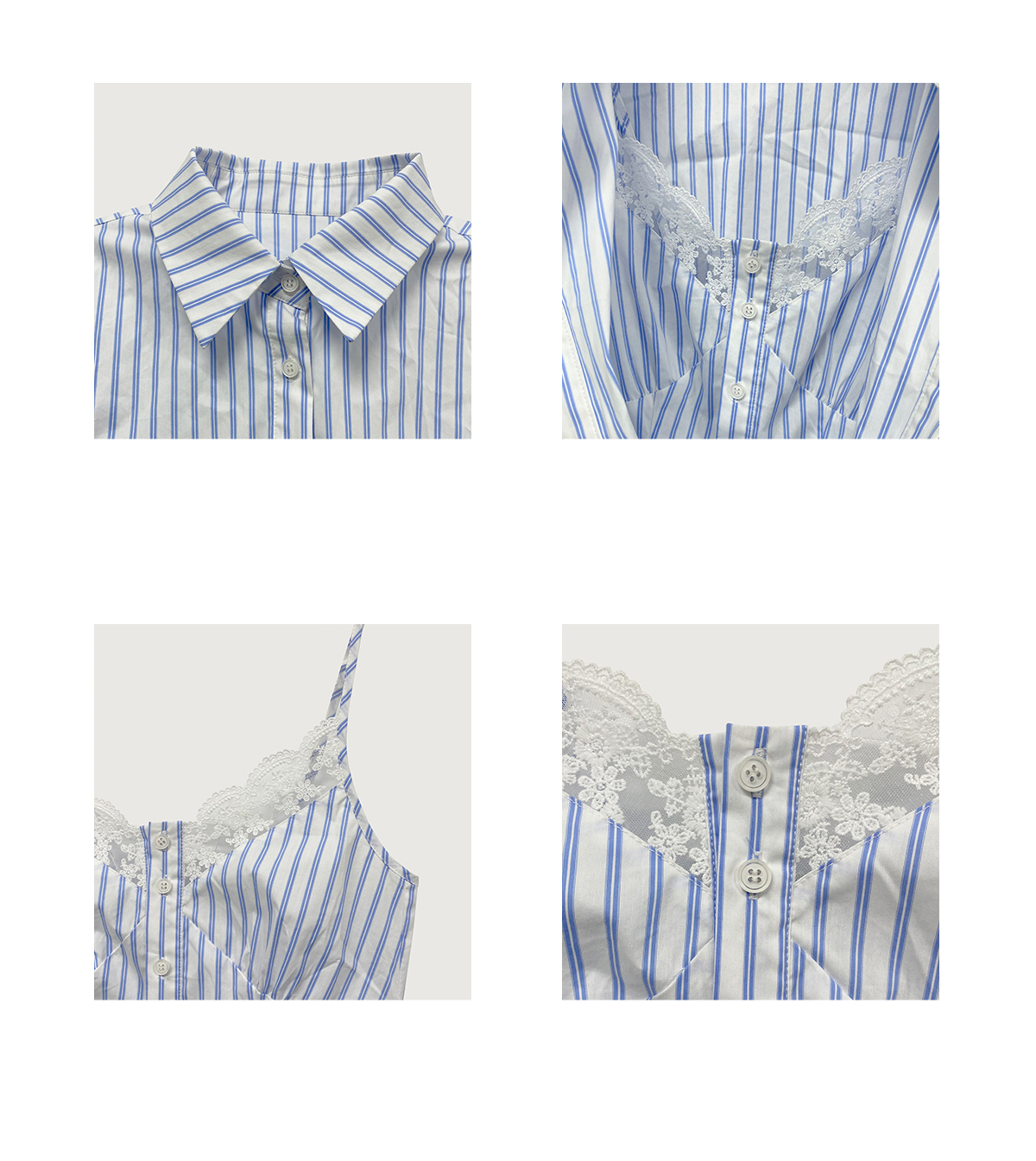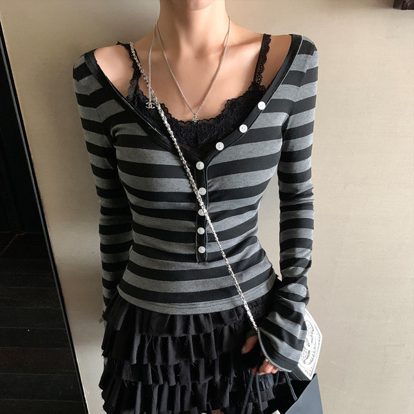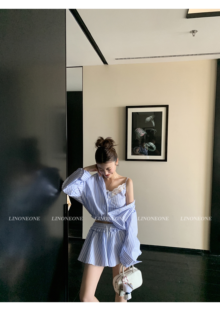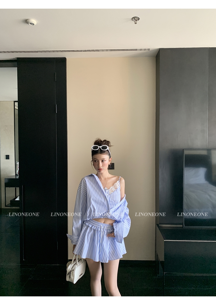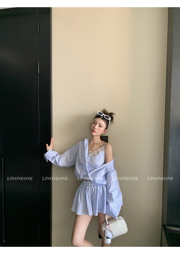 LIN vertical stripes fake two-piece suspenders shirt skirt pants set