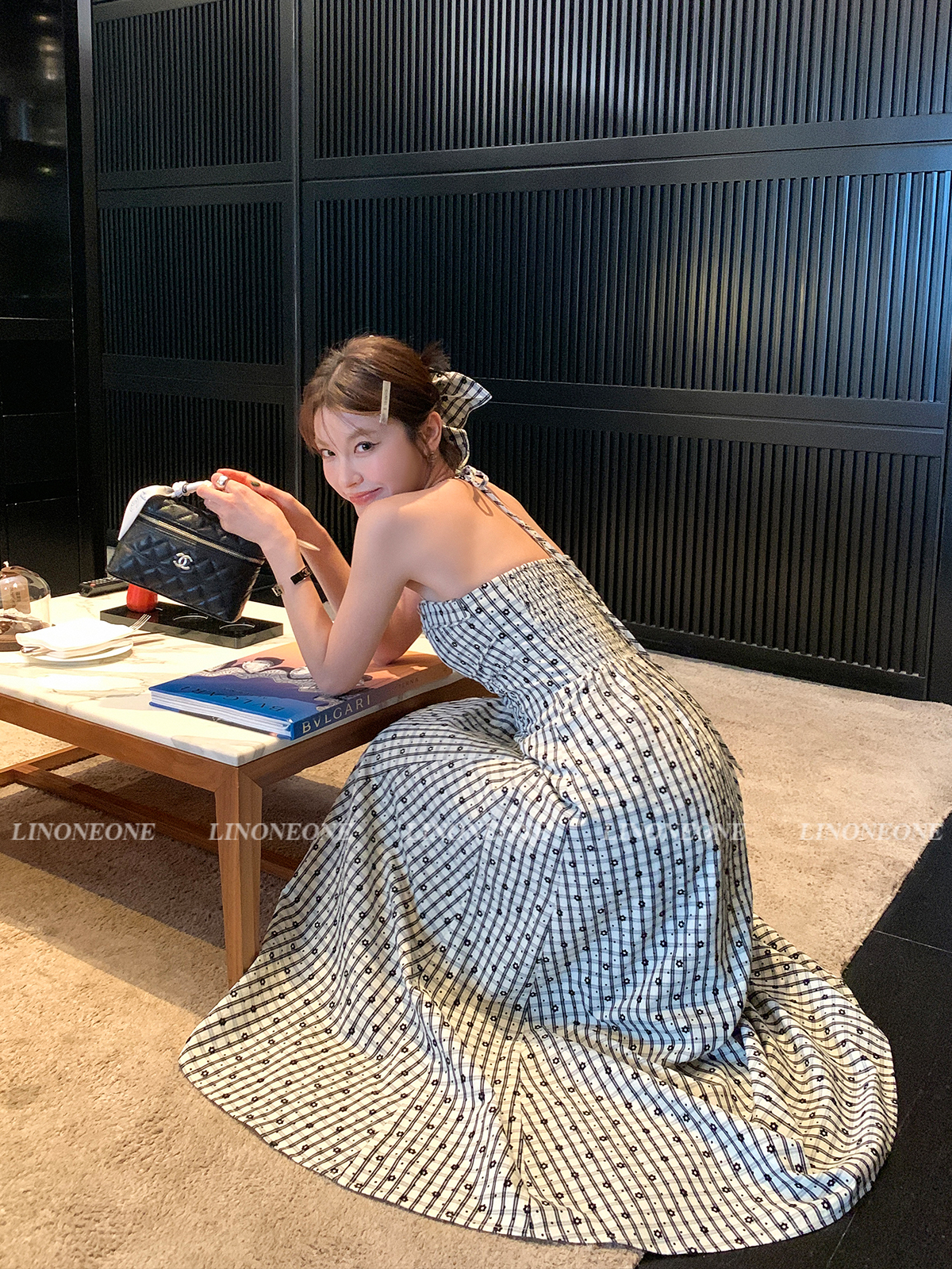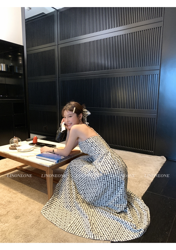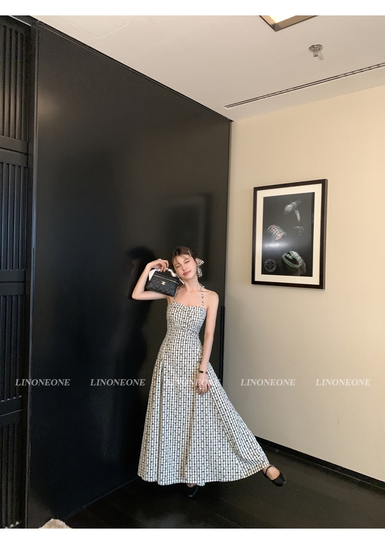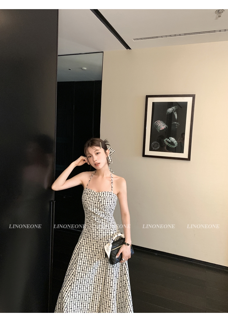 LIN French textured black and white checkered halter neck dress