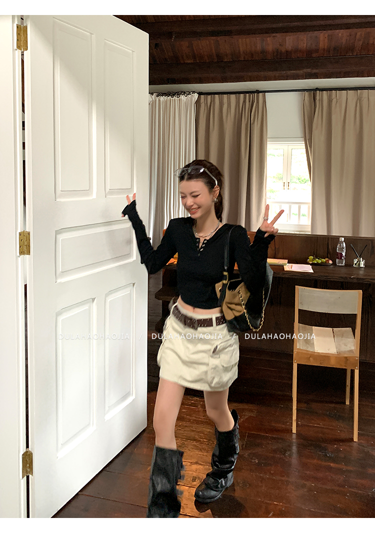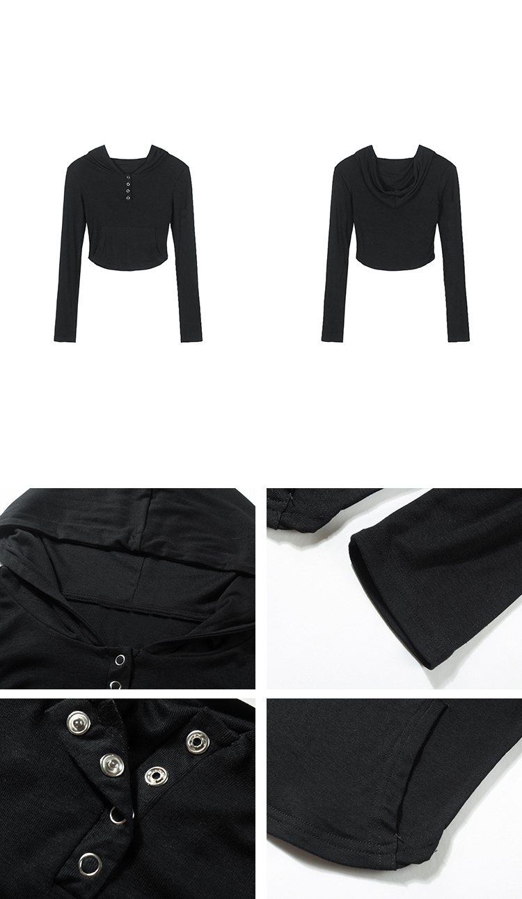 DULA Oxygen Black Hooded Short V-neck Long Sleeve T-shirt