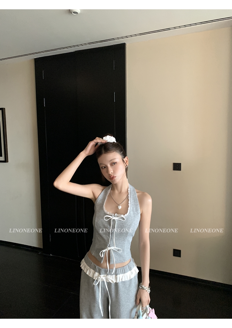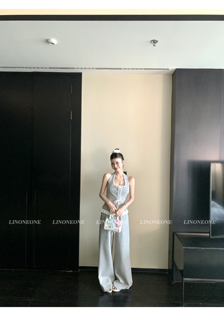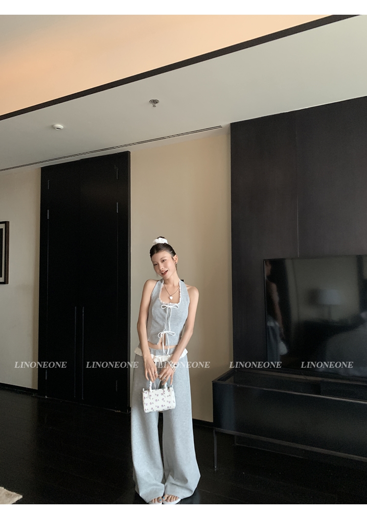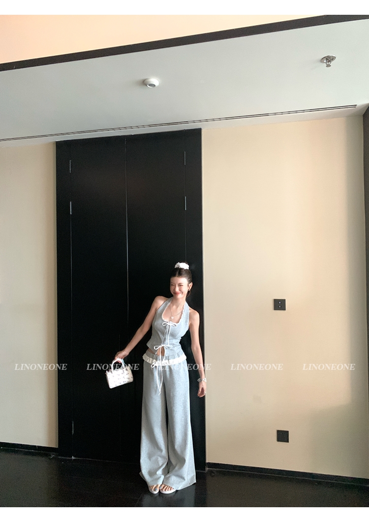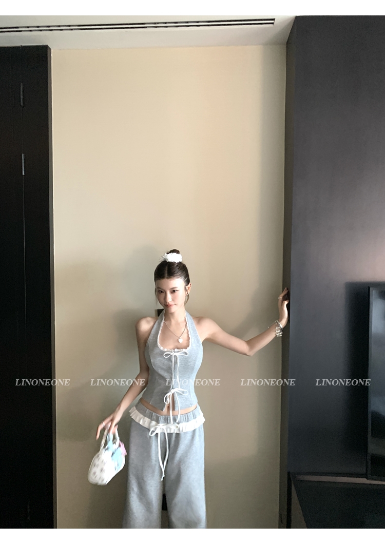 LIN Cream Ballet Gray Bow Necklace Tank Top Long Pants Set