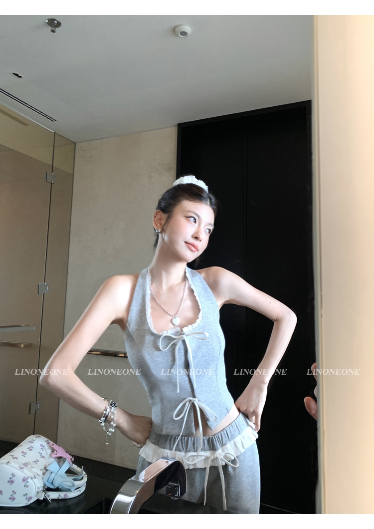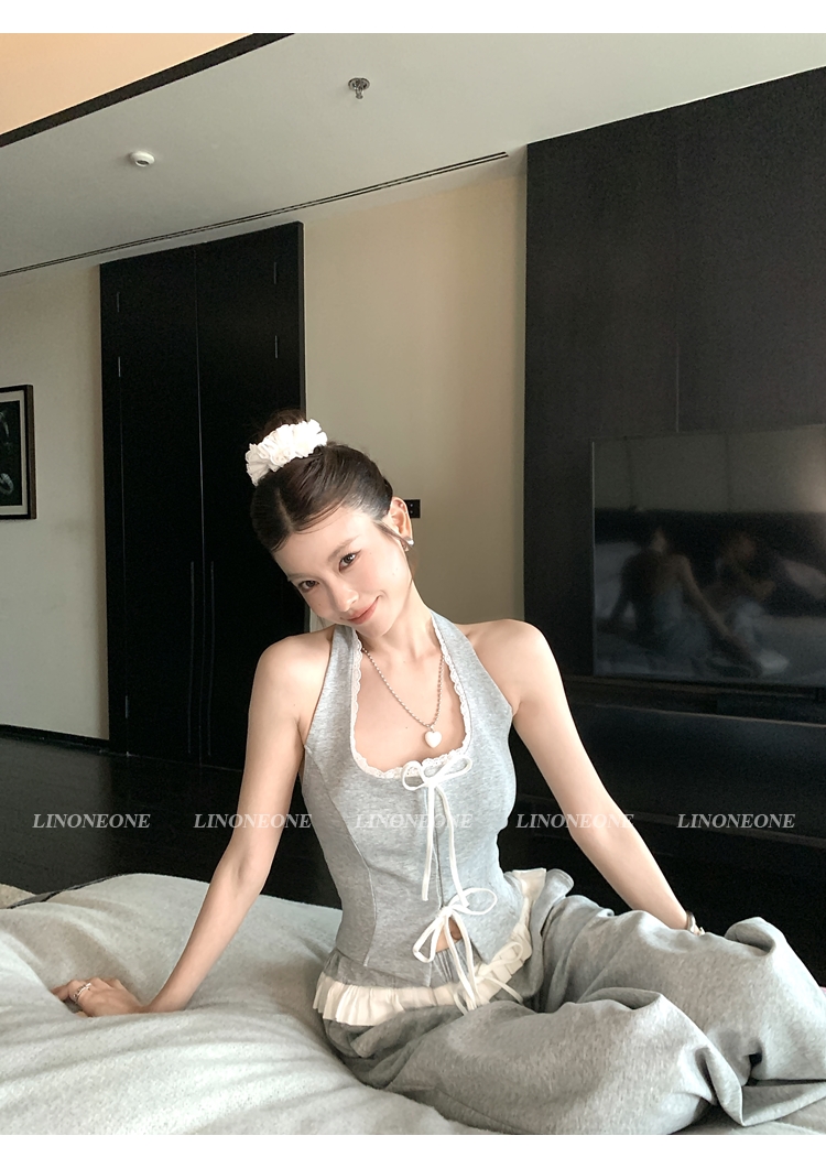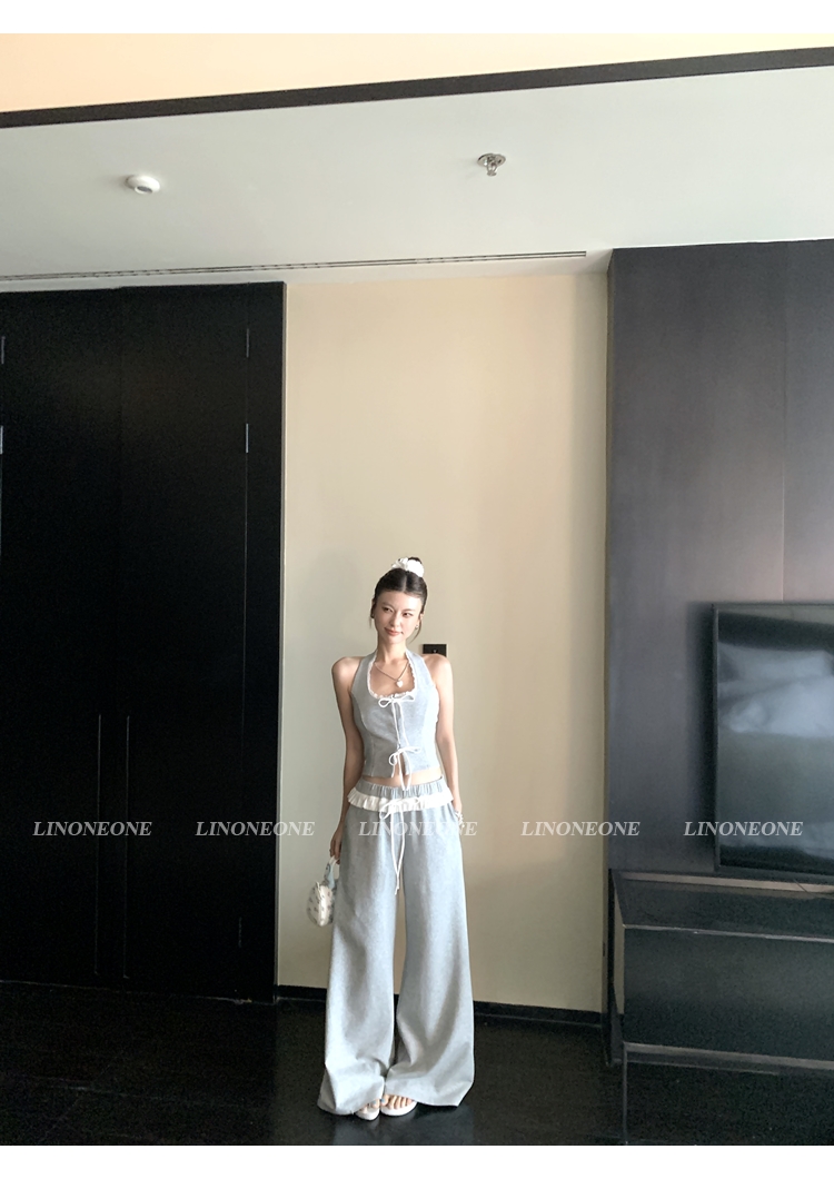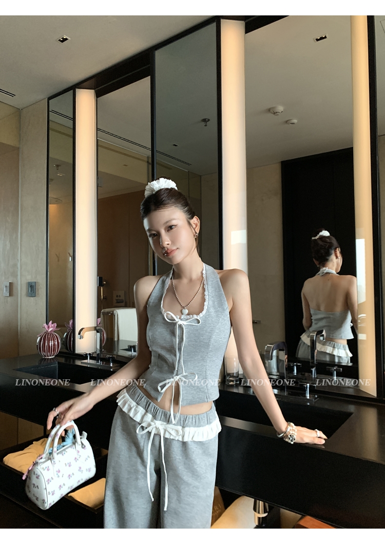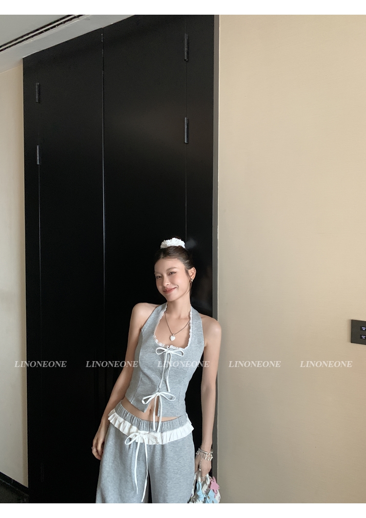 LIN Cream Ballet Gray Bow Necklace Tank Top Long Pants Set