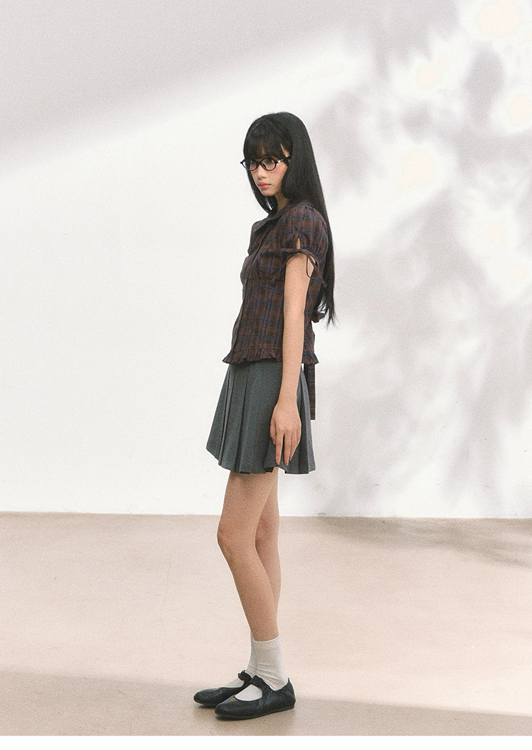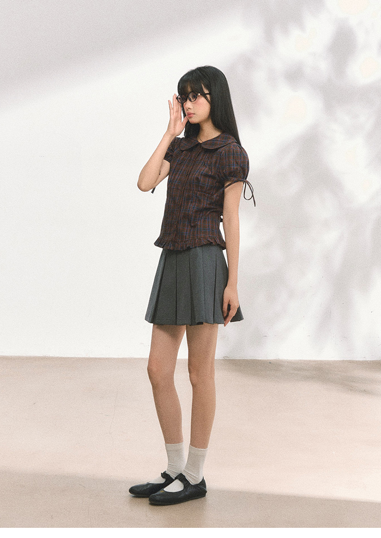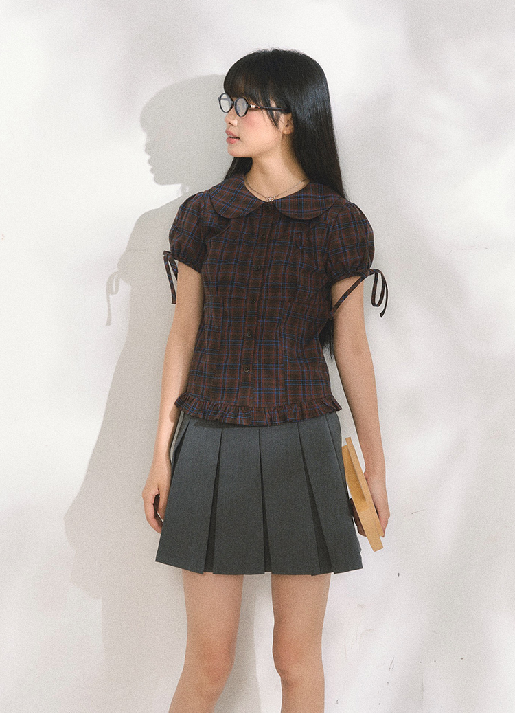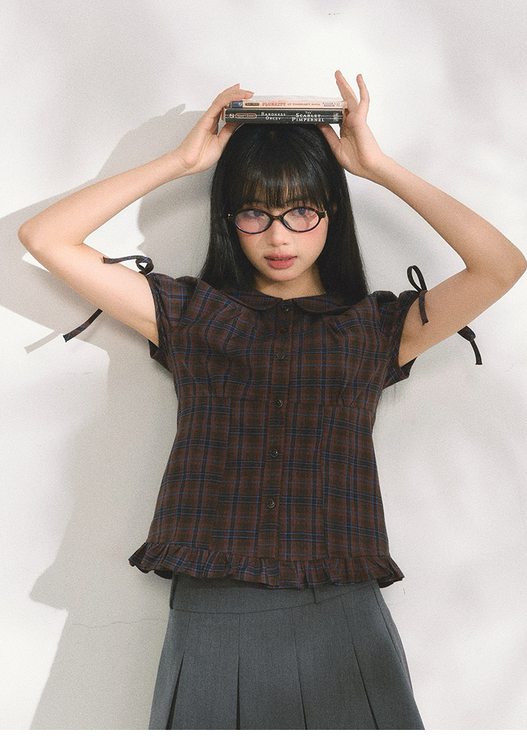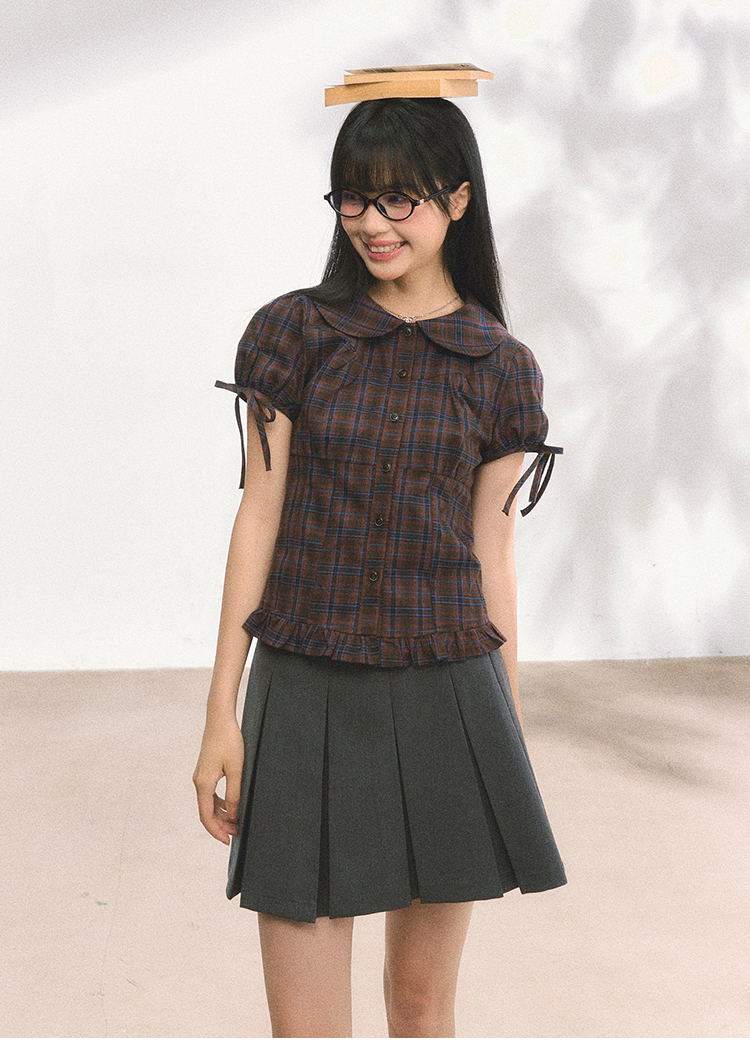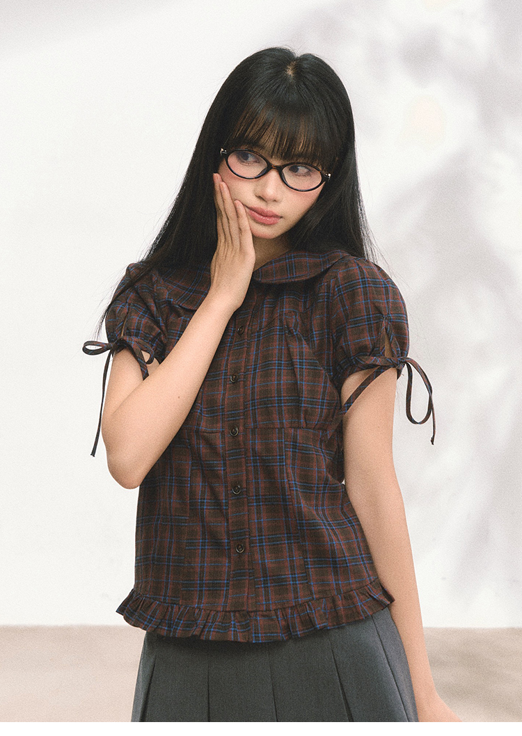 MAP Vintage Checked Pure Cotton Doll Collar Bubble Sleeve Shirt