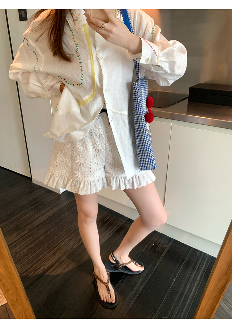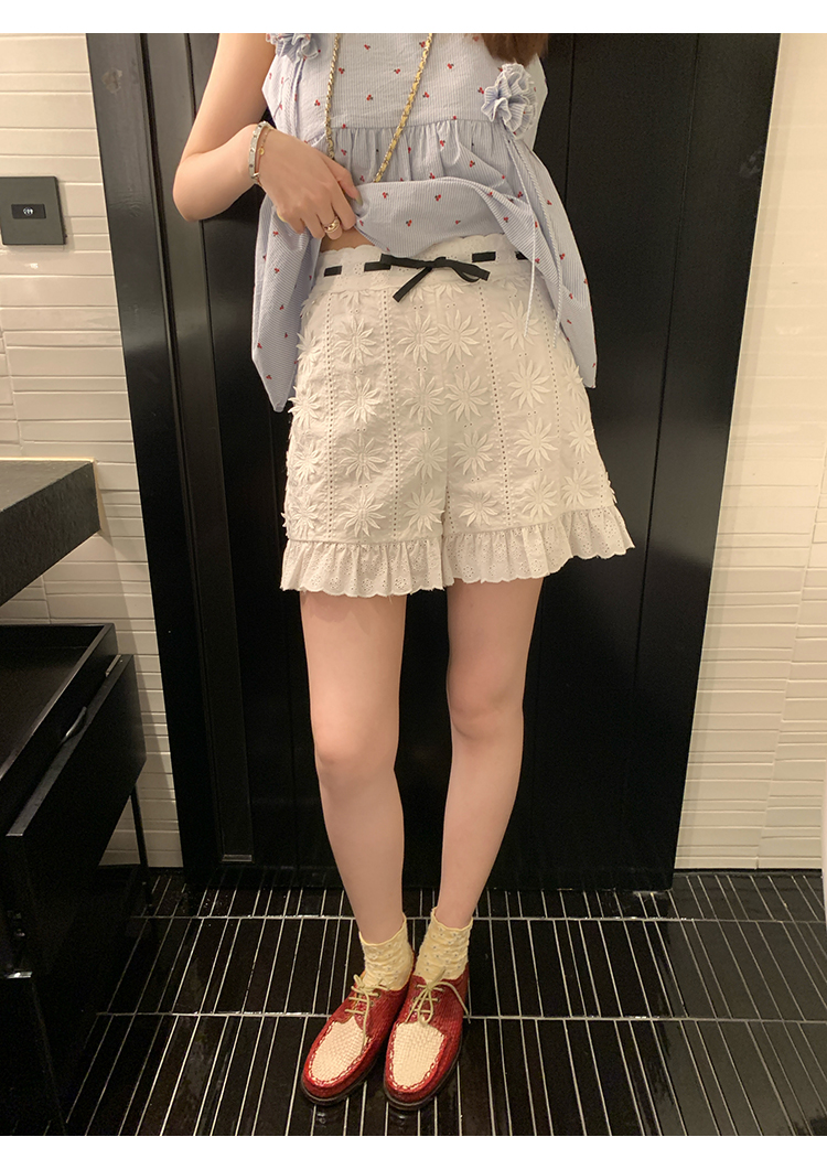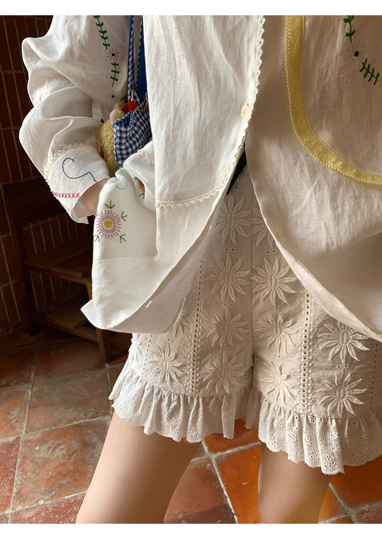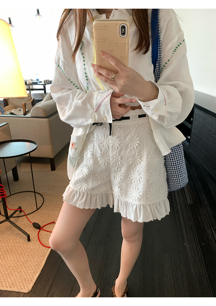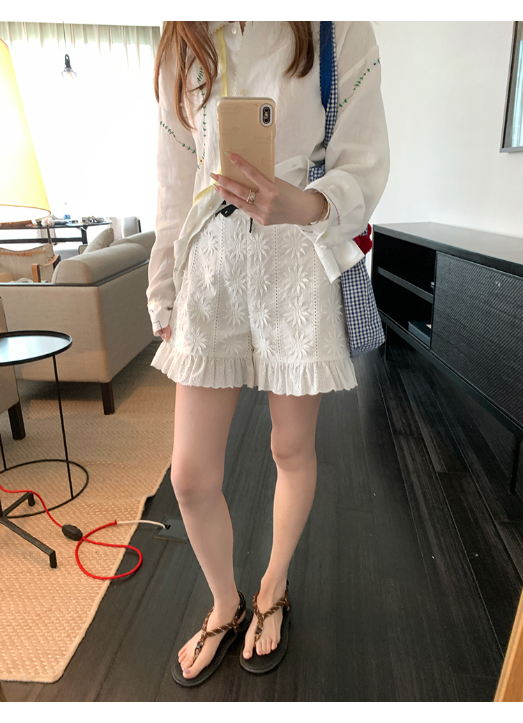 RZZ French Cotton Embroidered Lotus Leaf Edge White Shorts