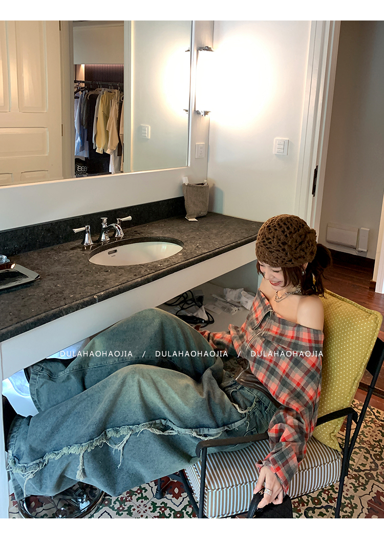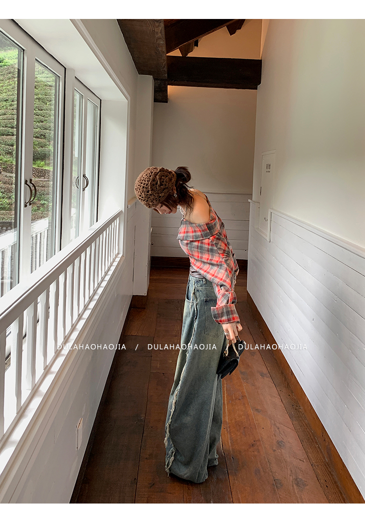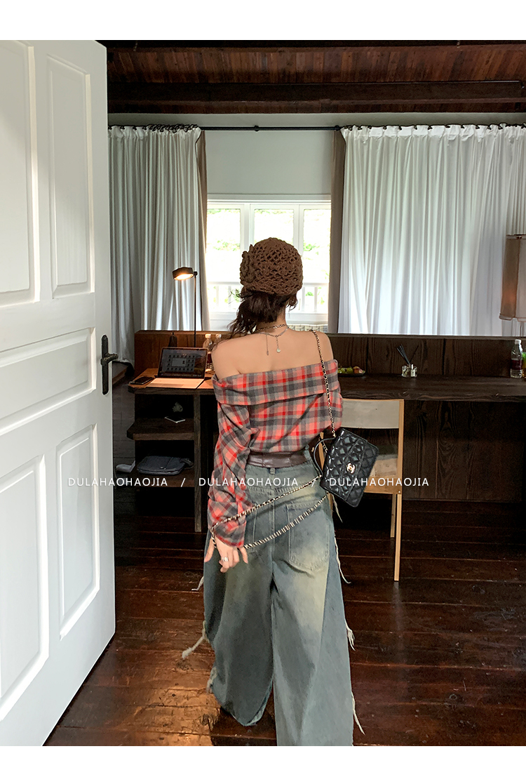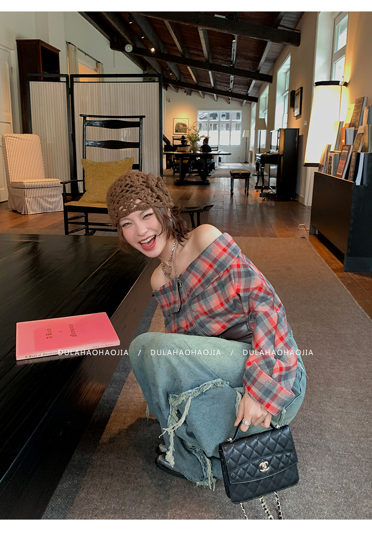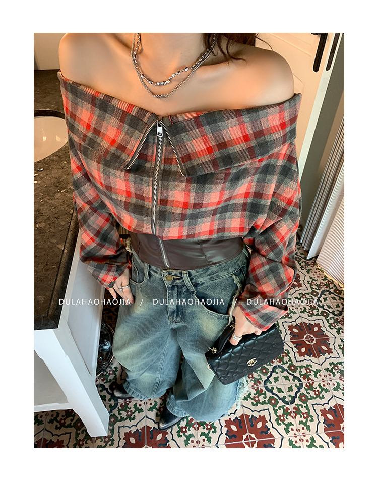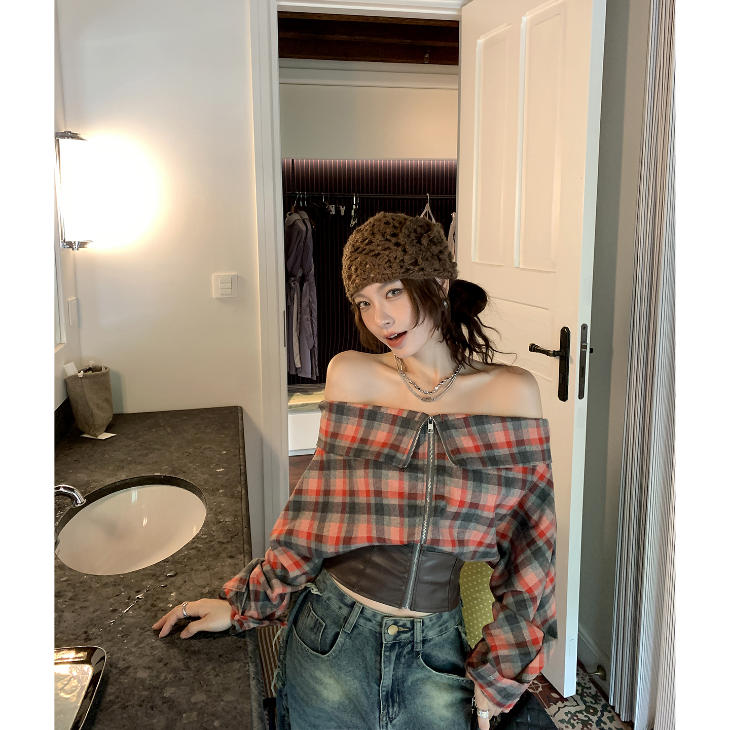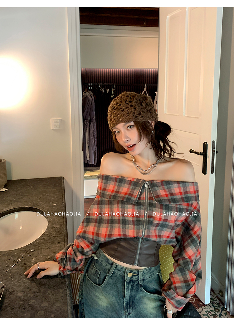 DULA Street Girl Plaid Leather Shoulder Short Shirt