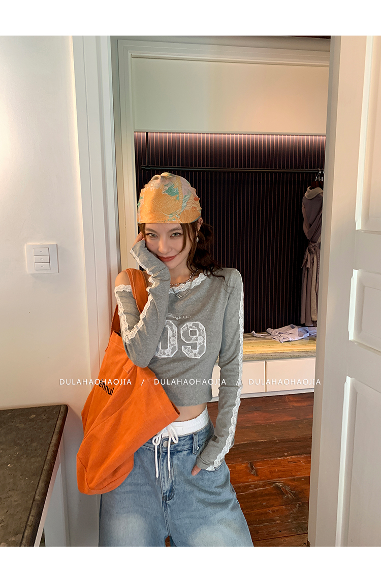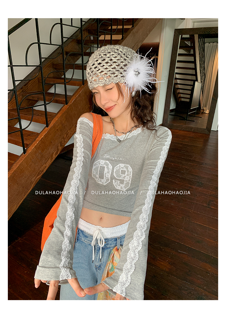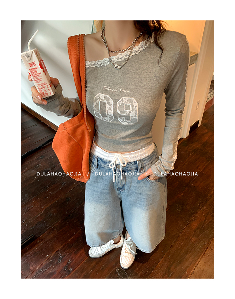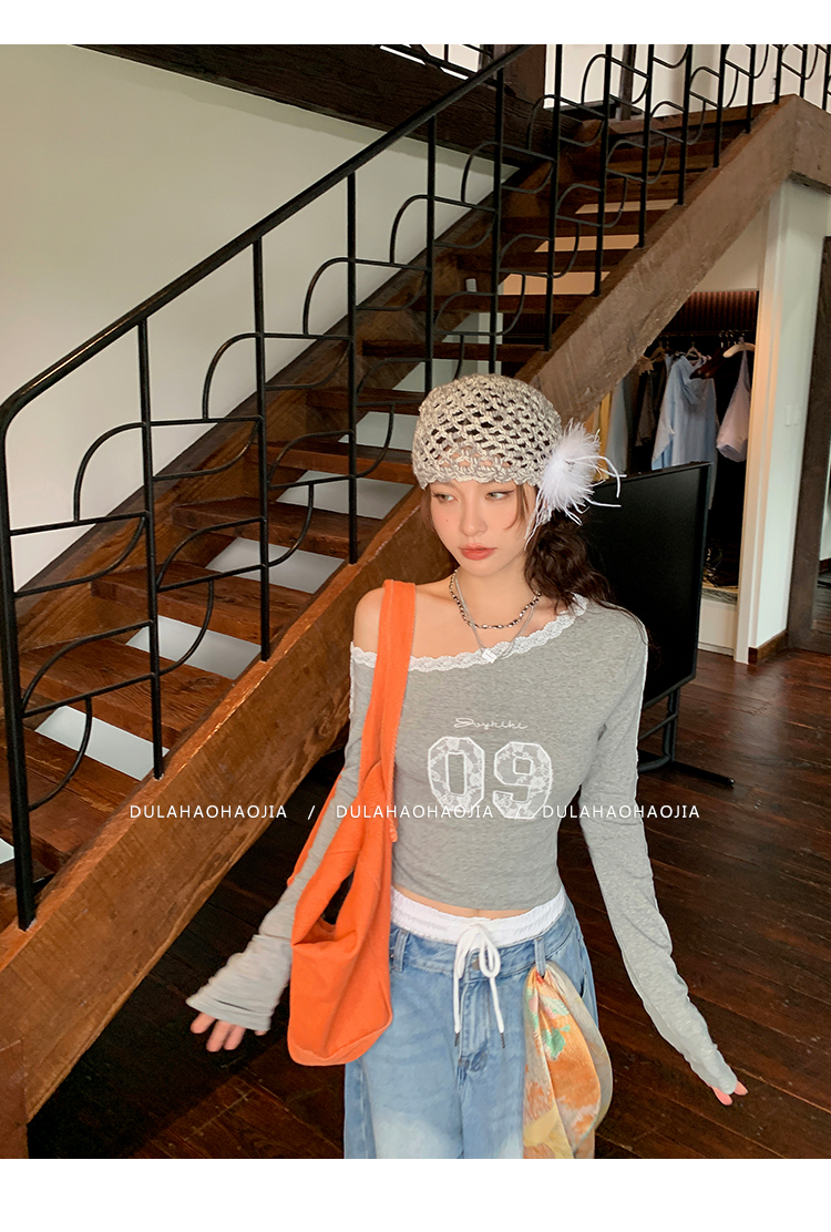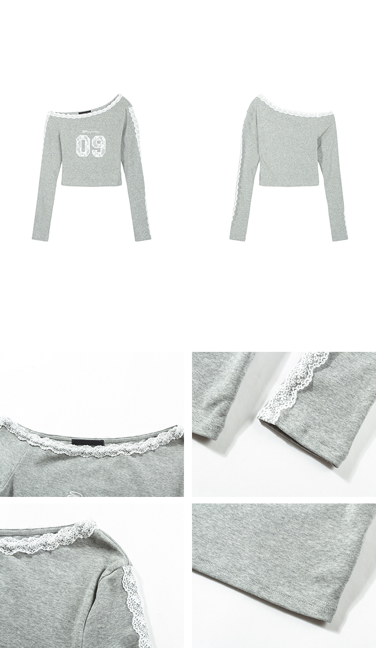 DULA Lace Edge Shoulder-Shaped Long-Sleeve T-Shirt