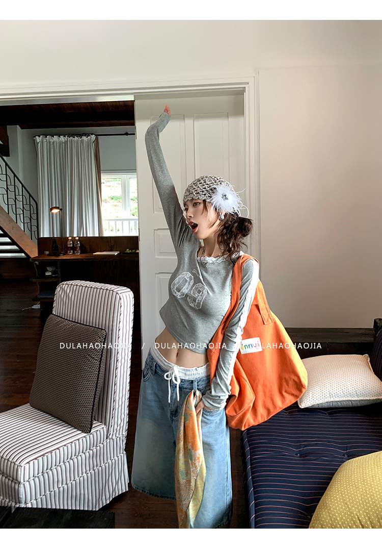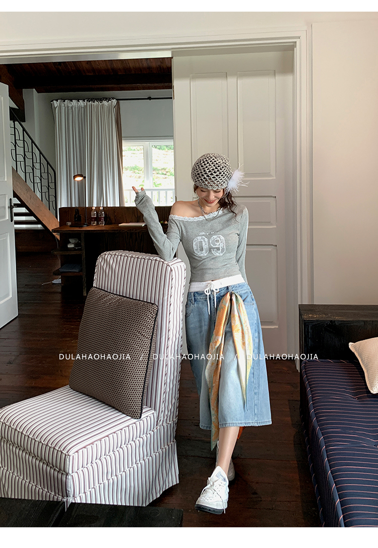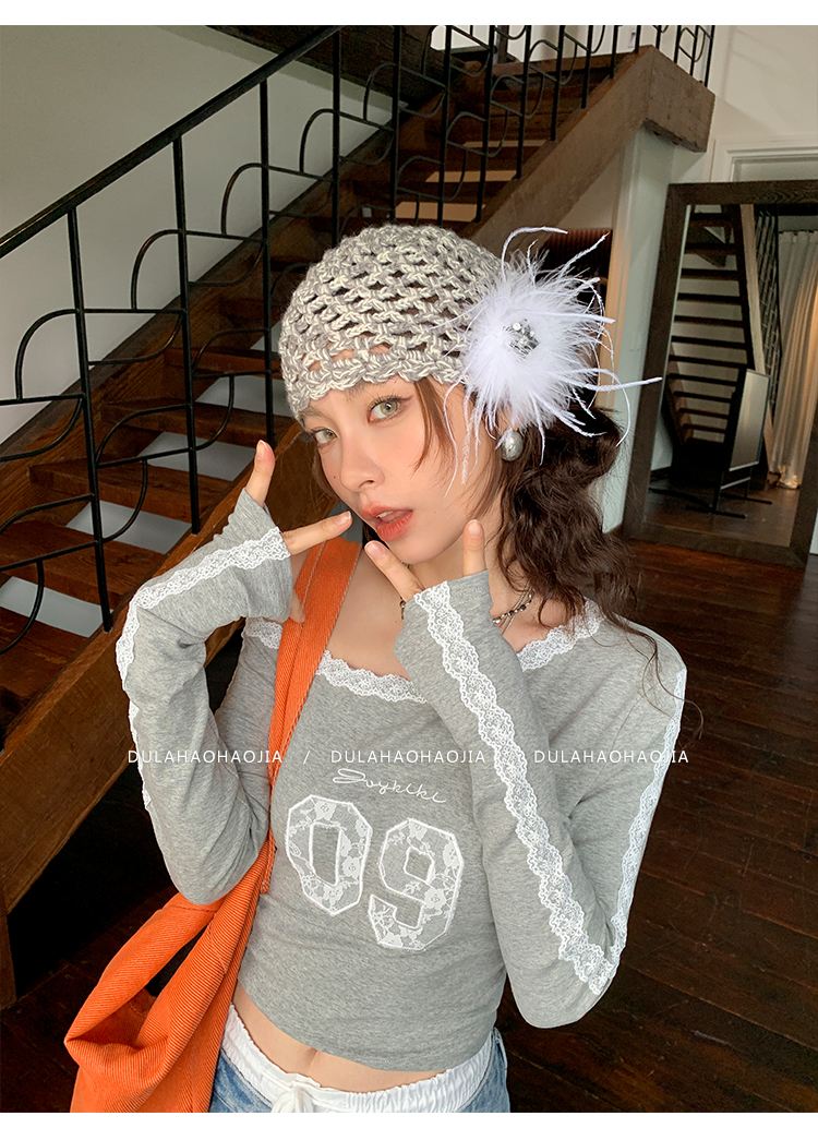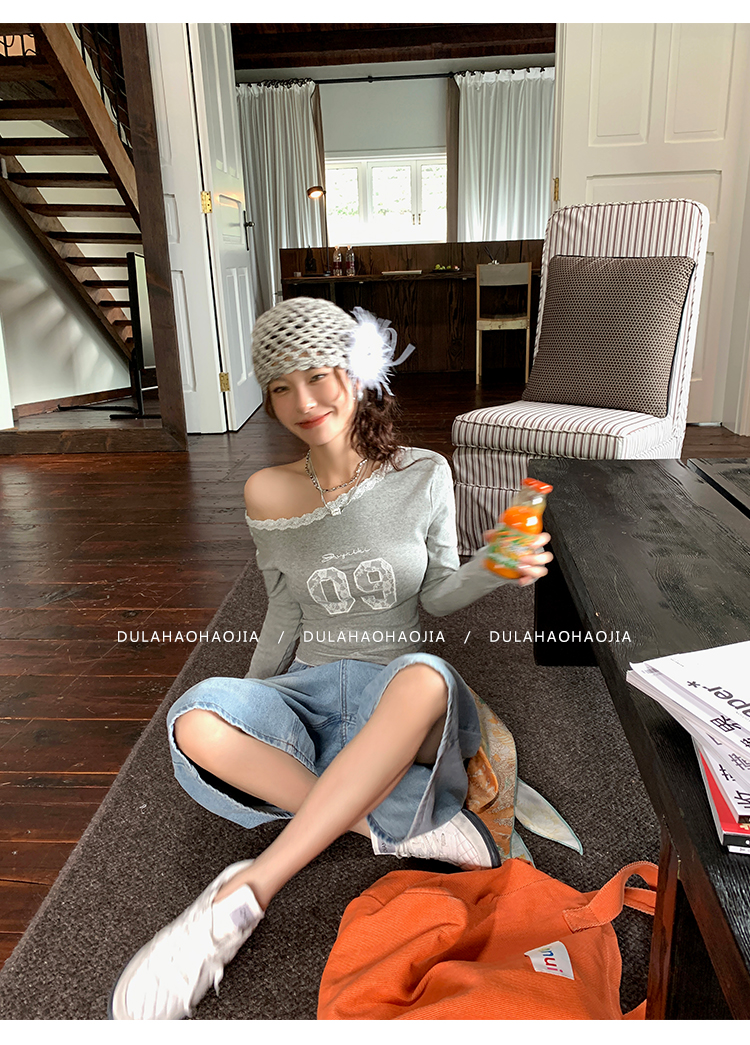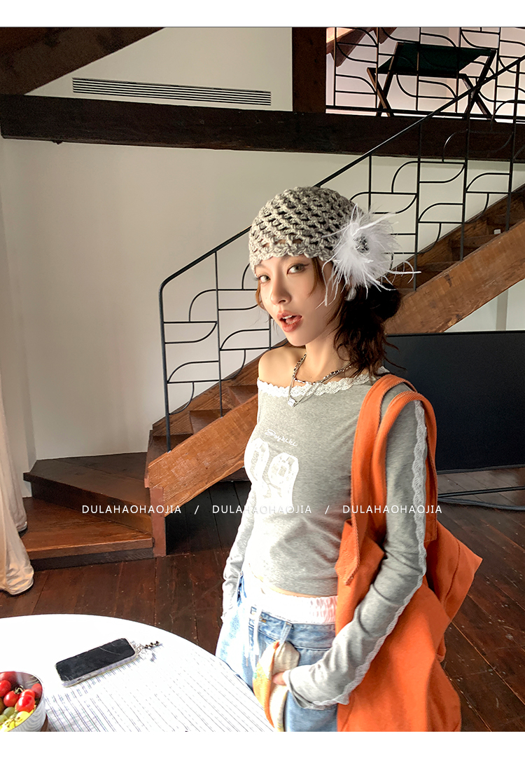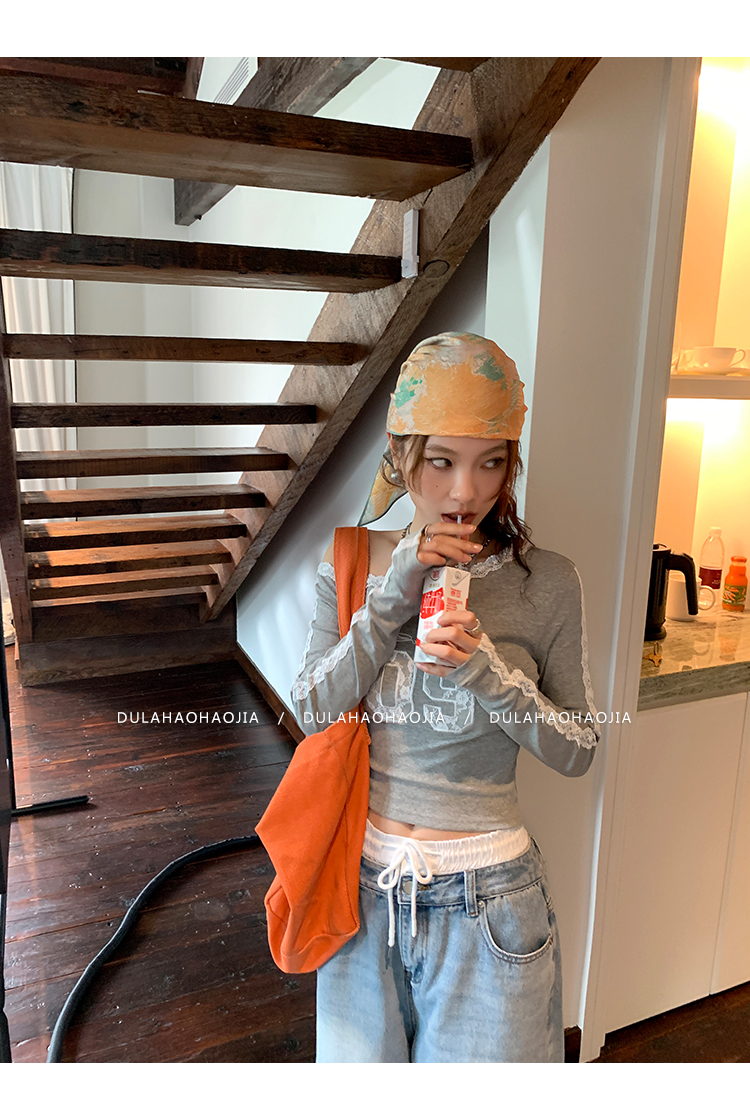 DULA Lace Edge Shoulder-Shaped Long-Sleeve T-Shirt