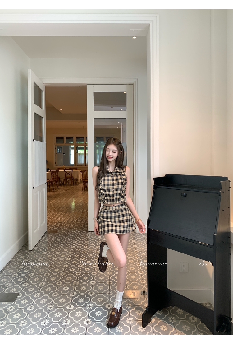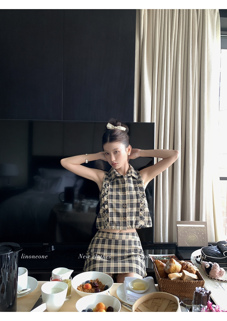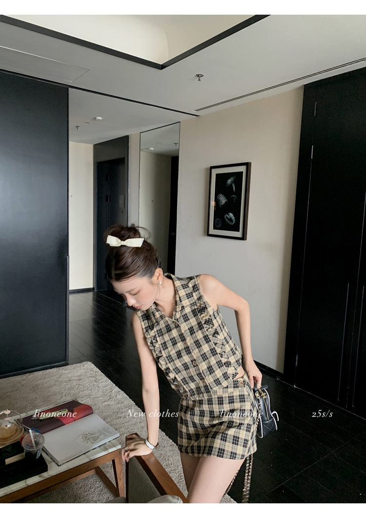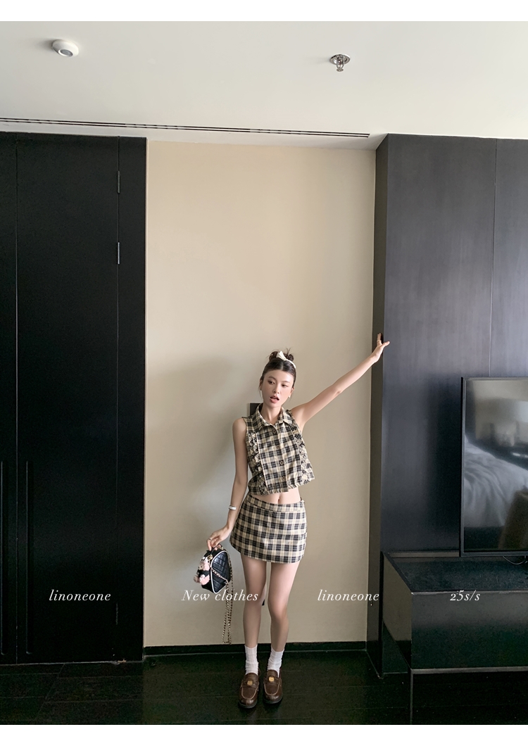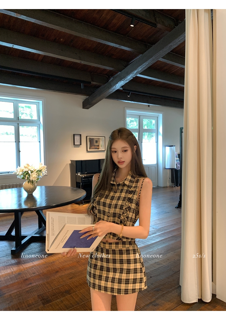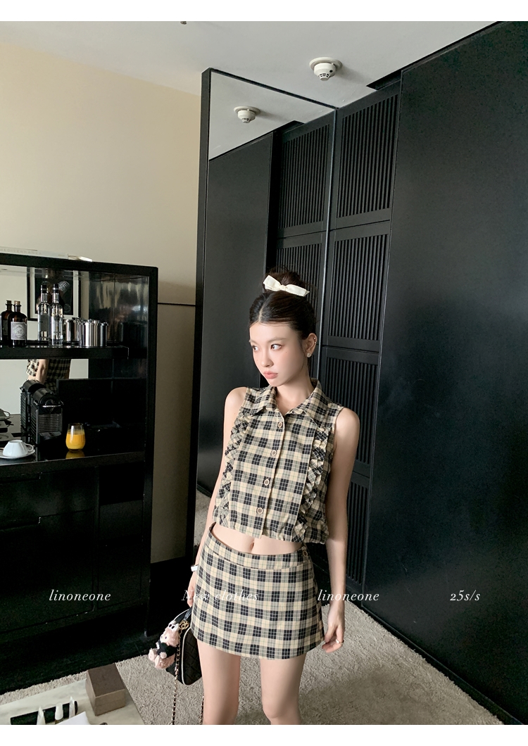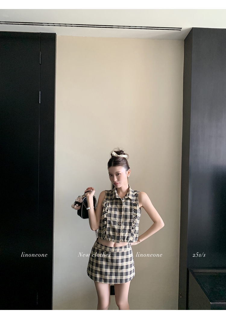 LIN Cocoa Brilliant Brown Plaid Sleeveless Shirt and A-Line Skirt Set