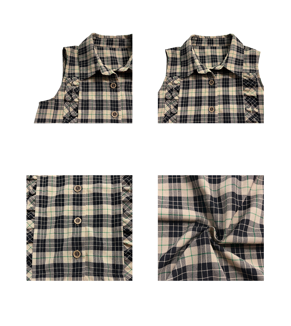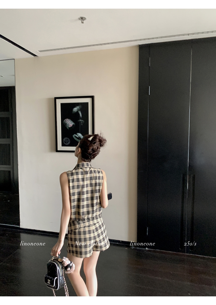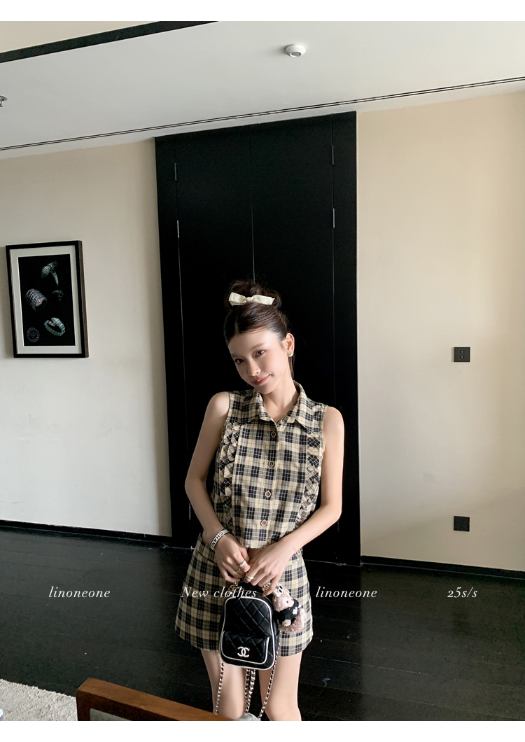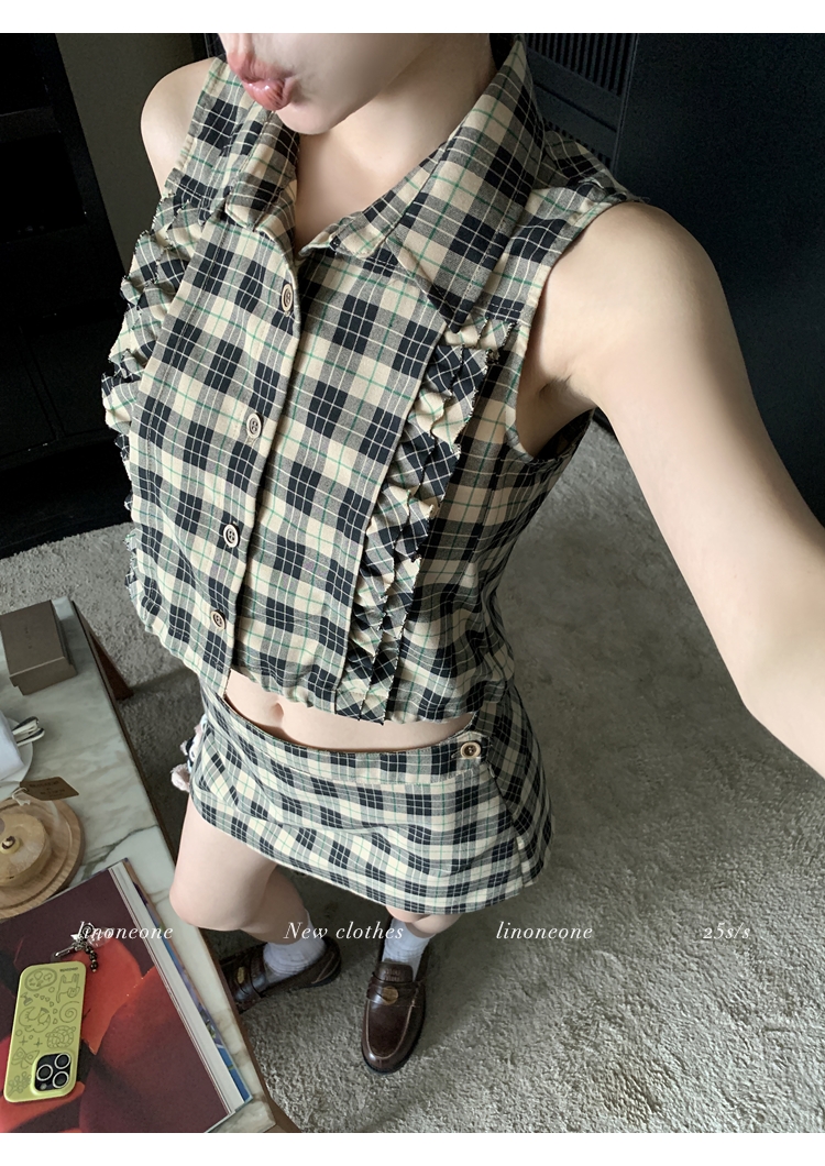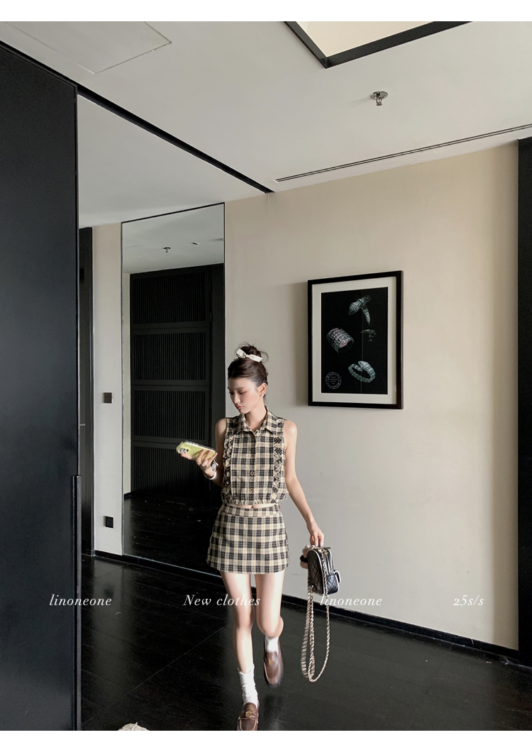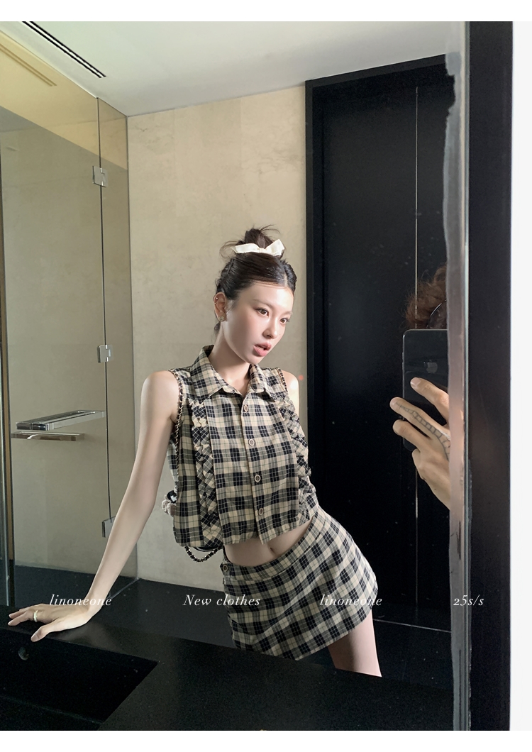 LIN Cocoa Brilliant Brown Plaid Sleeveless Shirt and A-Line Skirt Set