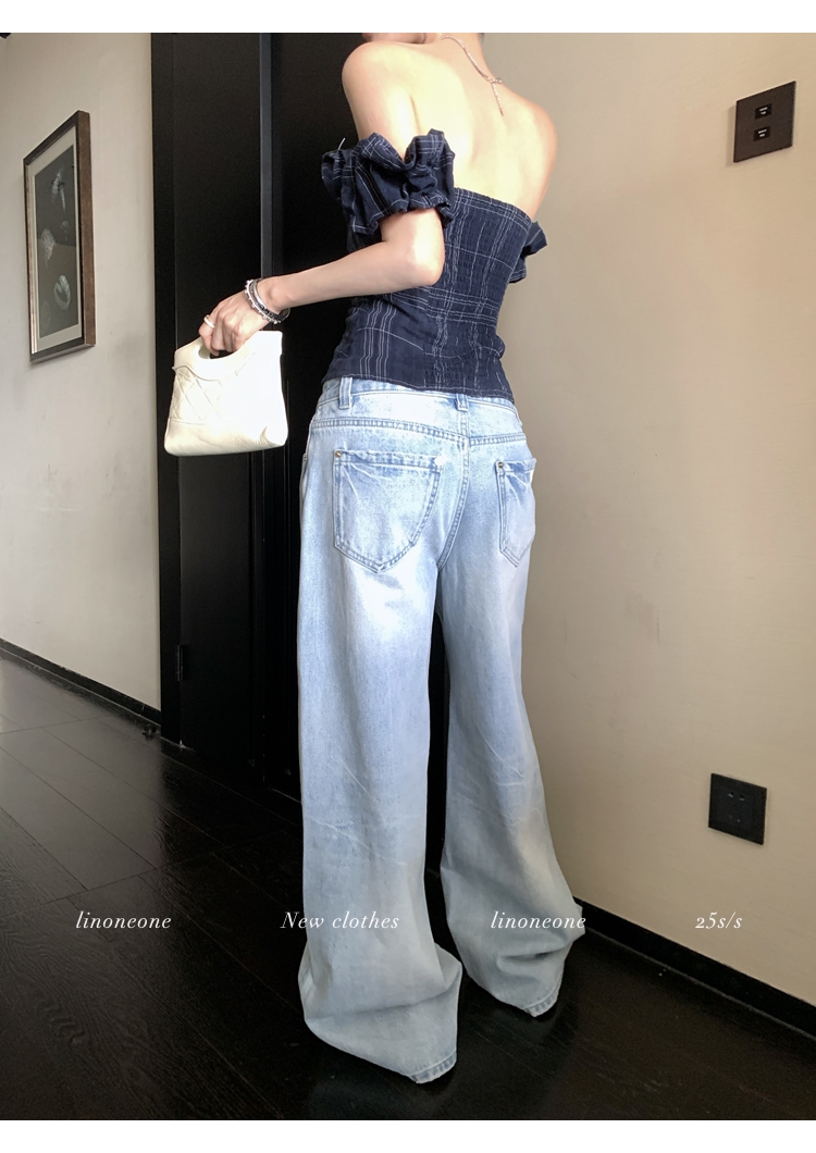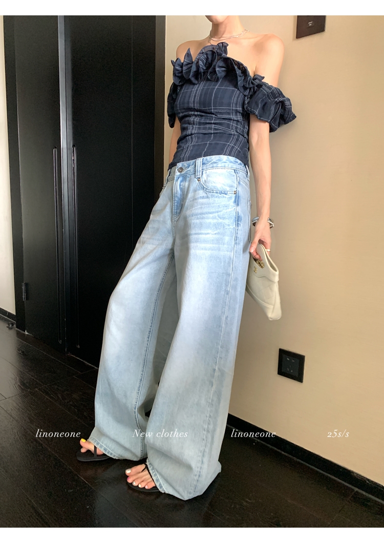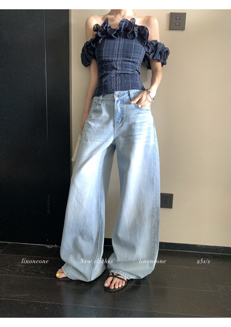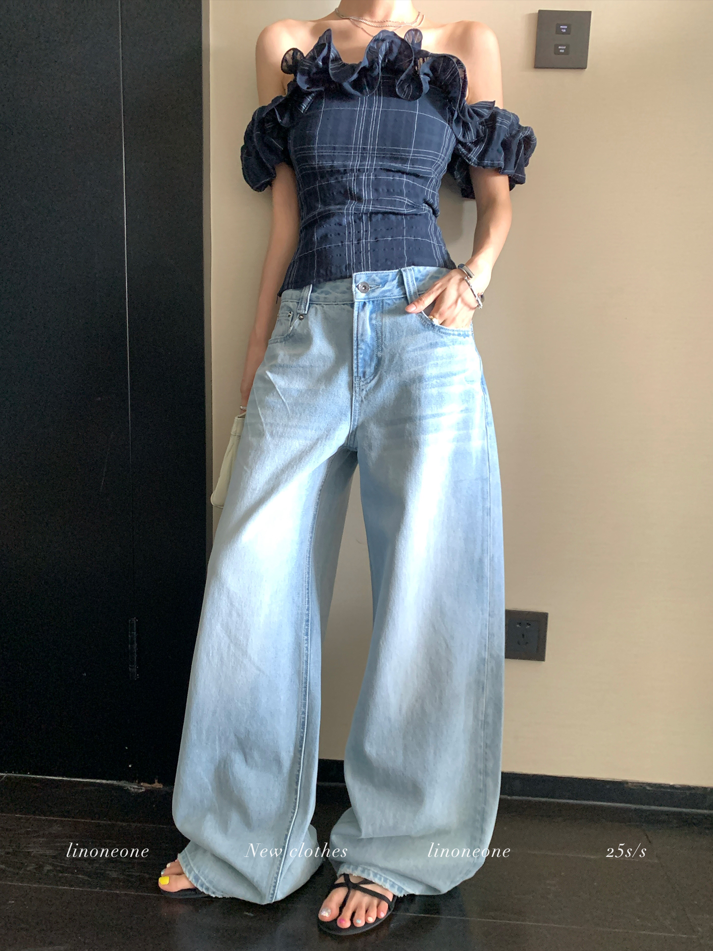 LIN All-match Light Washed Blue Denim Wide-leg Pants