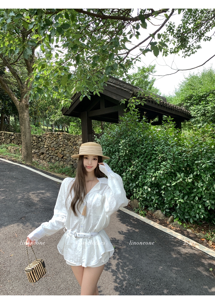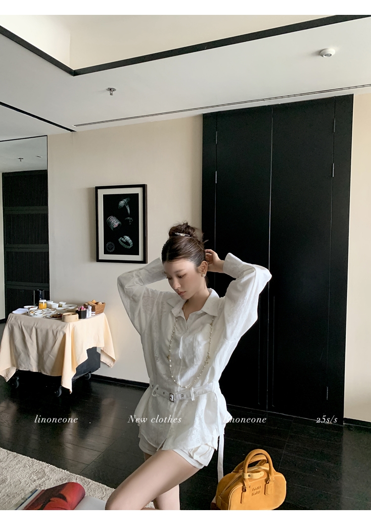 LIN Cool White Thin Pattern Lace-up Long-sleeved Shirt
