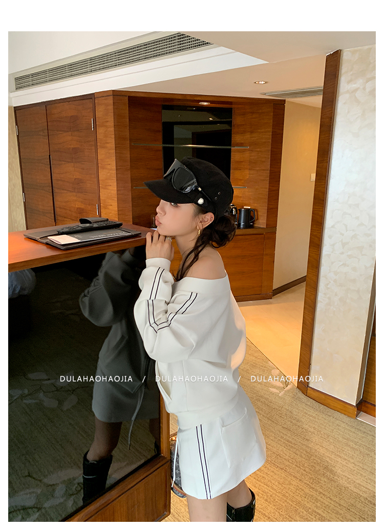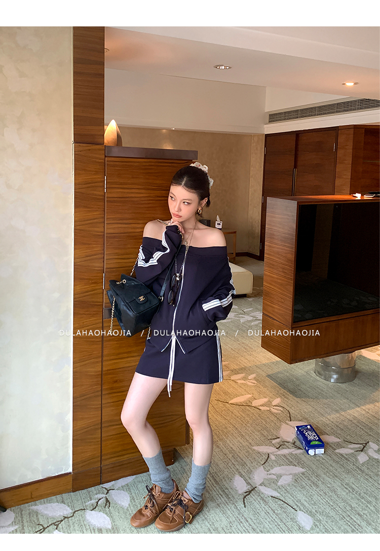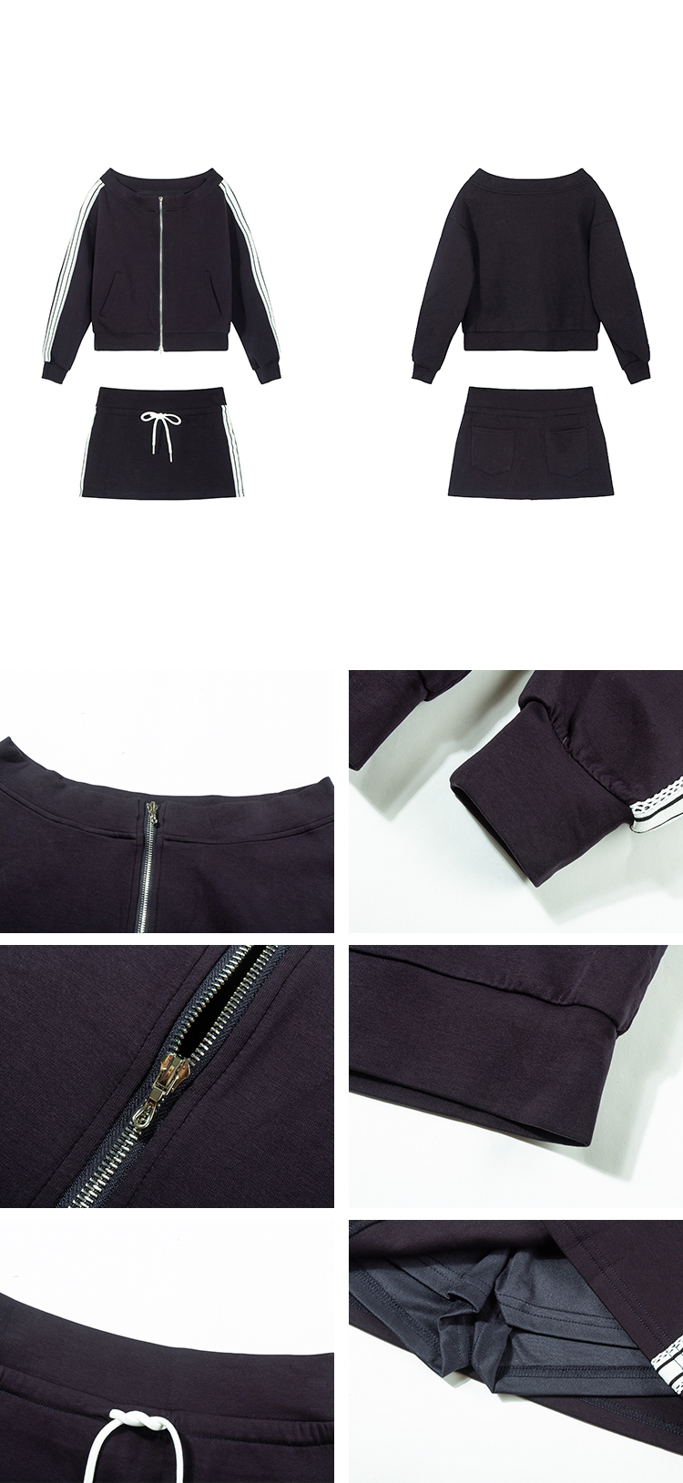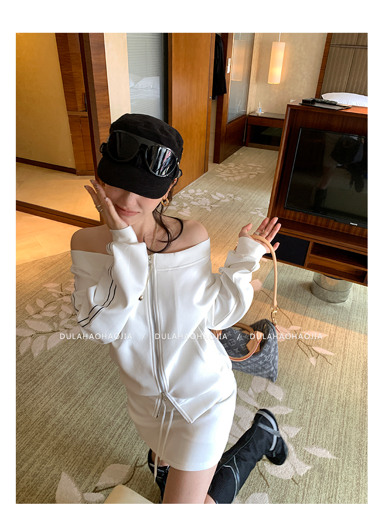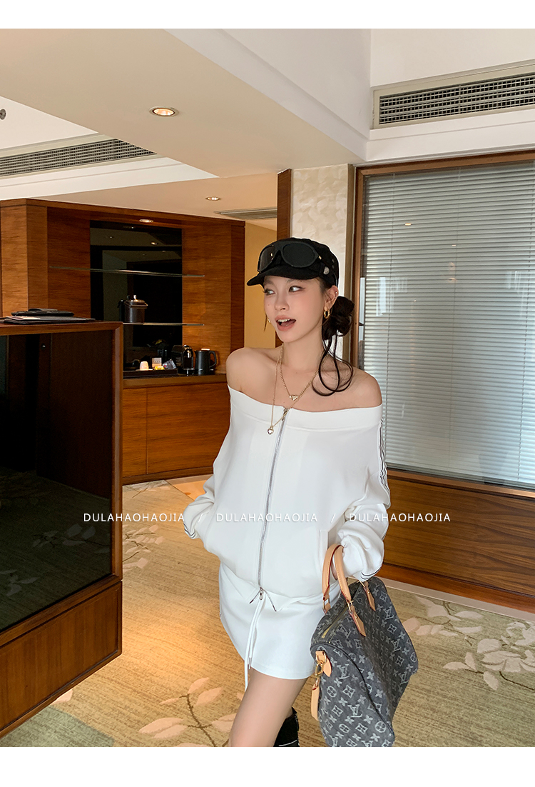 DULA Lazy Weekend One-shoulder zip-up sweatshirt + short skirt set