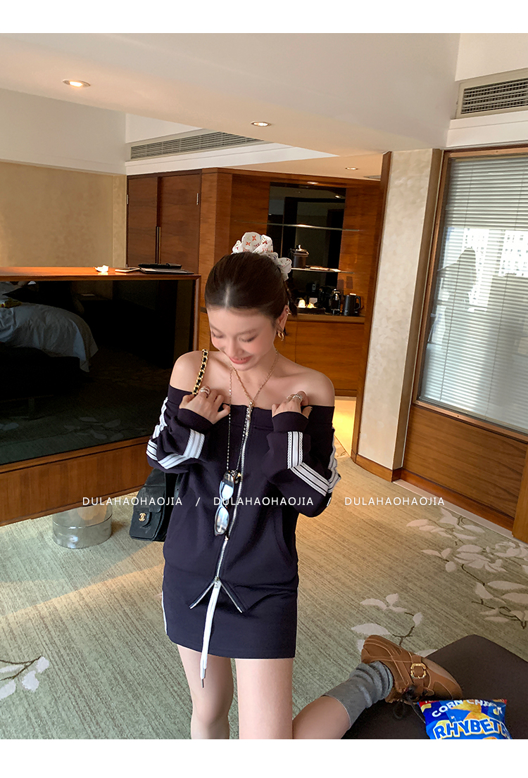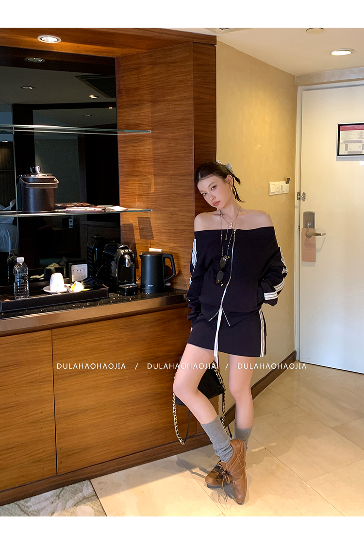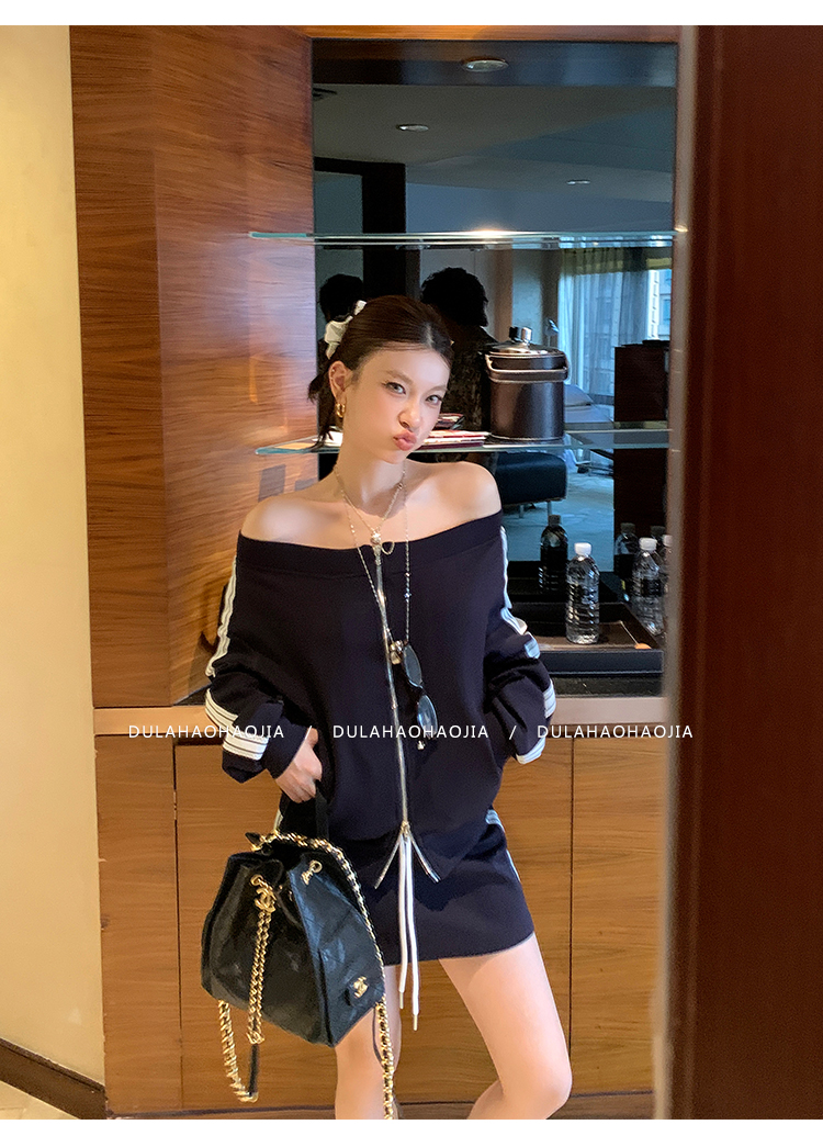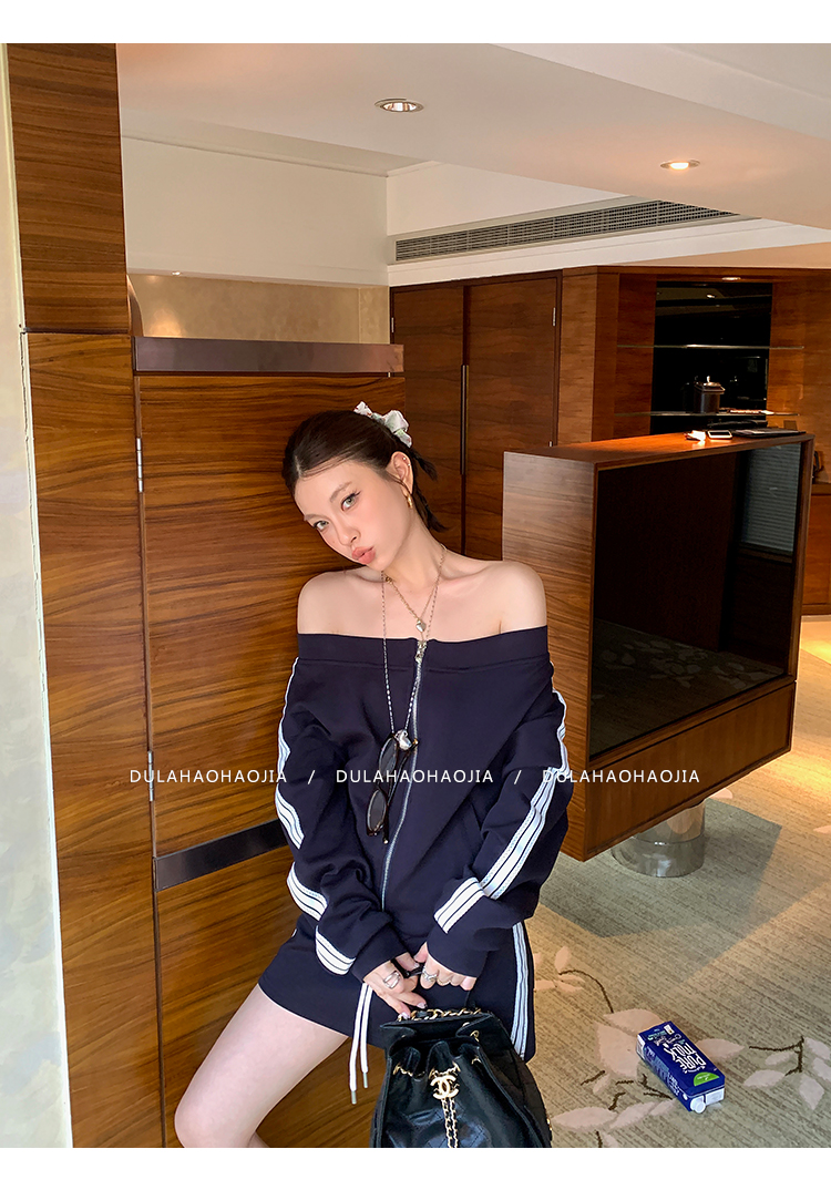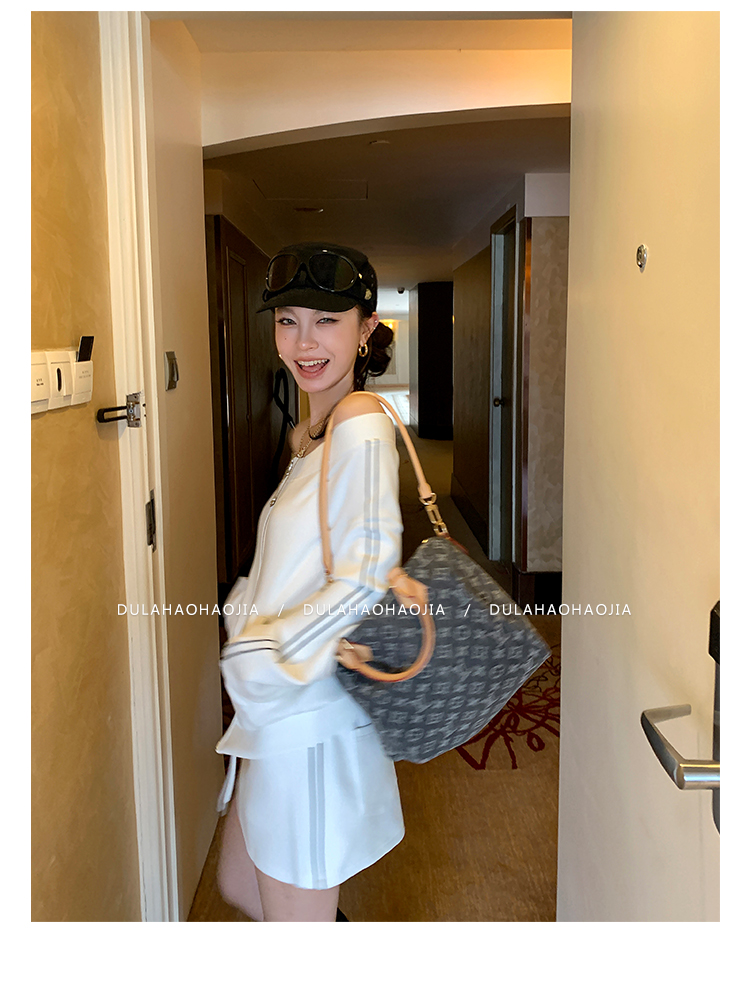 DULA Lazy Weekend One-shoulder zip-up sweatshirt + short skirt set