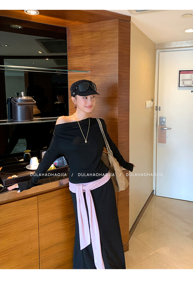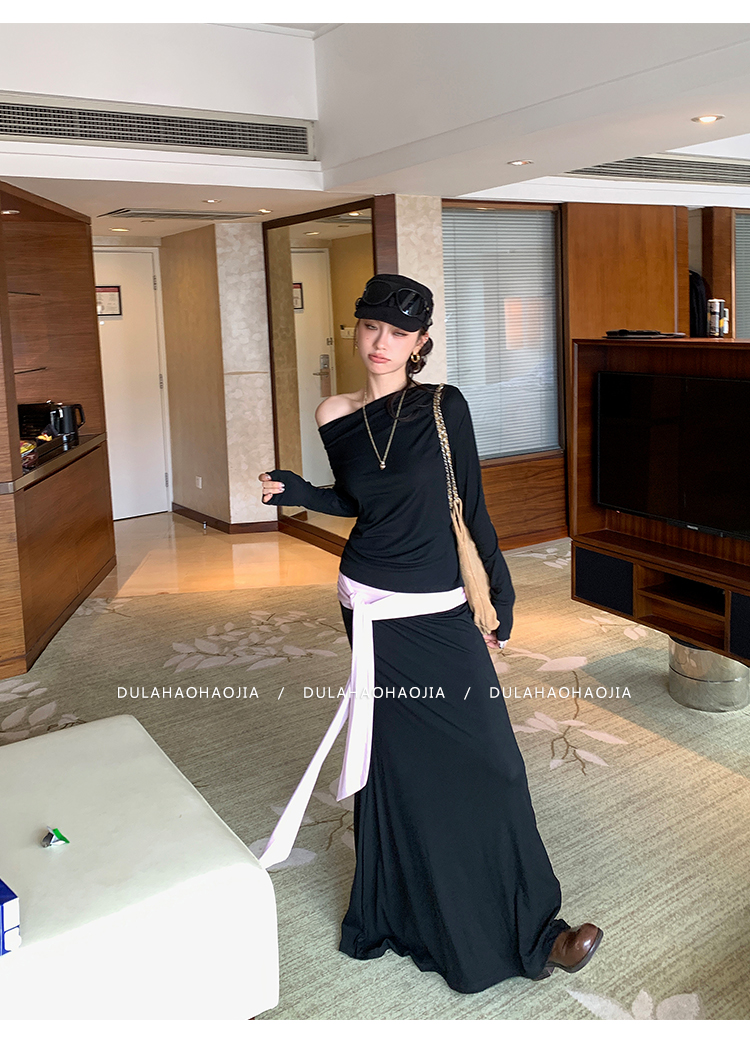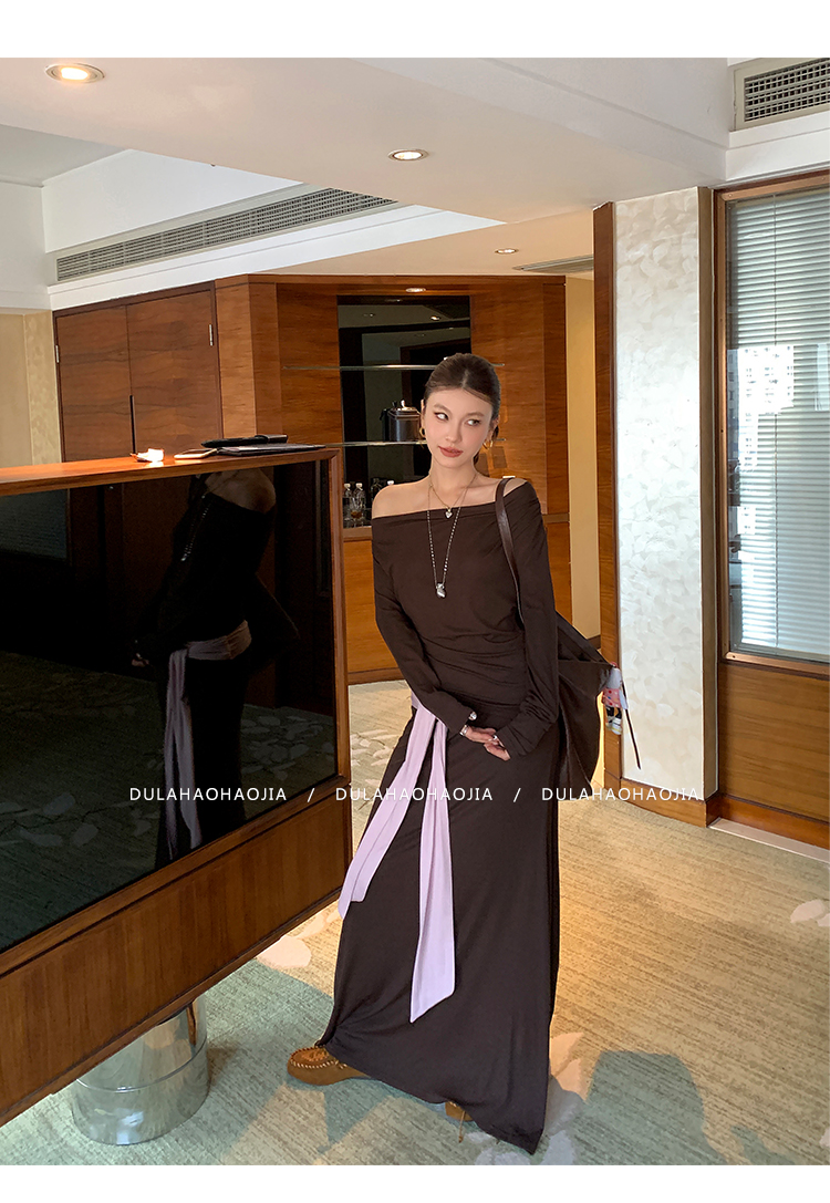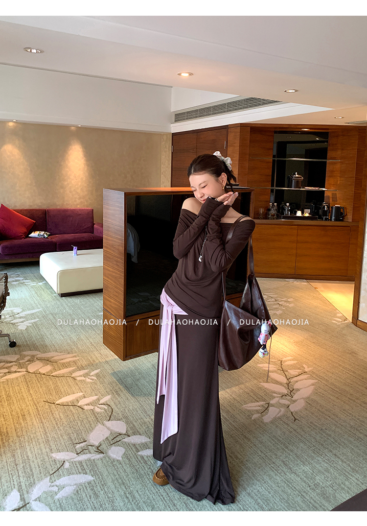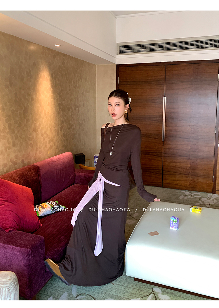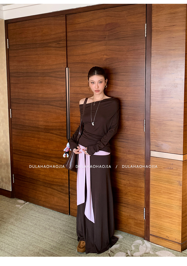 DULA Off-shoulder T-shirt + Colorblock Long Skirt Set