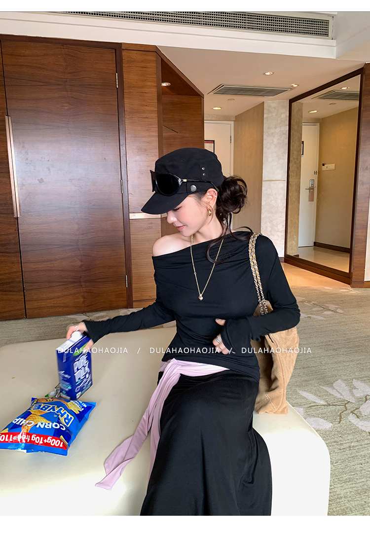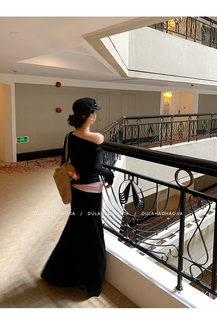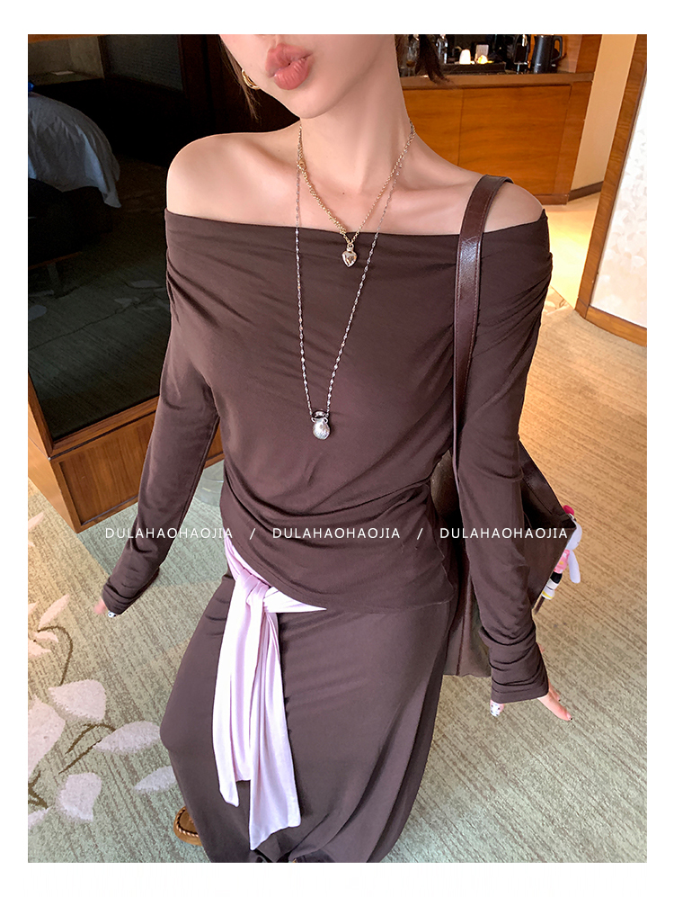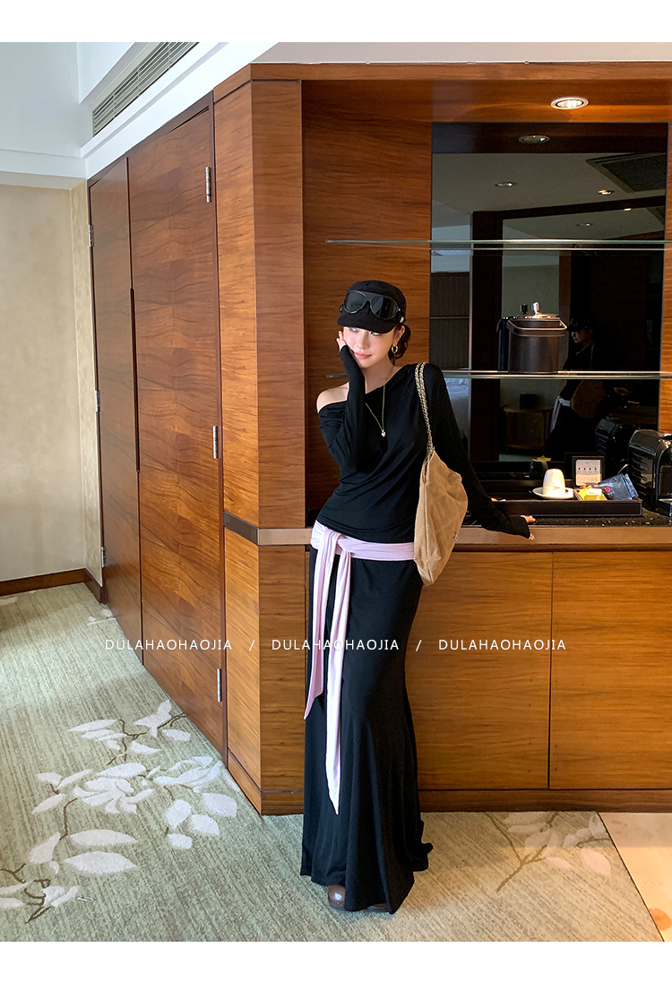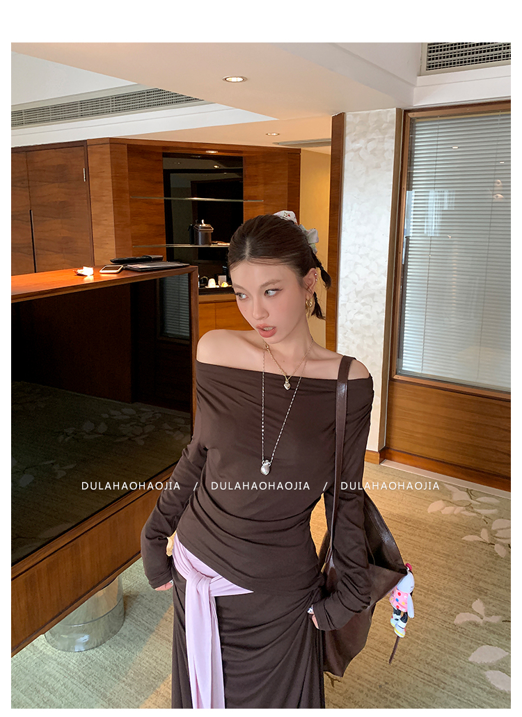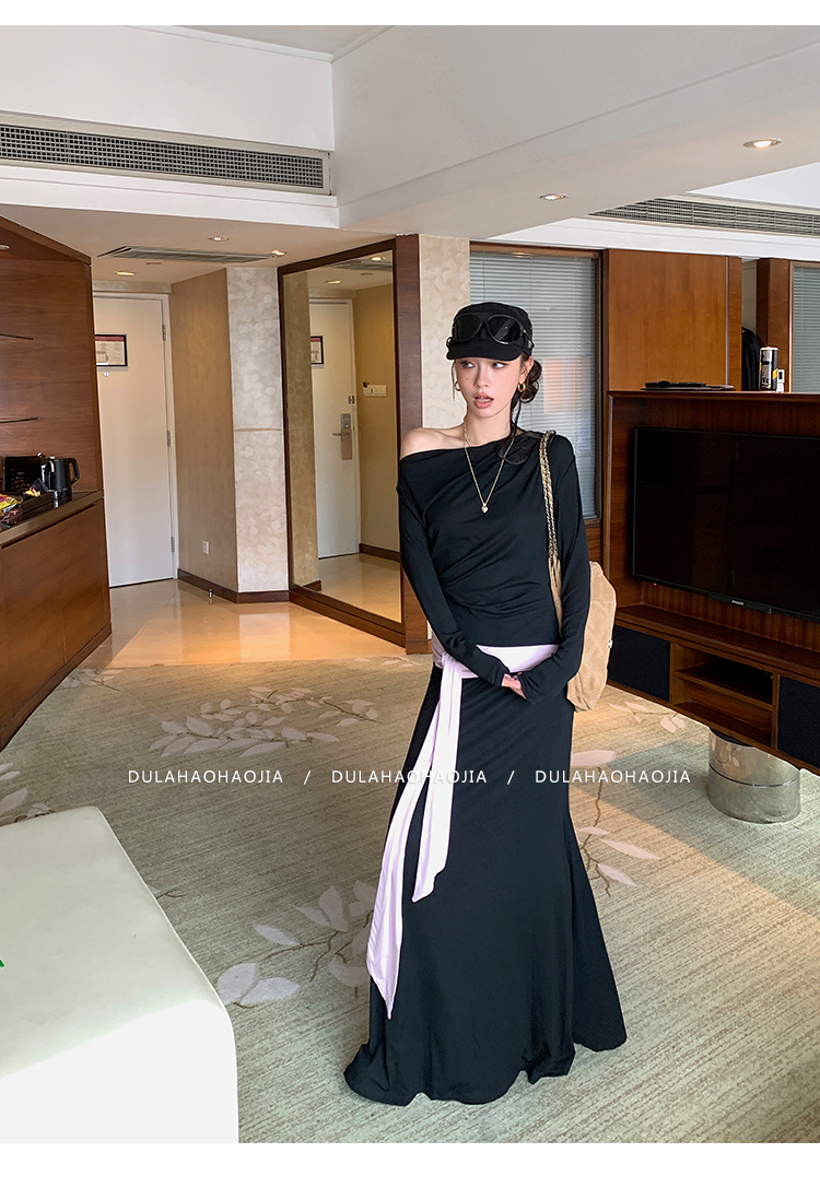 DULA Off-shoulder T-shirt + Colorblock Long Skirt Set