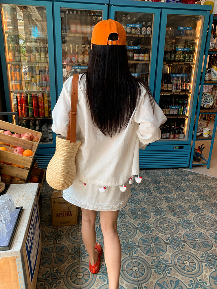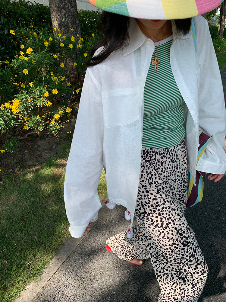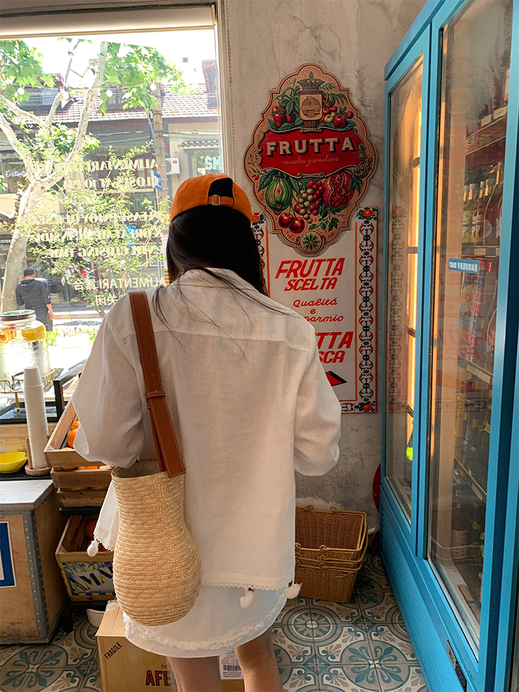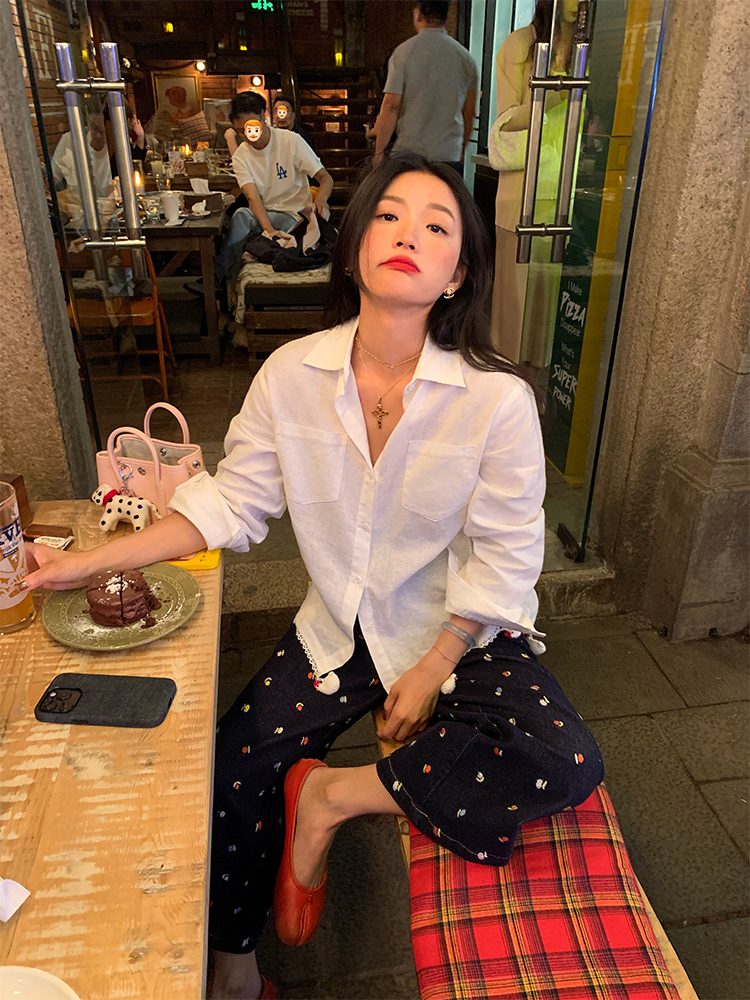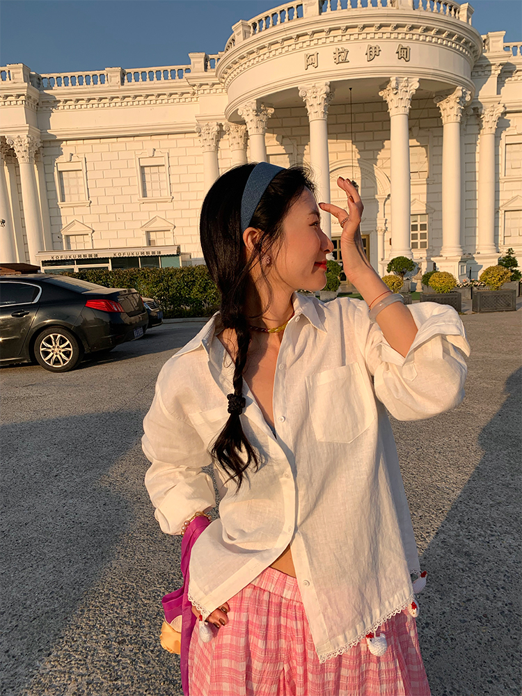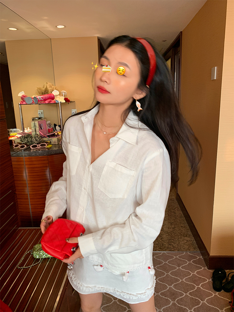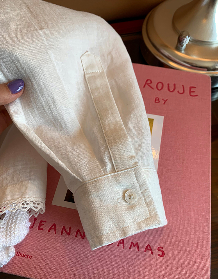 LUO handmade decoration white long-sleeved linen shirt