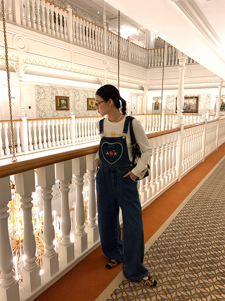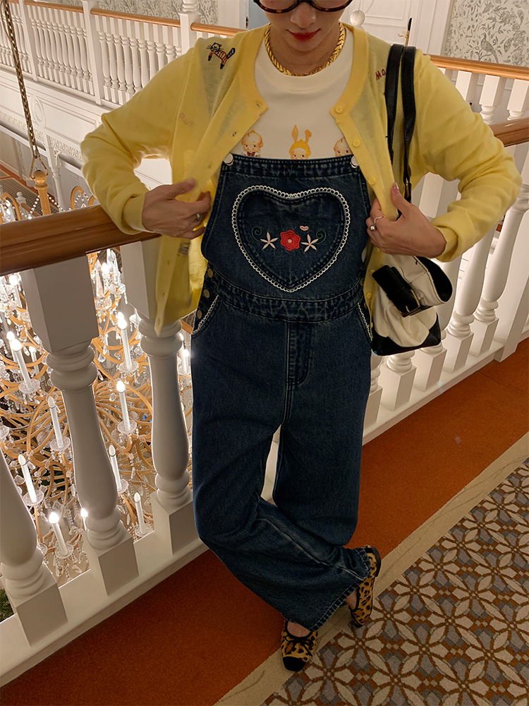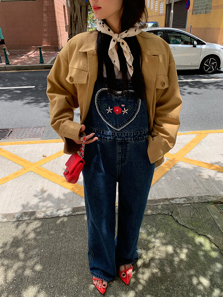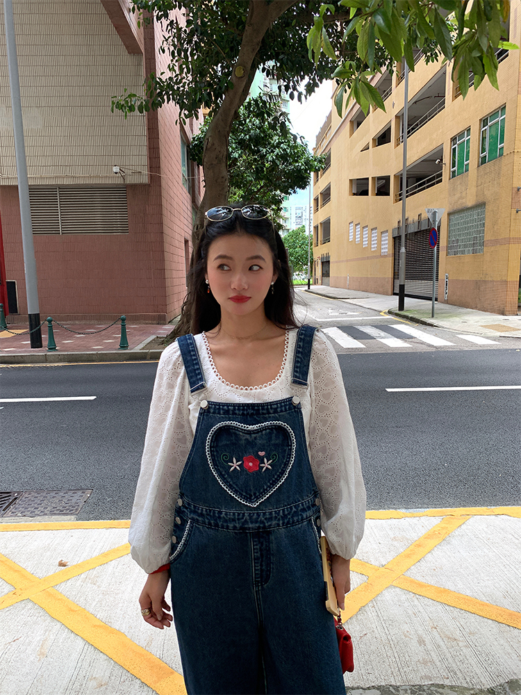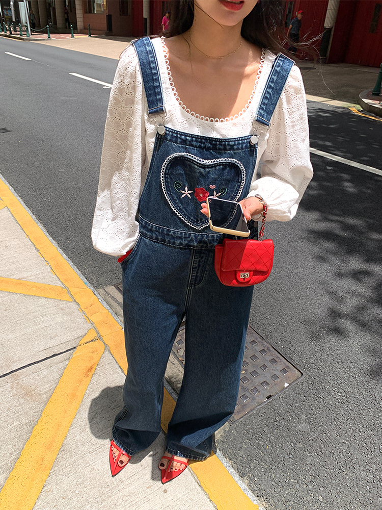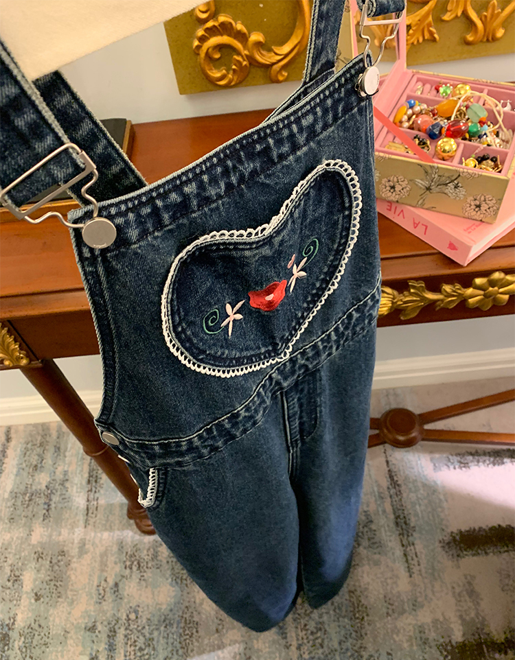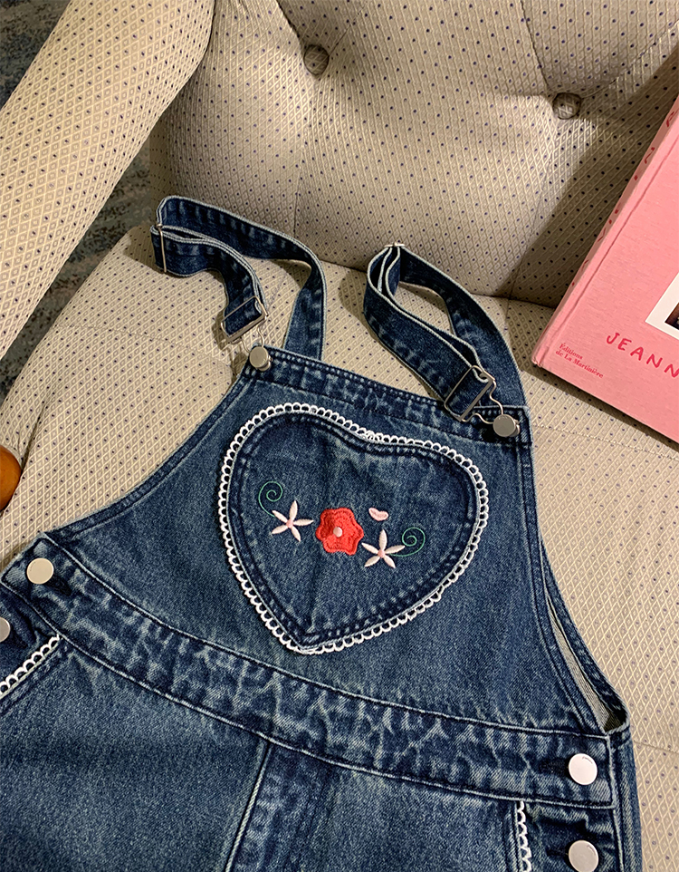 LUO patch pockets with embroidered lace denim overalls