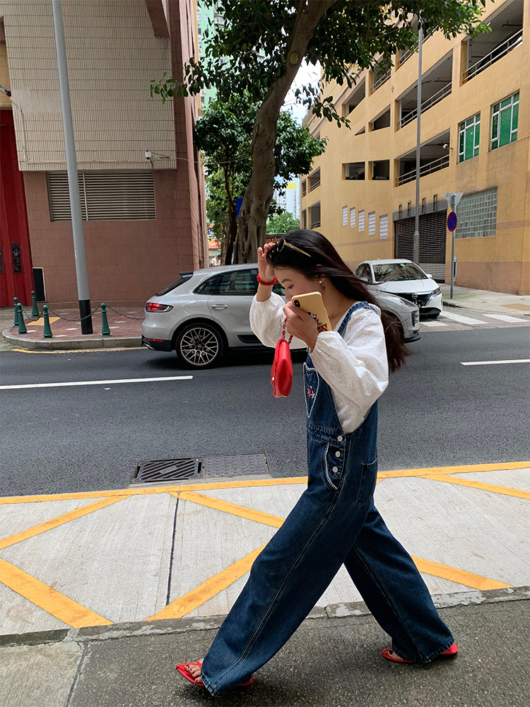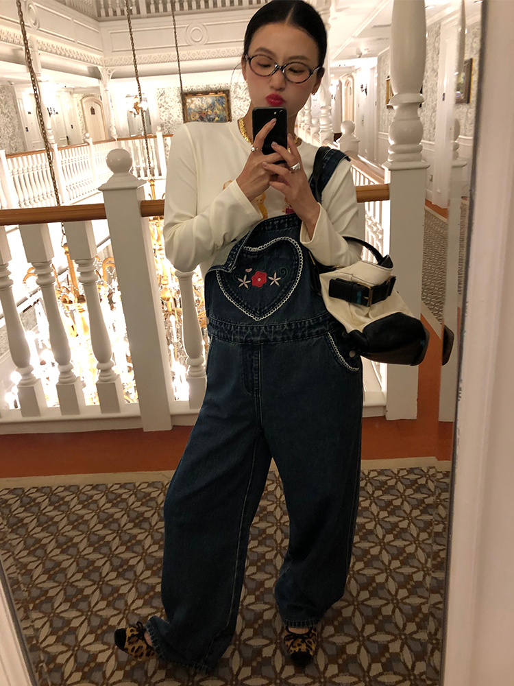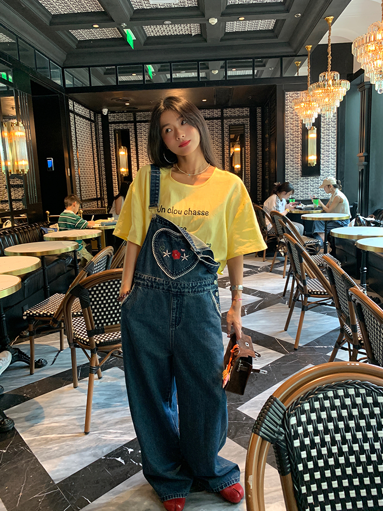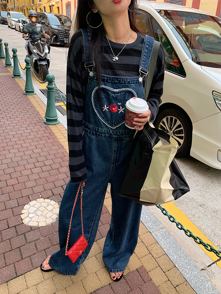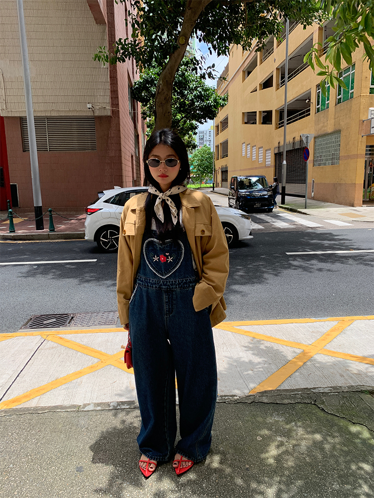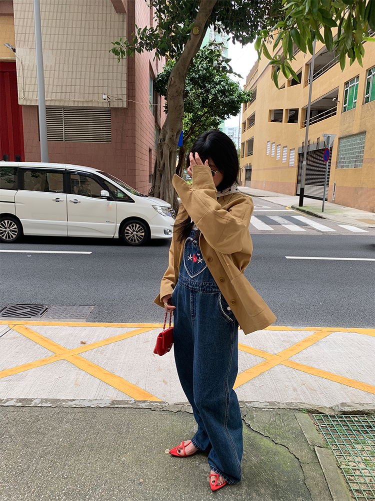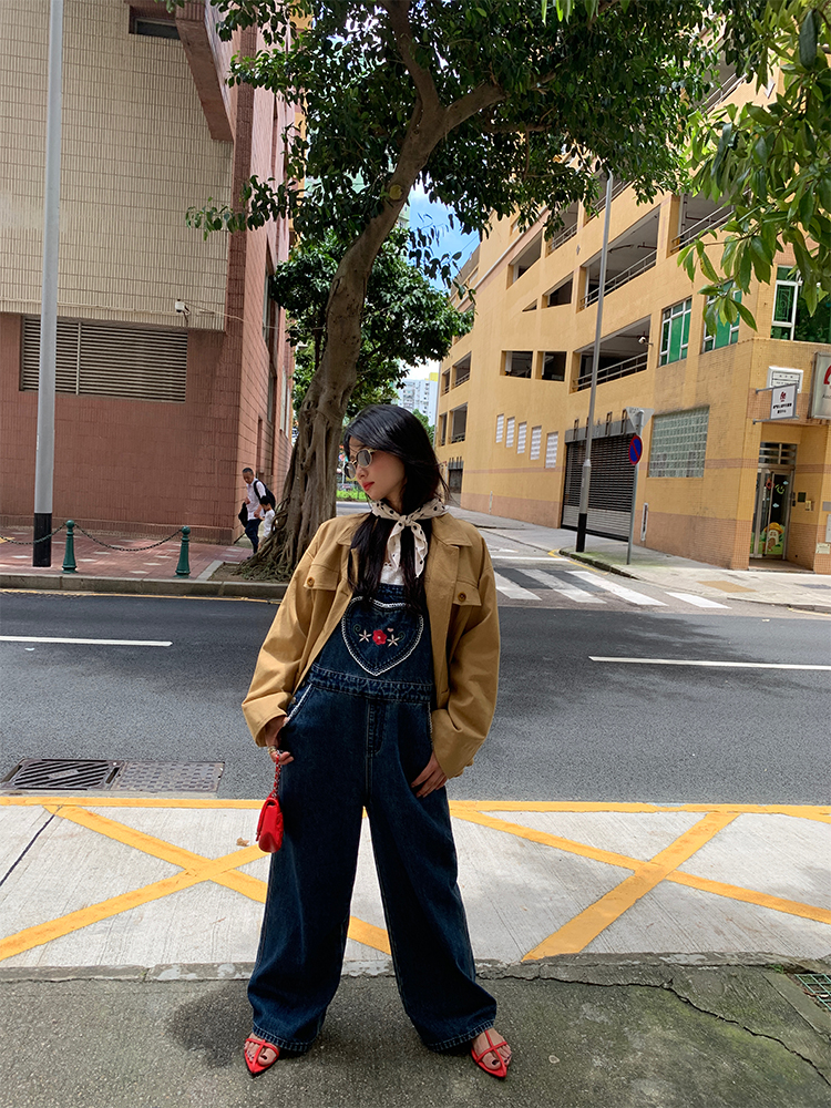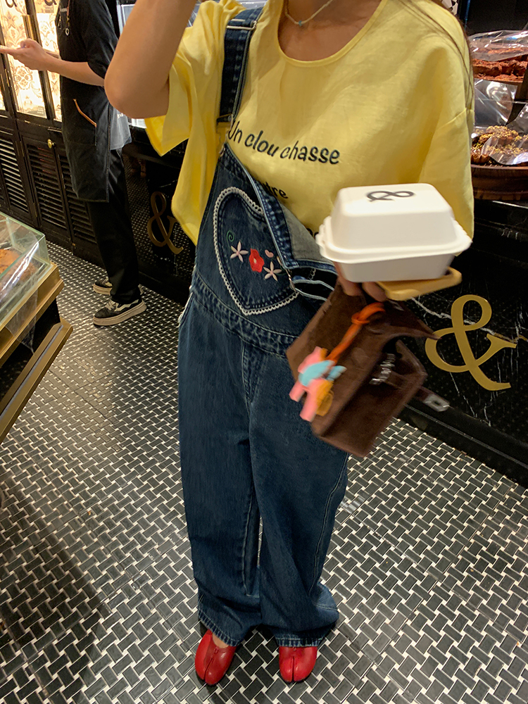 LUO patch pockets with embroidered lace denim overalls