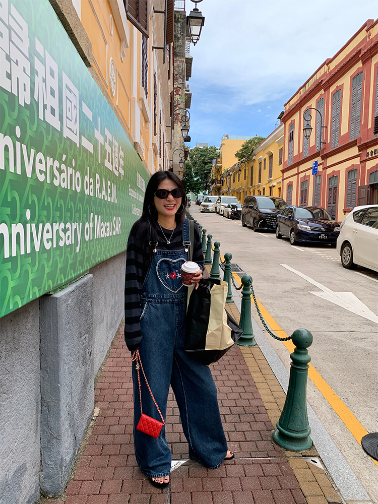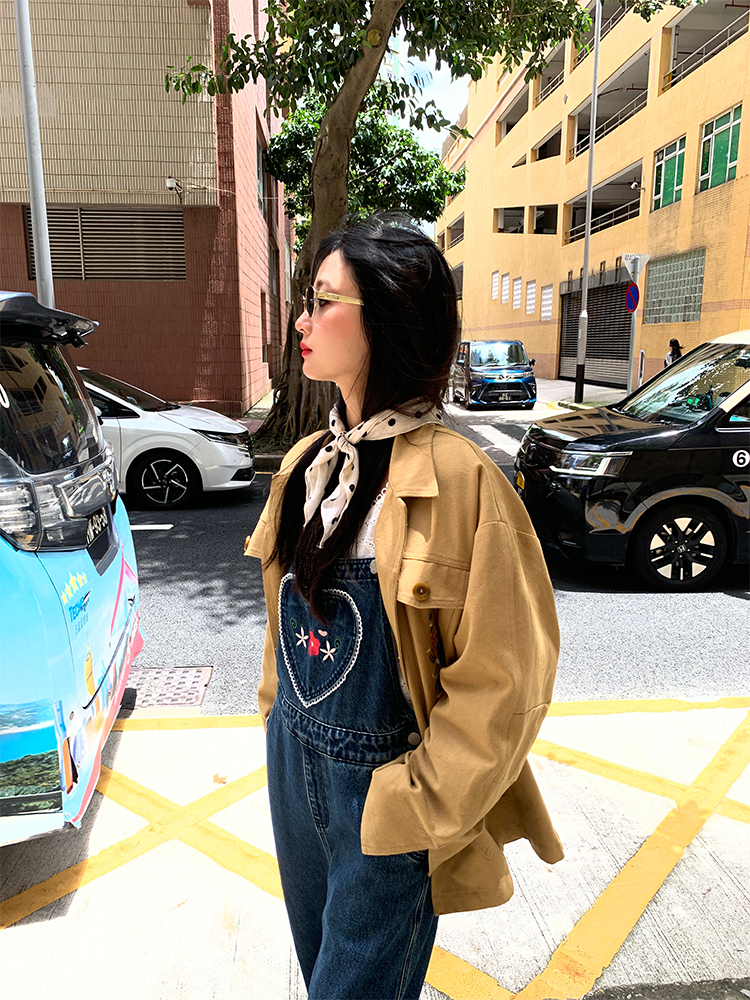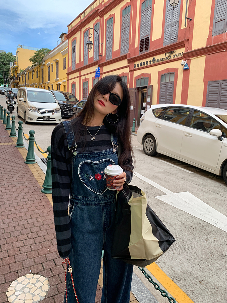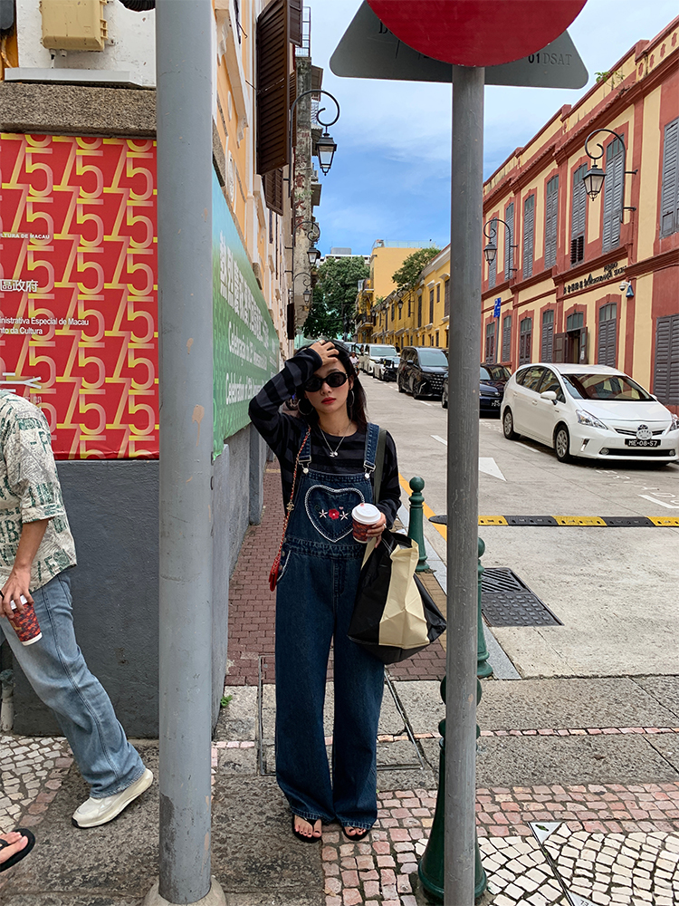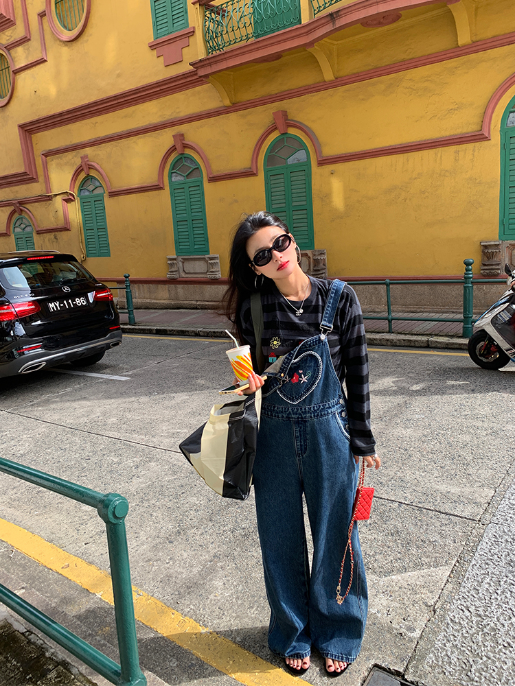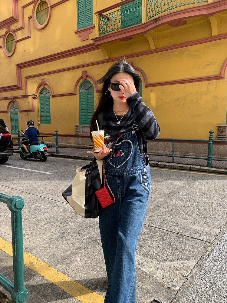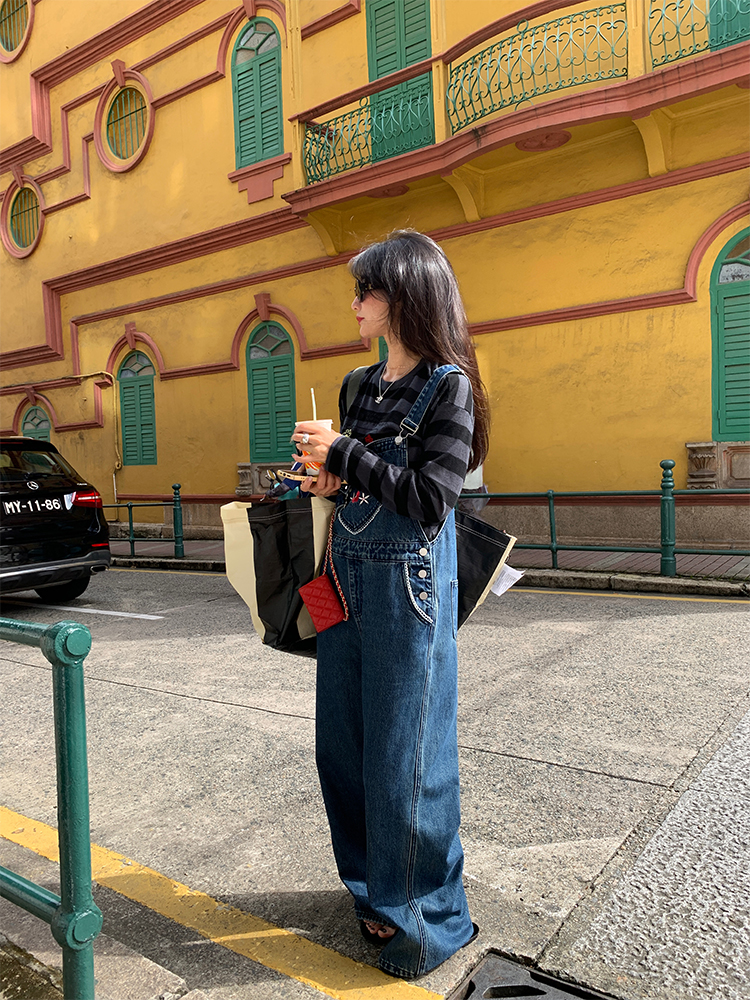 LUO patch pockets with embroidered lace denim overalls