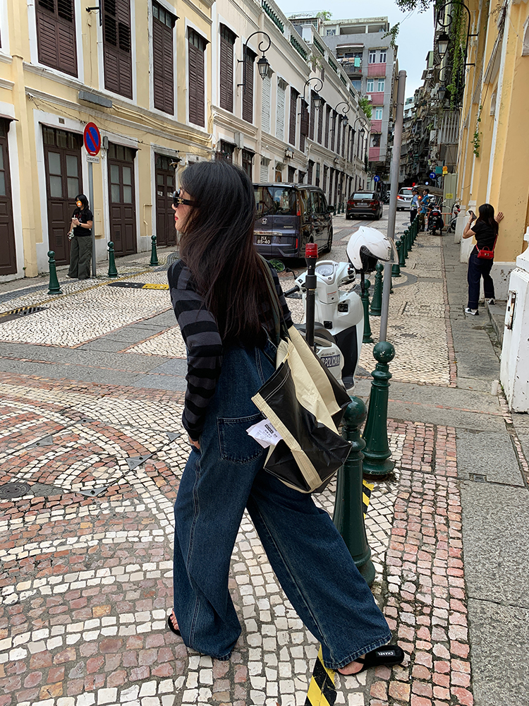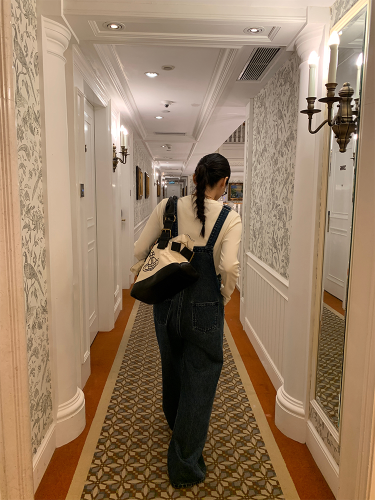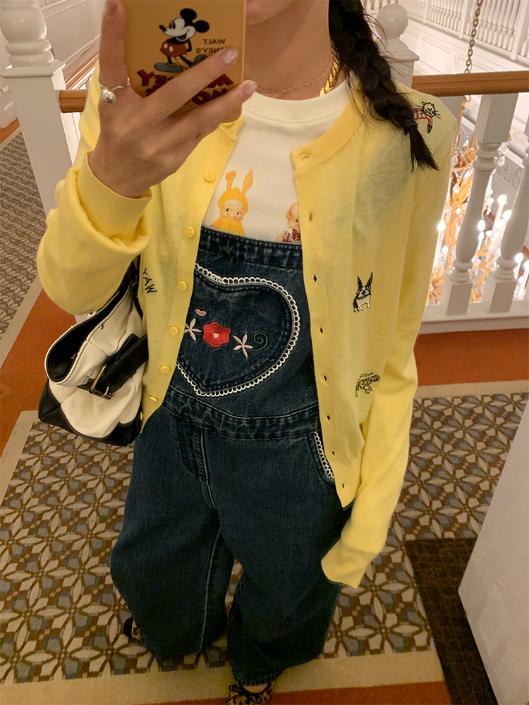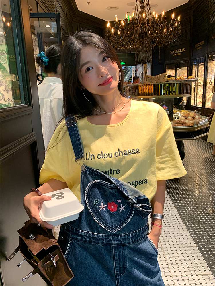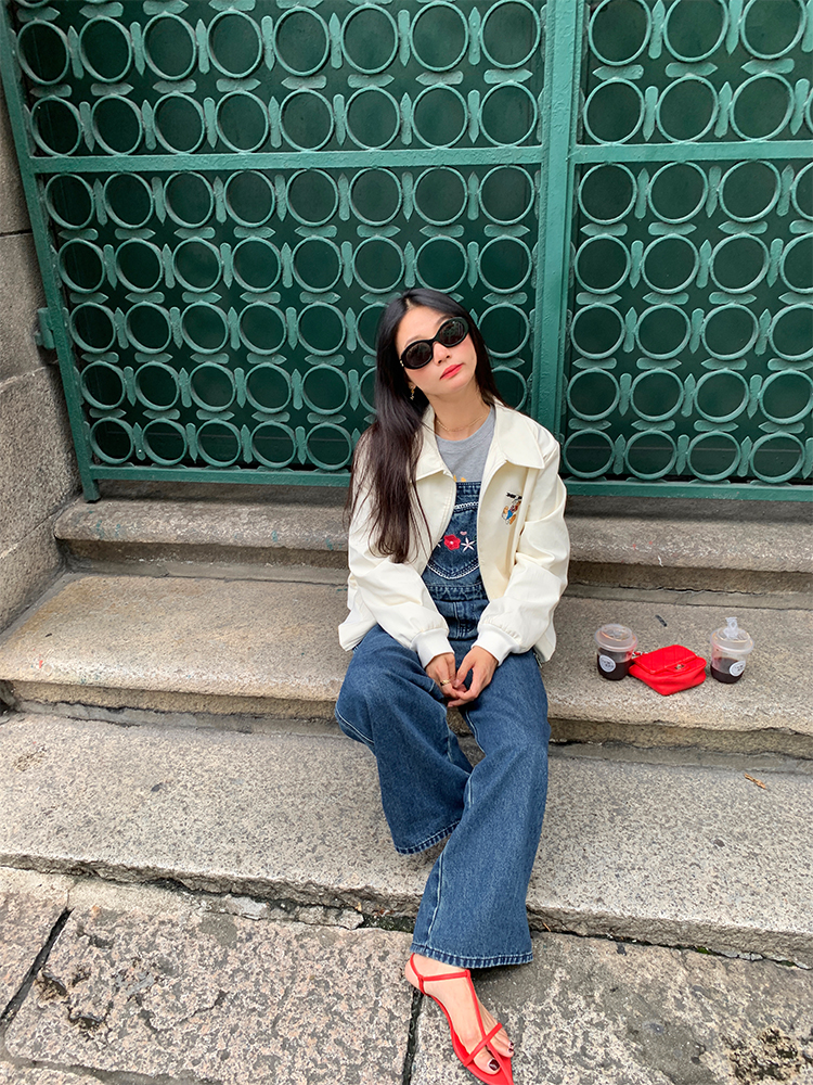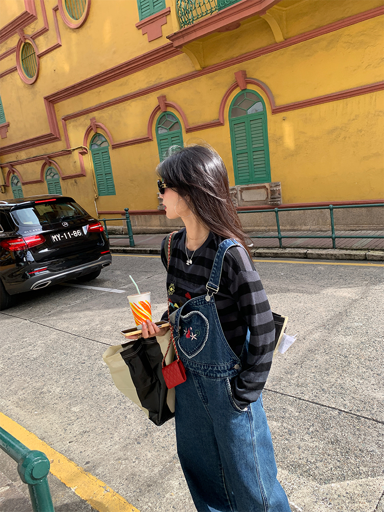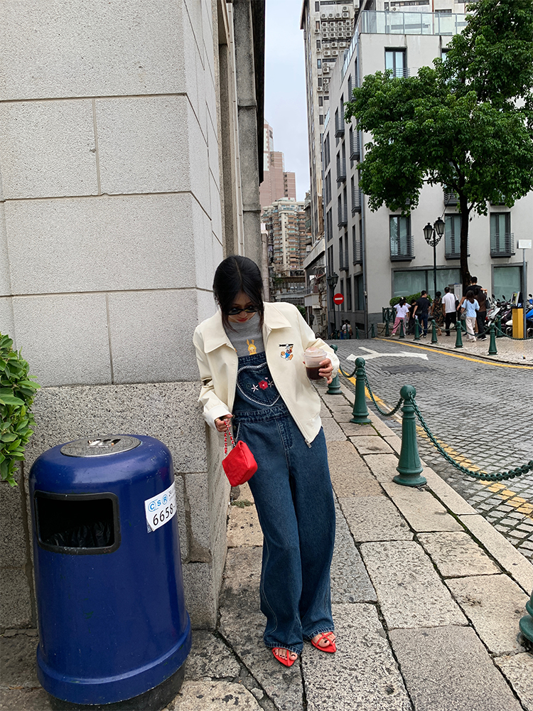 LUO patch pockets with embroidered lace denim overalls