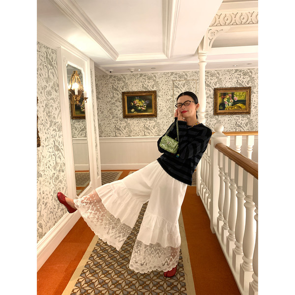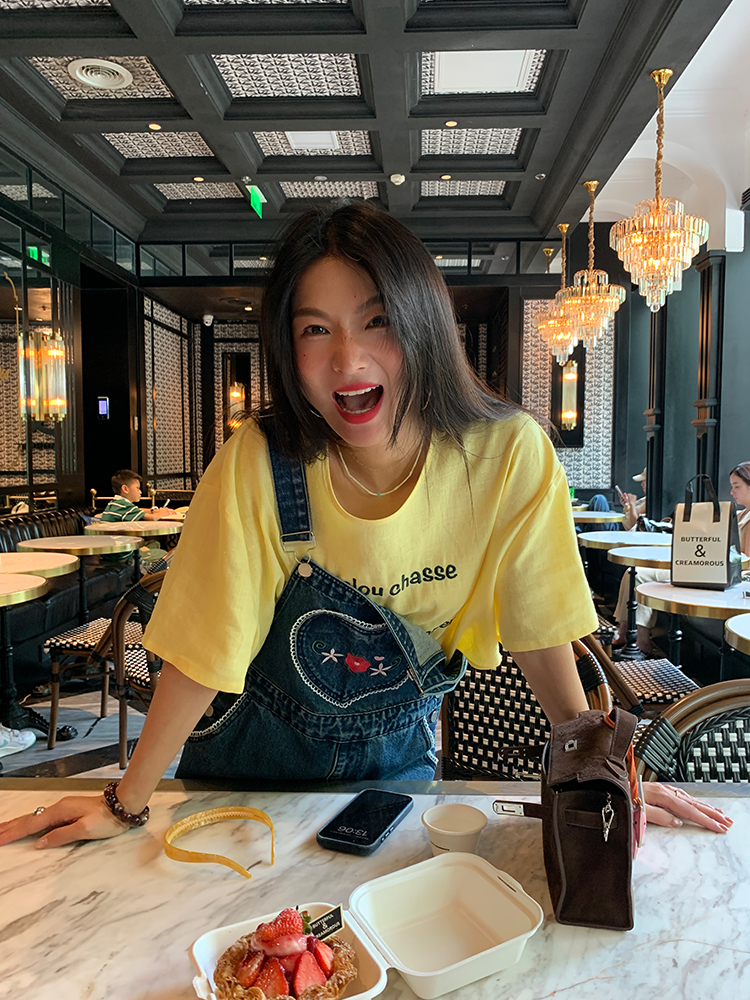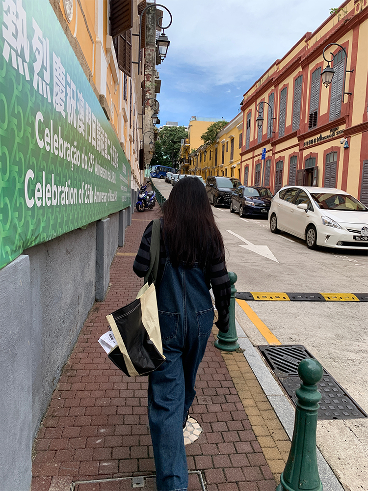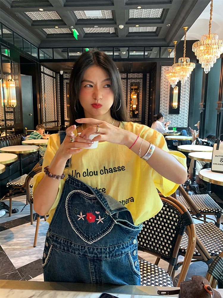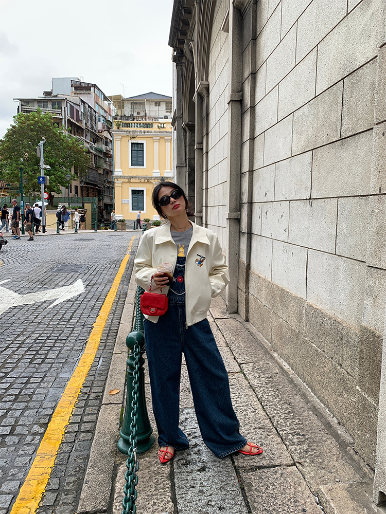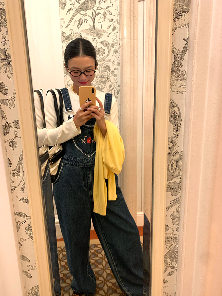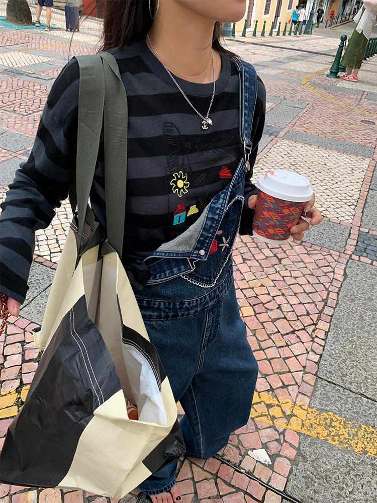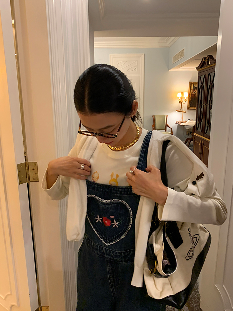 LUO patch pockets with embroidered lace denim overalls