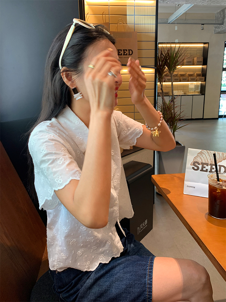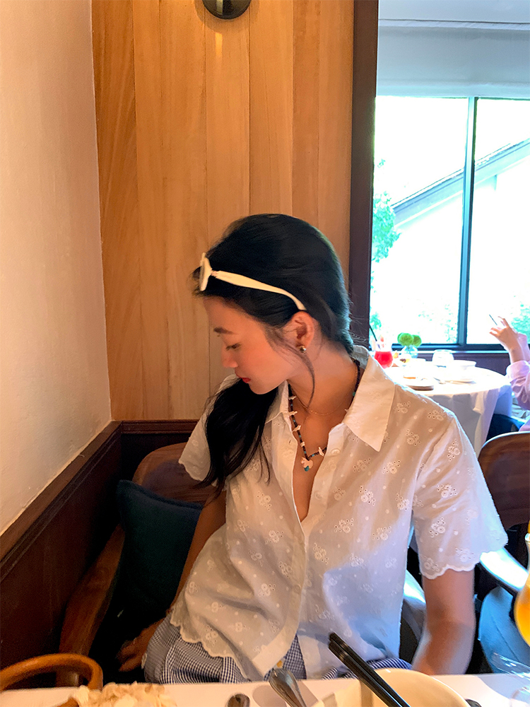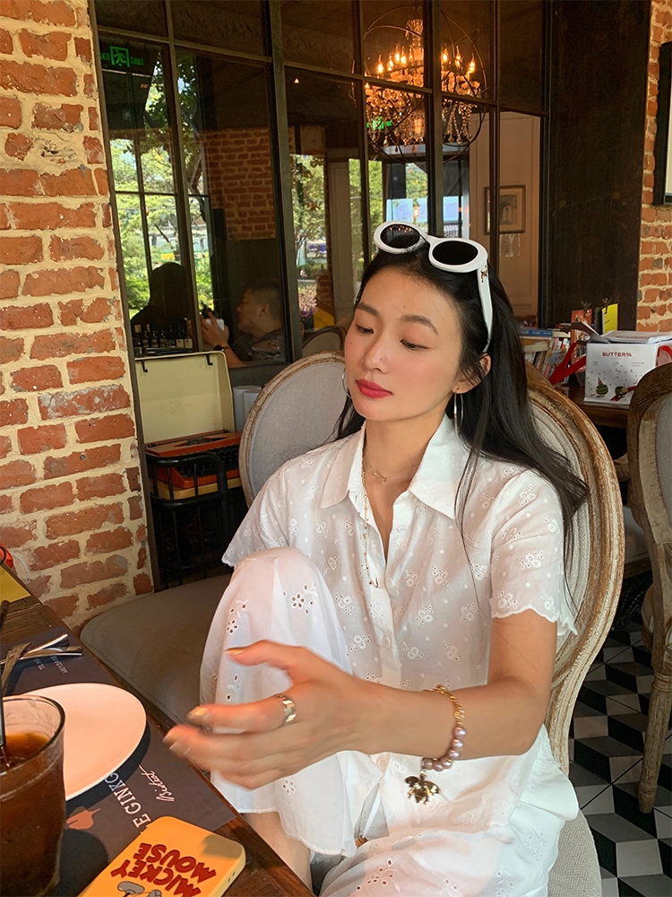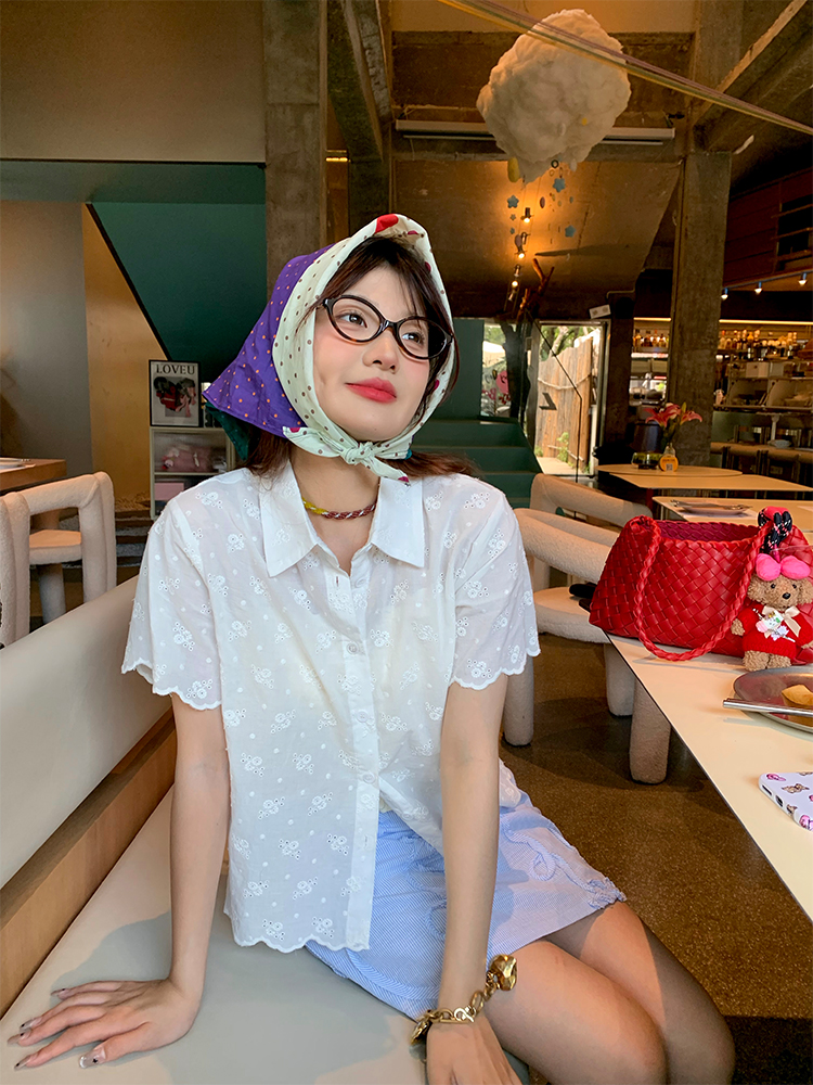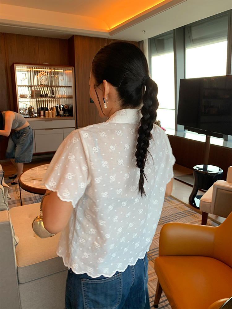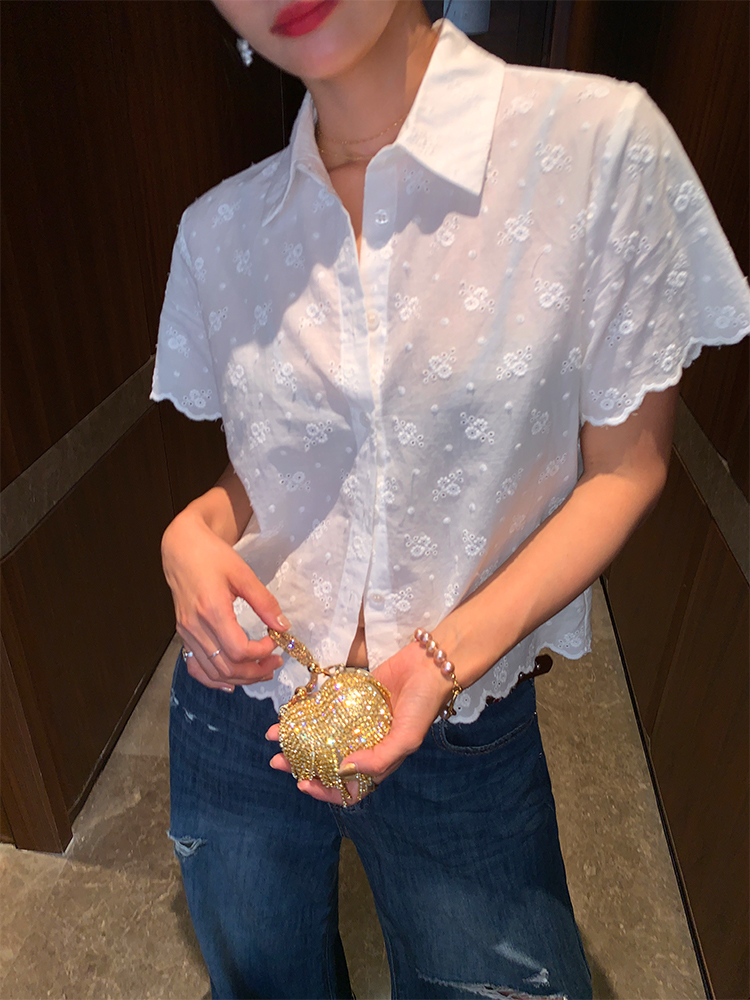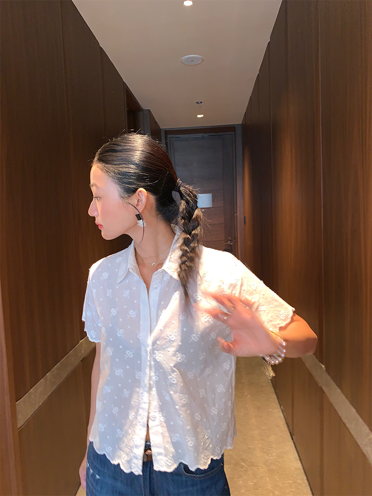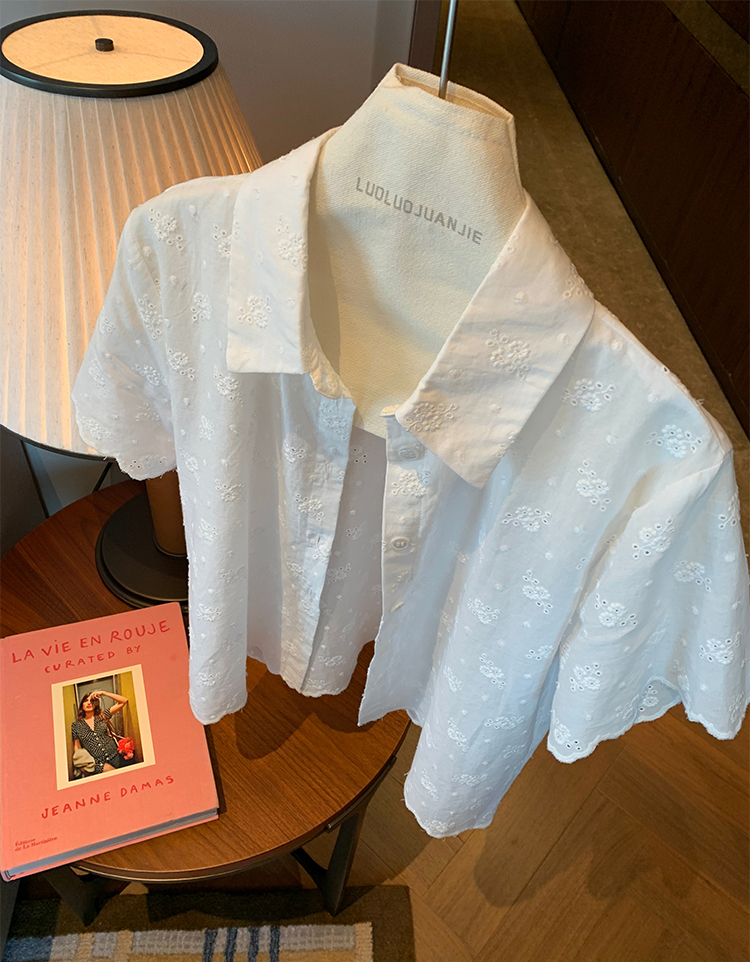 LUO refreshing short-sleeved embroidered hollow white shirt