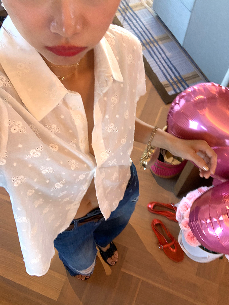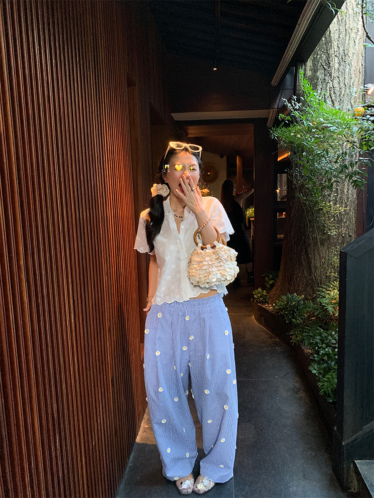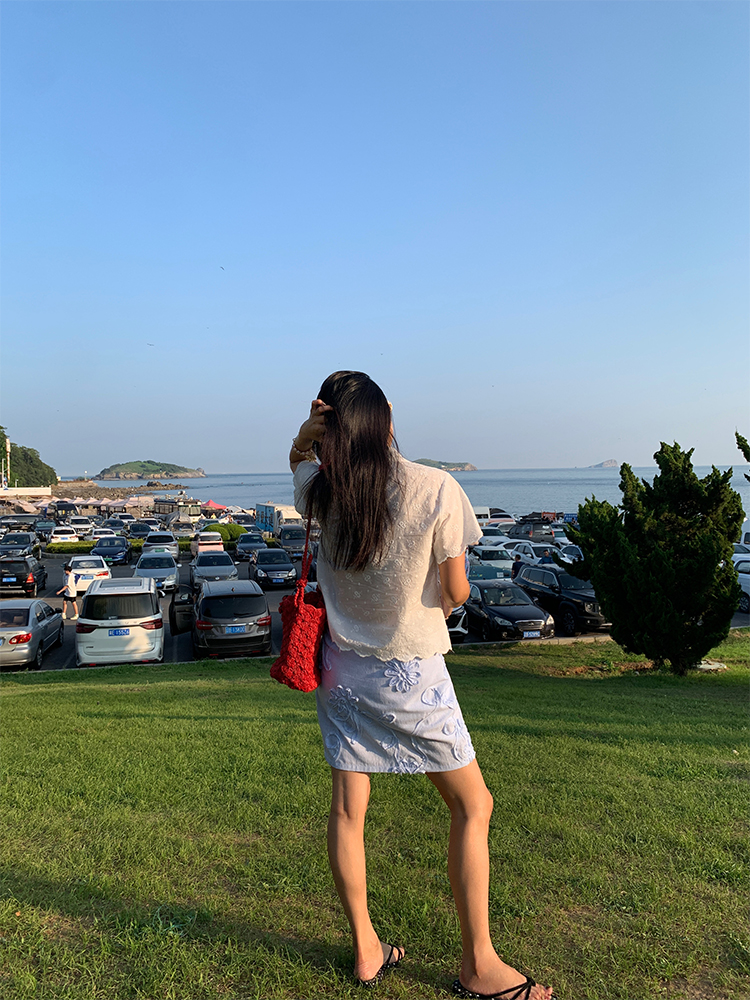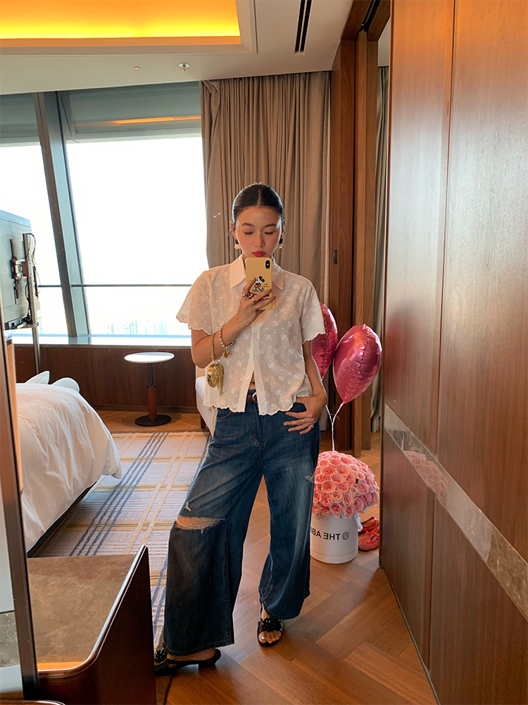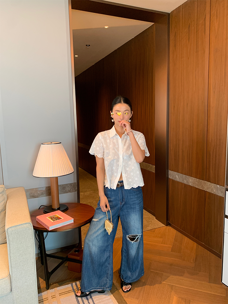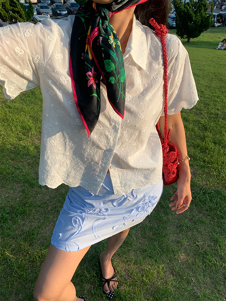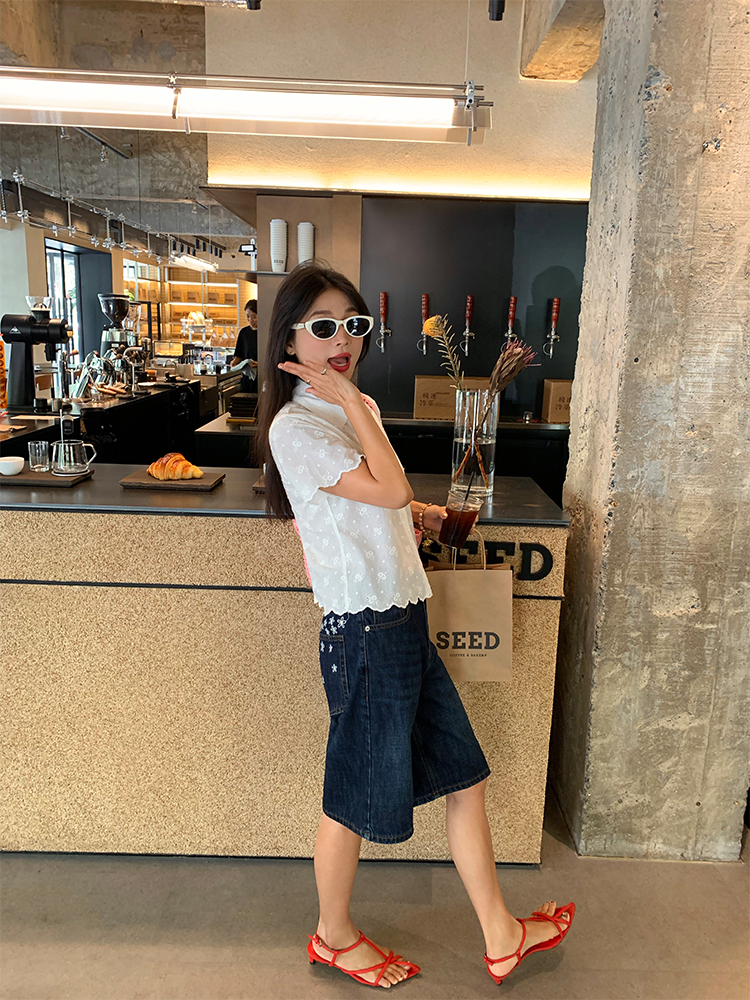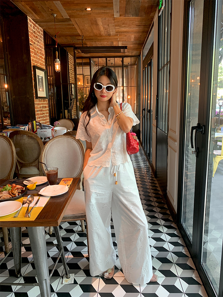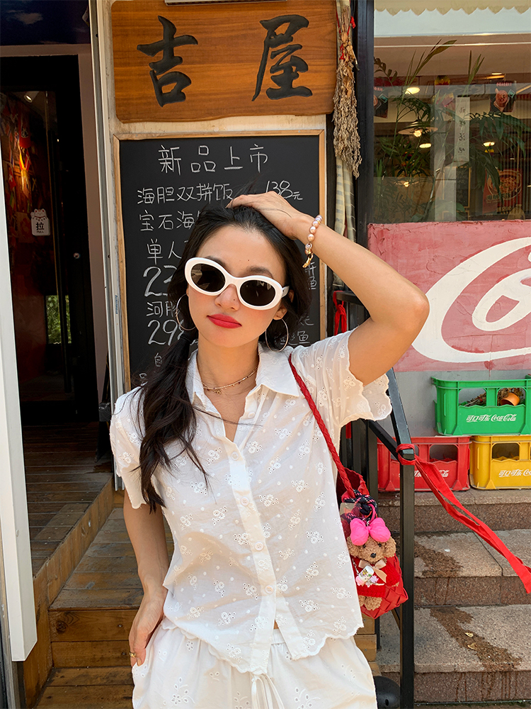 LUO refreshing short-sleeved embroidered hollow white shirt