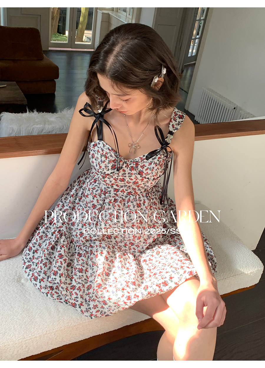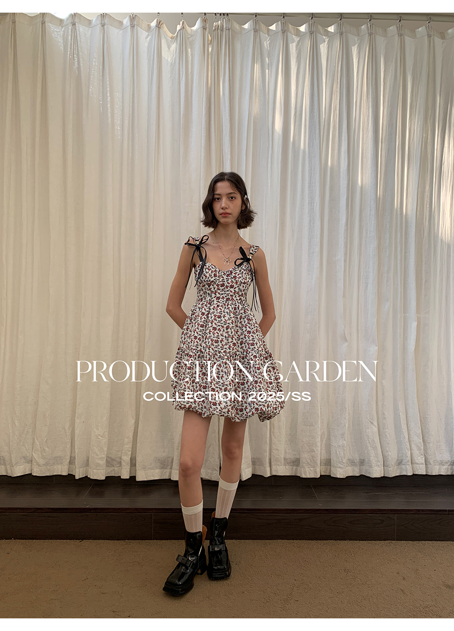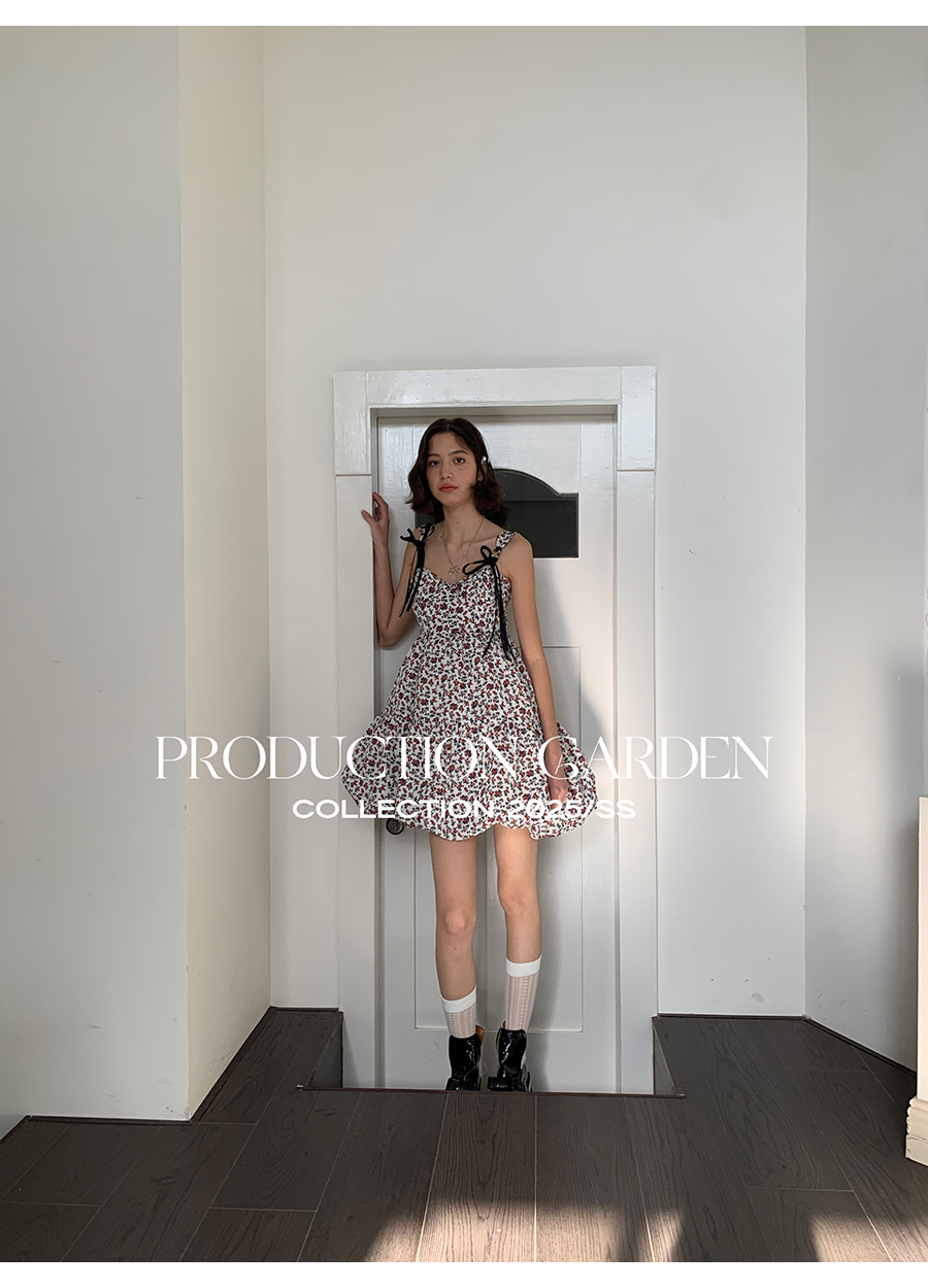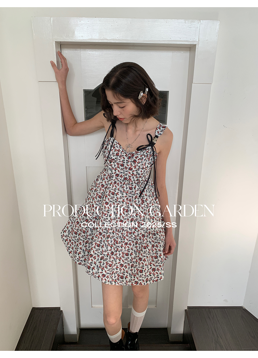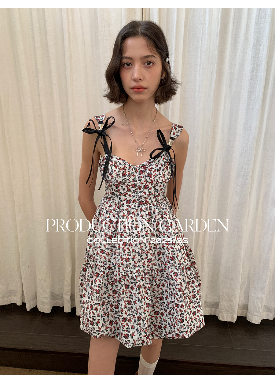 MORN romantic printed lace-up flower bud hem waist dress