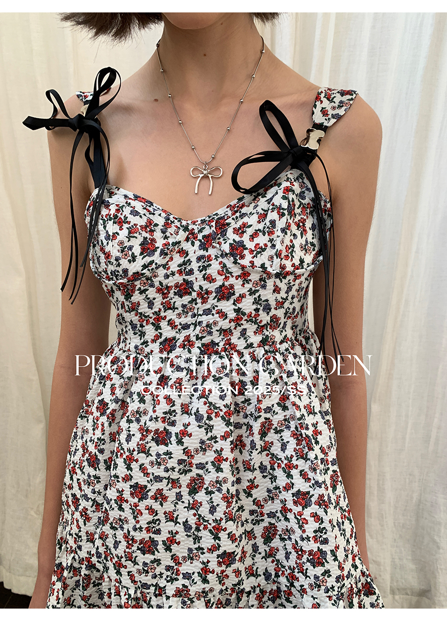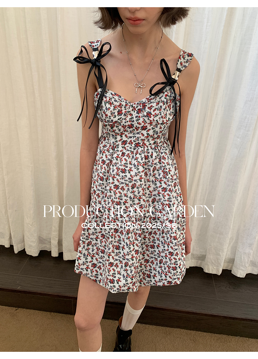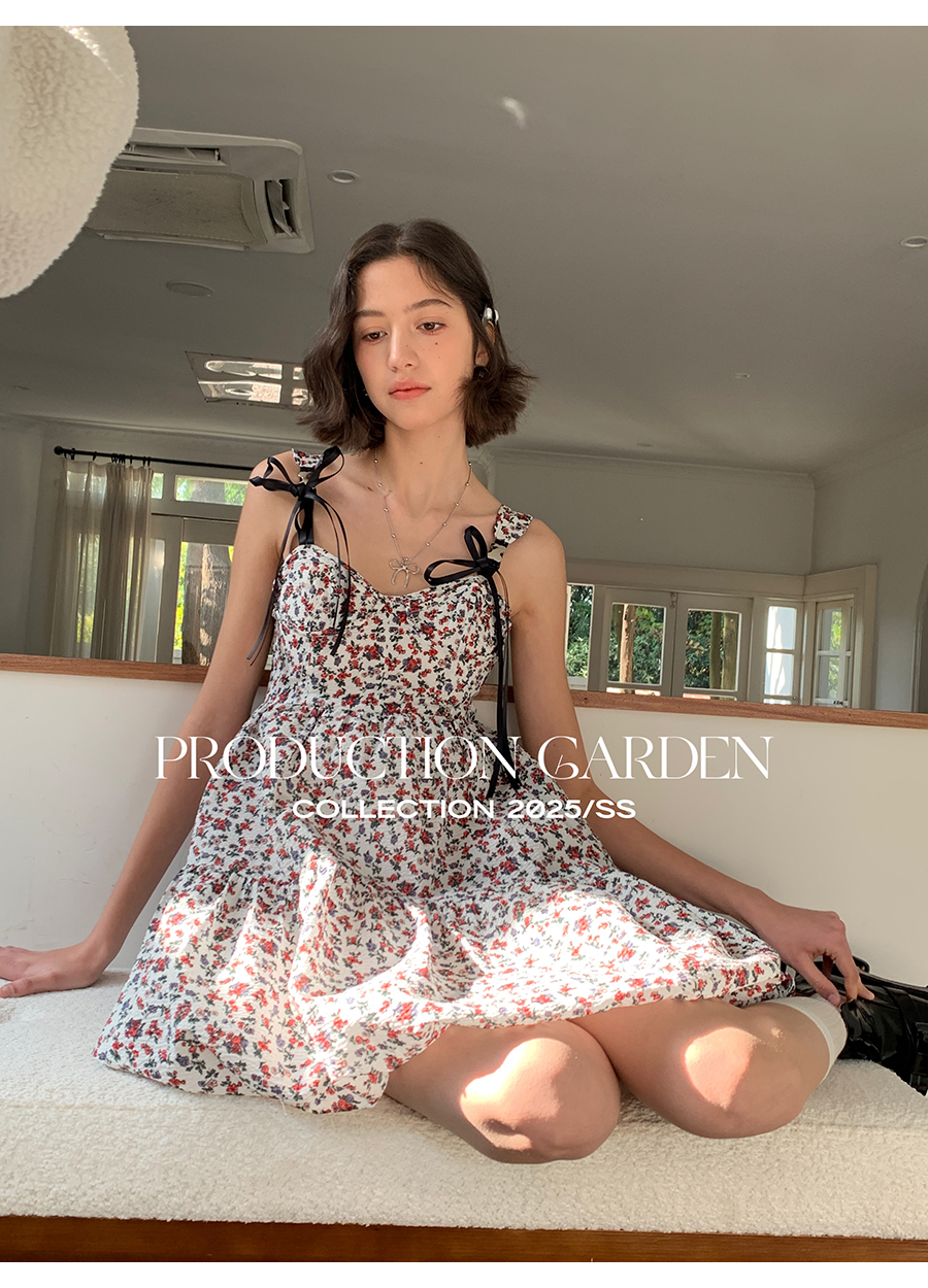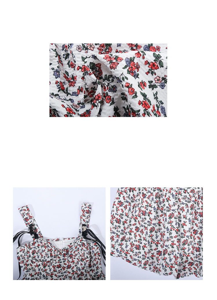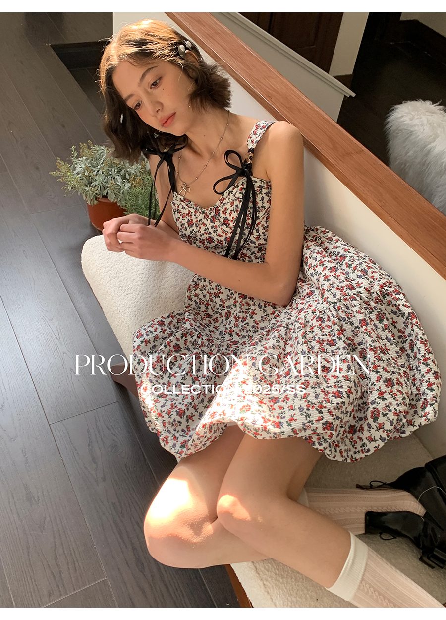 MORN romantic printed lace-up flower bud hem waist dress