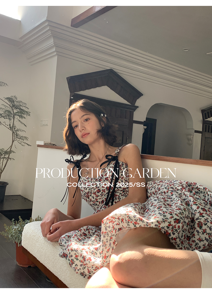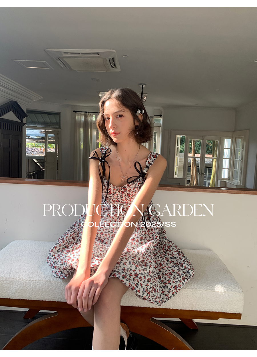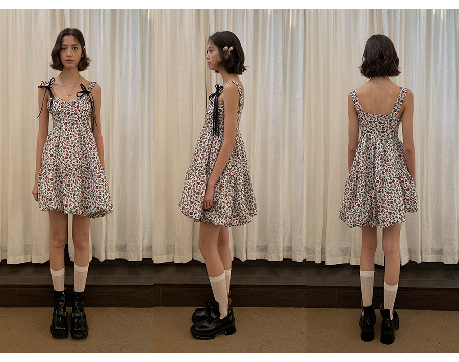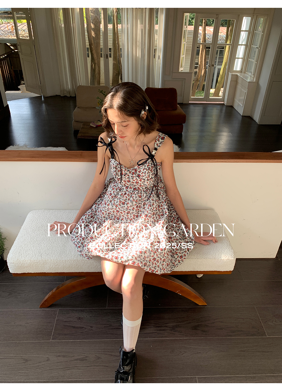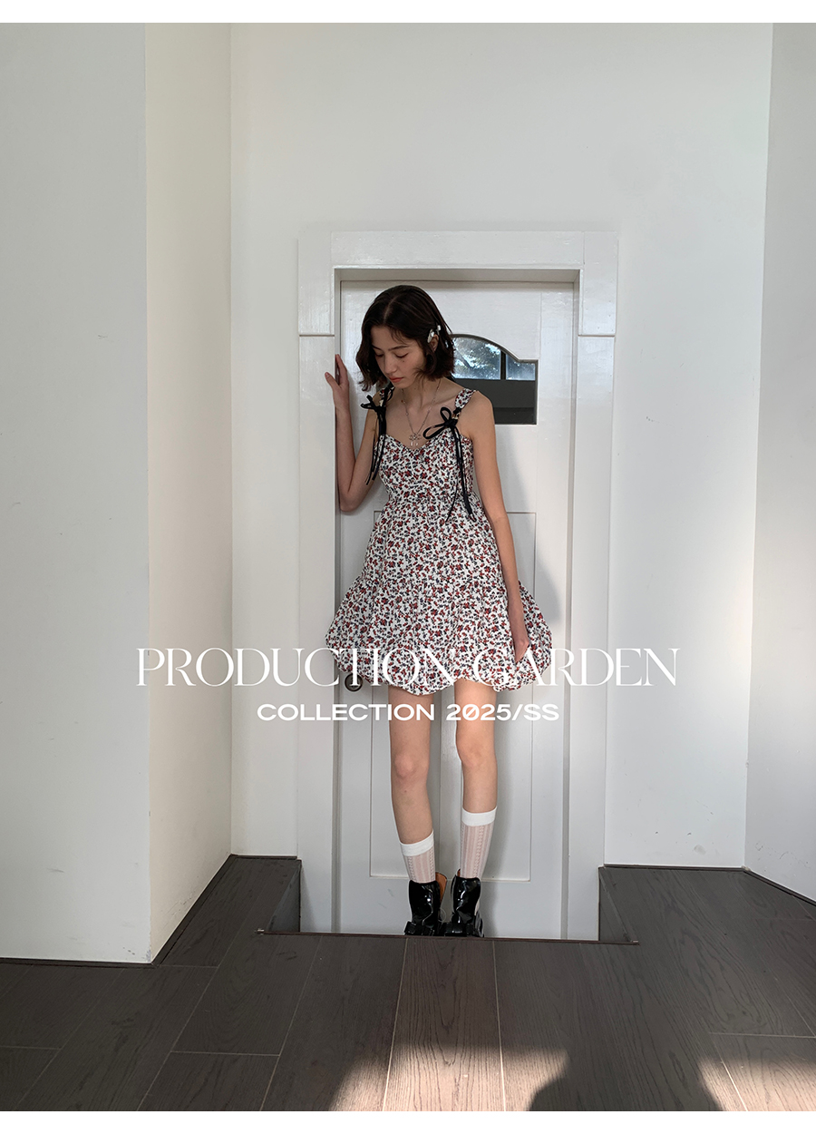 MORN romantic printed lace-up flower bud hem waist dress