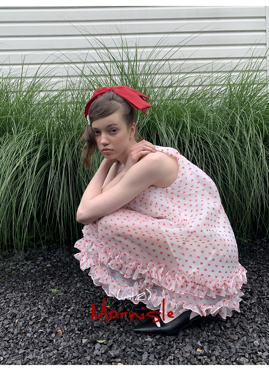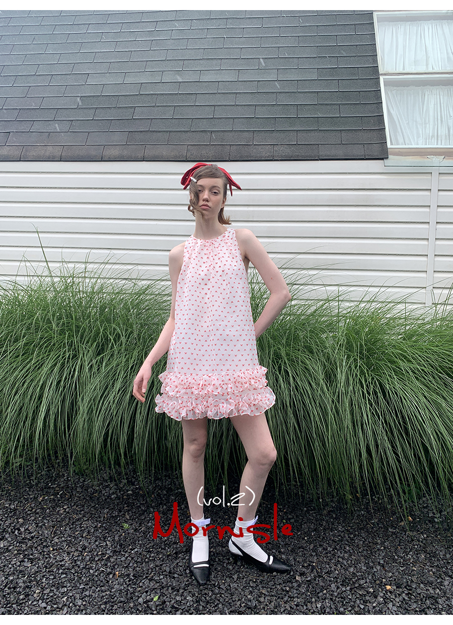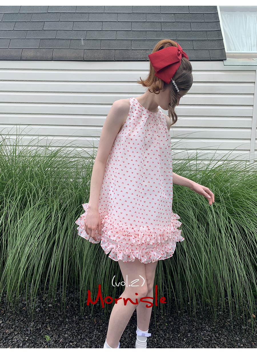 MORN Cloud Romantic sweet little bow print ruffled A-line vest dress