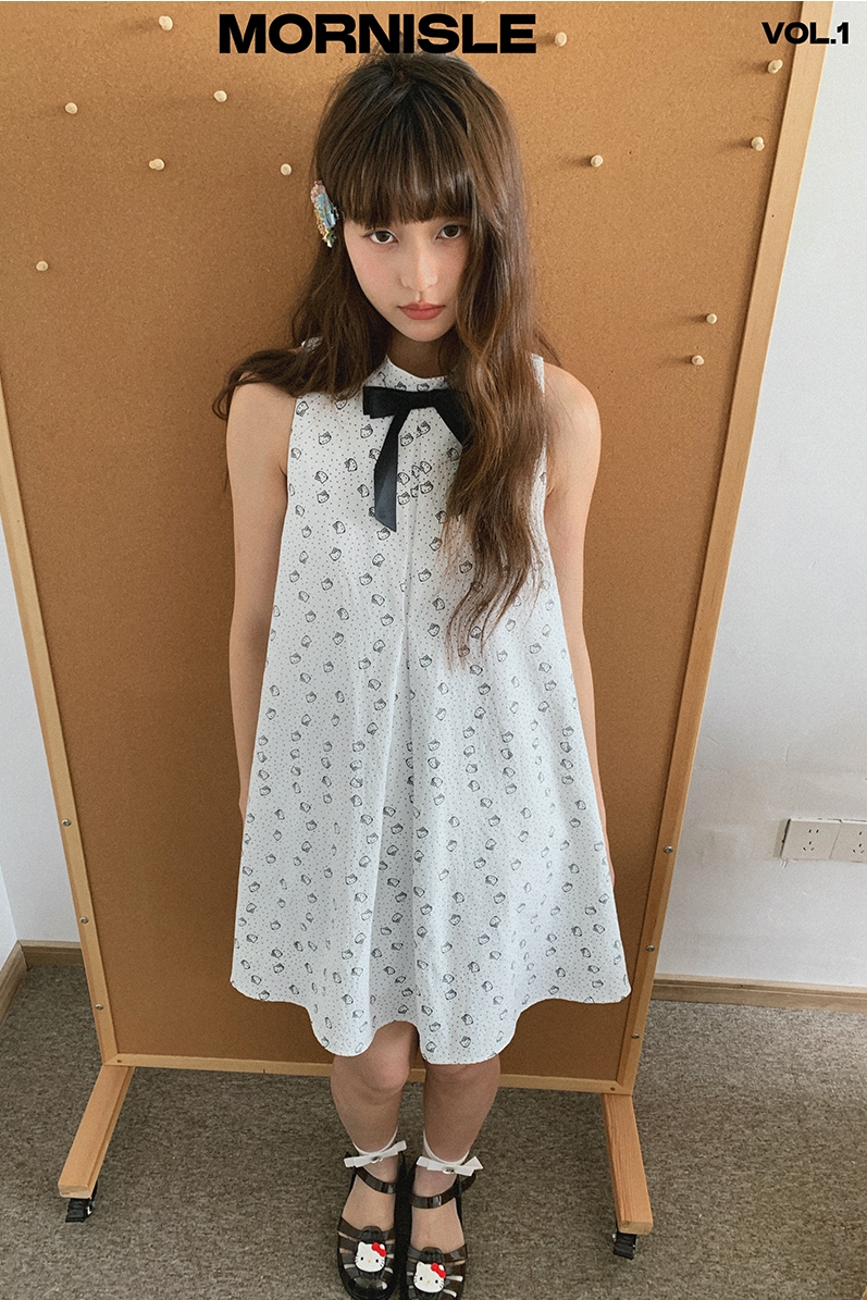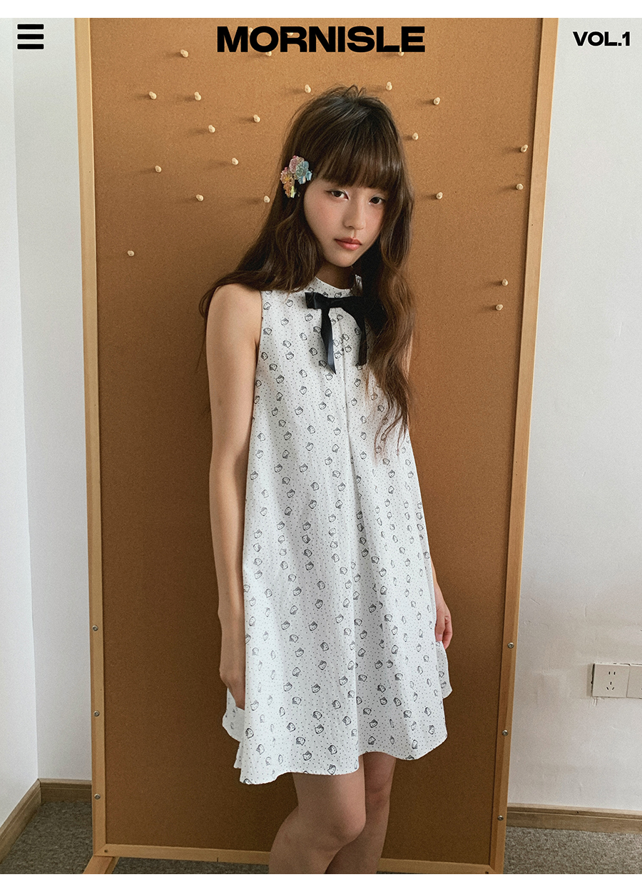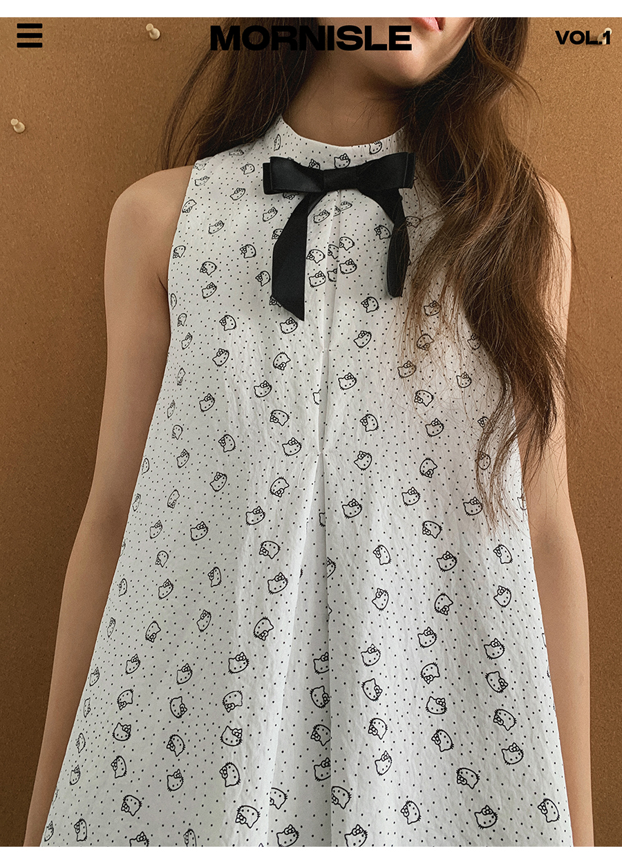 MORN retro girl cute cat print sleeveless A-line babydoll dress