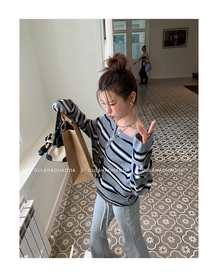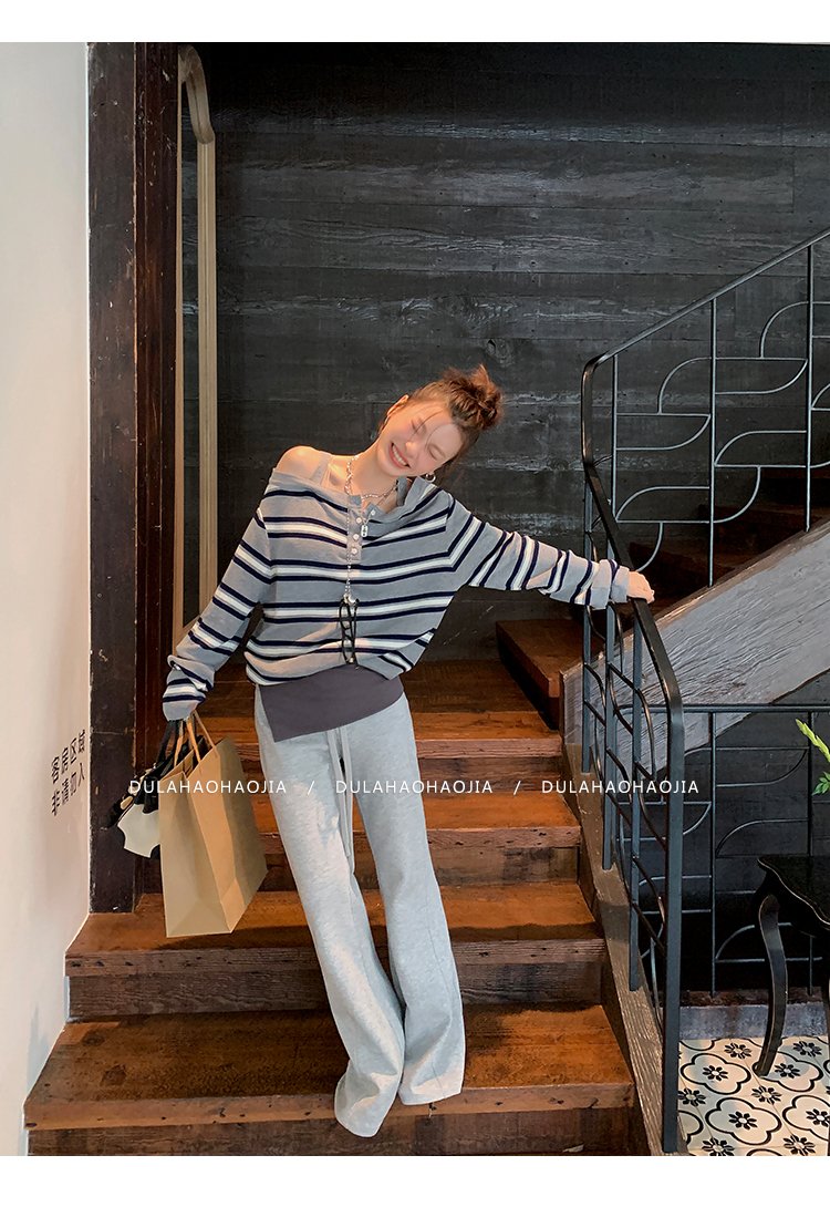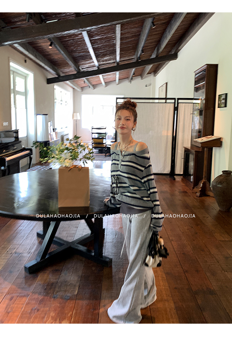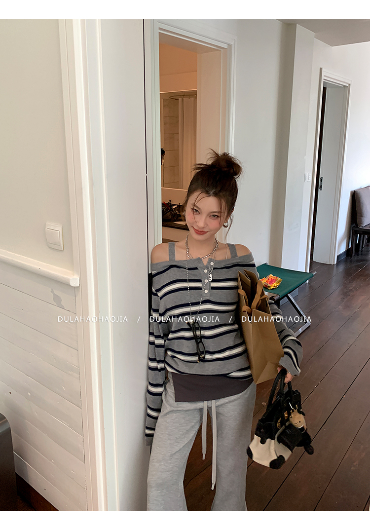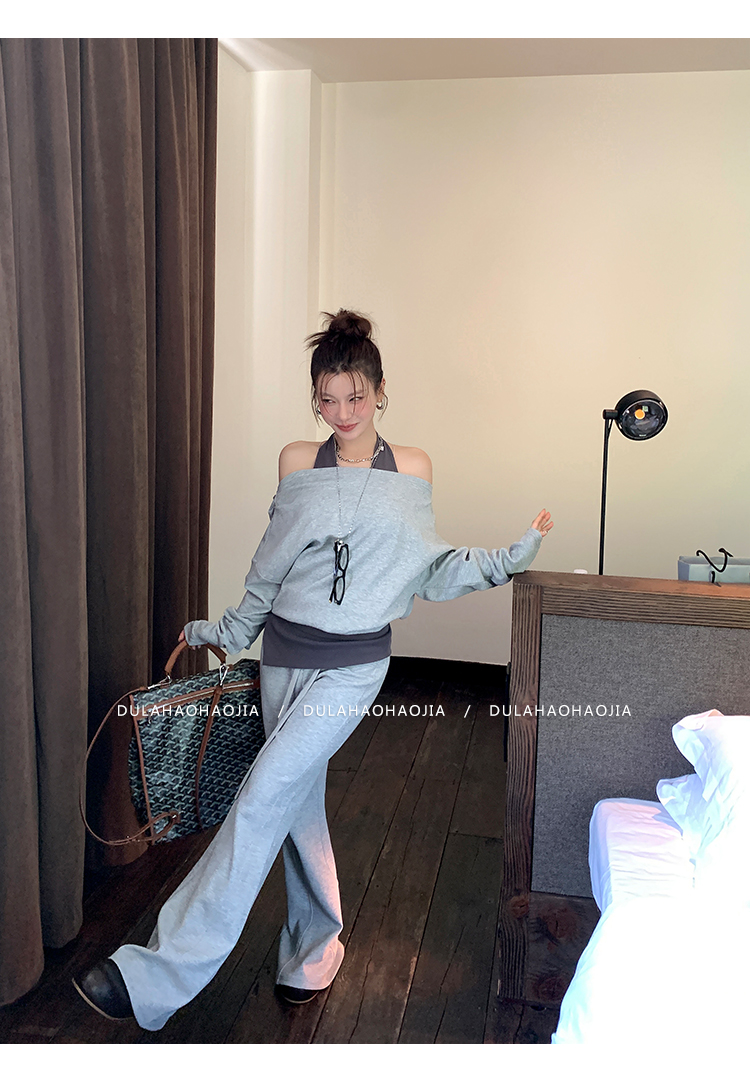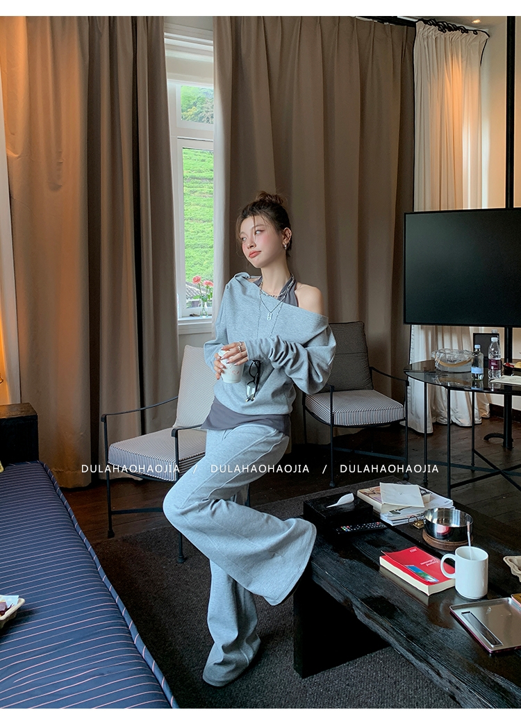 DULA Fake Two-Piece Off-The-Shoulder Sweatshirt + Flared Pants Set
