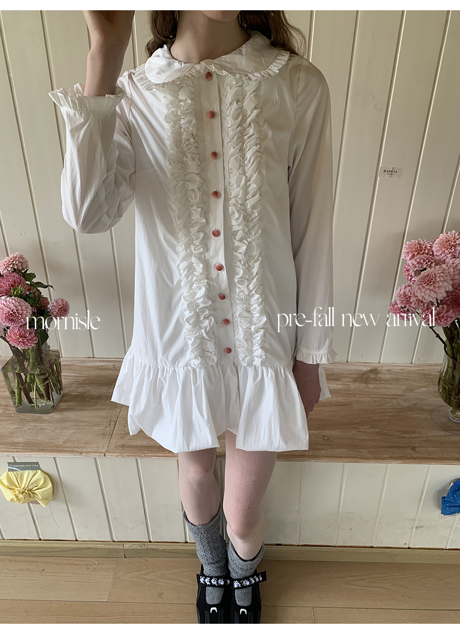 MORN French Bubble Pleated Baby Doll Collar Flower Bud Hem Shirt Dress