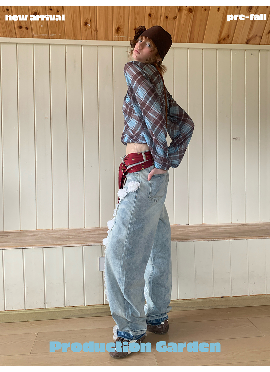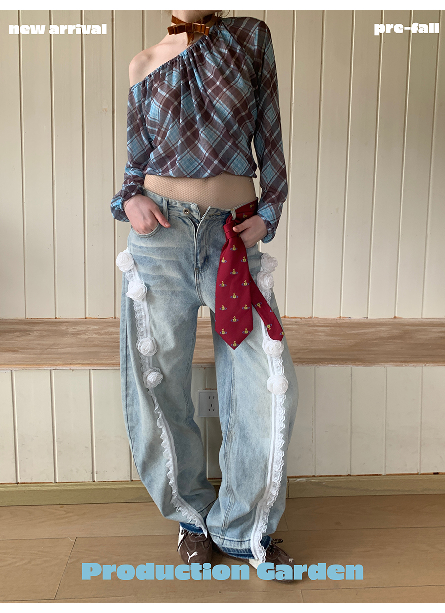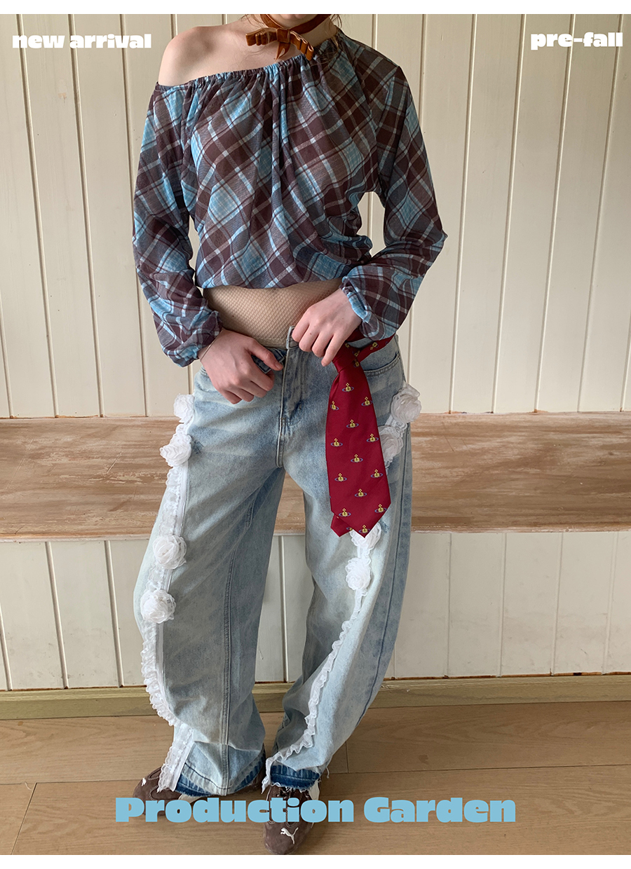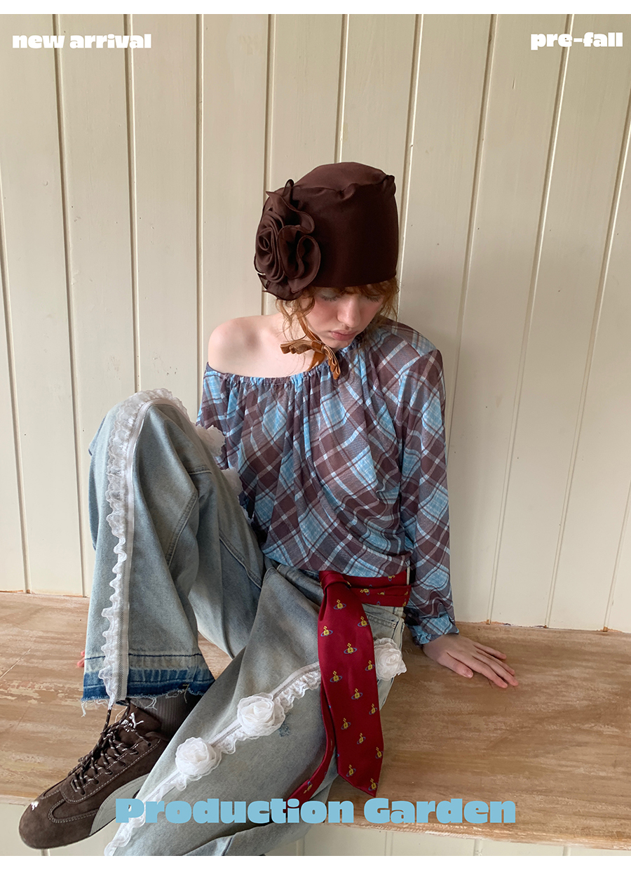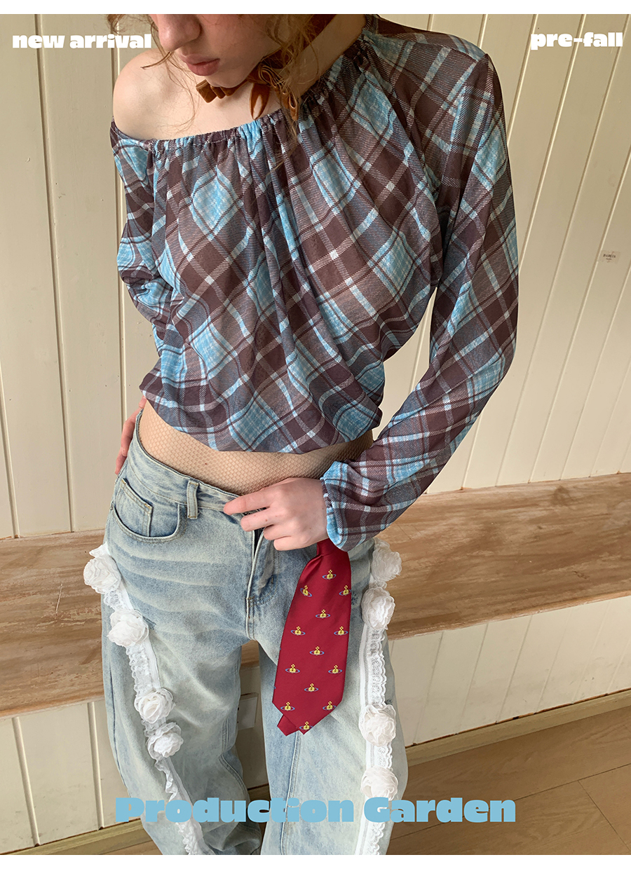 MORN retro elegant plaid print oblique shoulder long-sleeved T-shirt