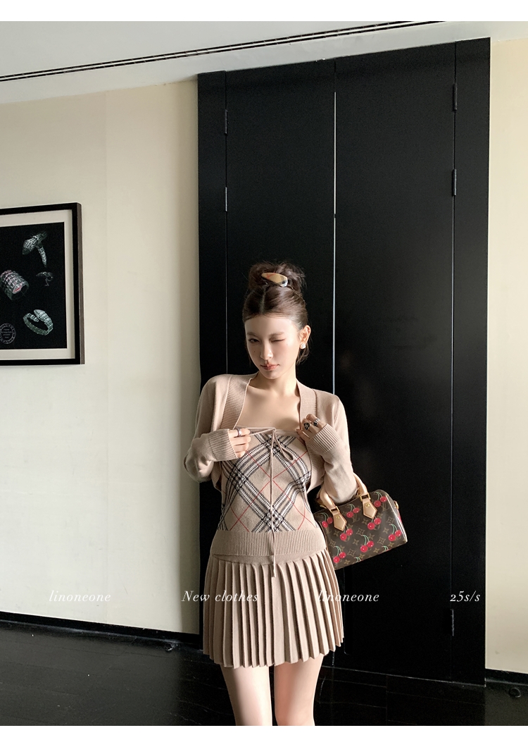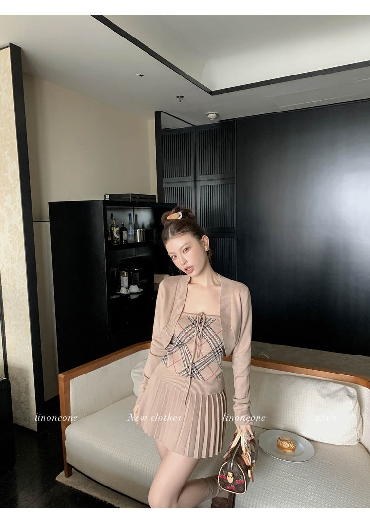 LIN Khaki Knitted Cardigan Plaid Tube Top Skirt Three-Piece Set