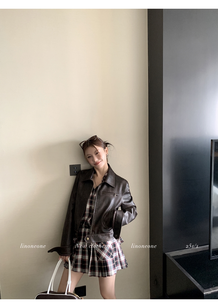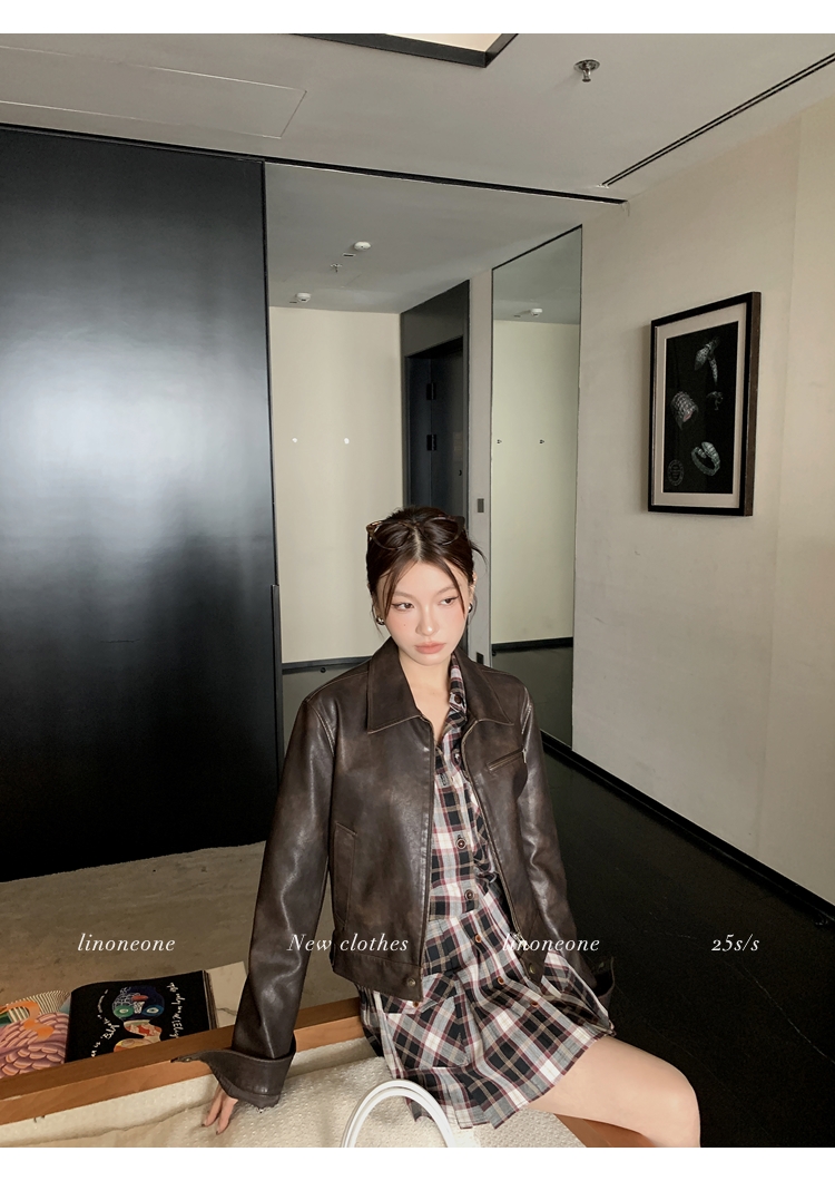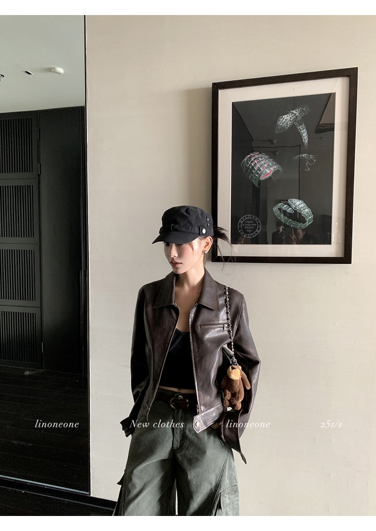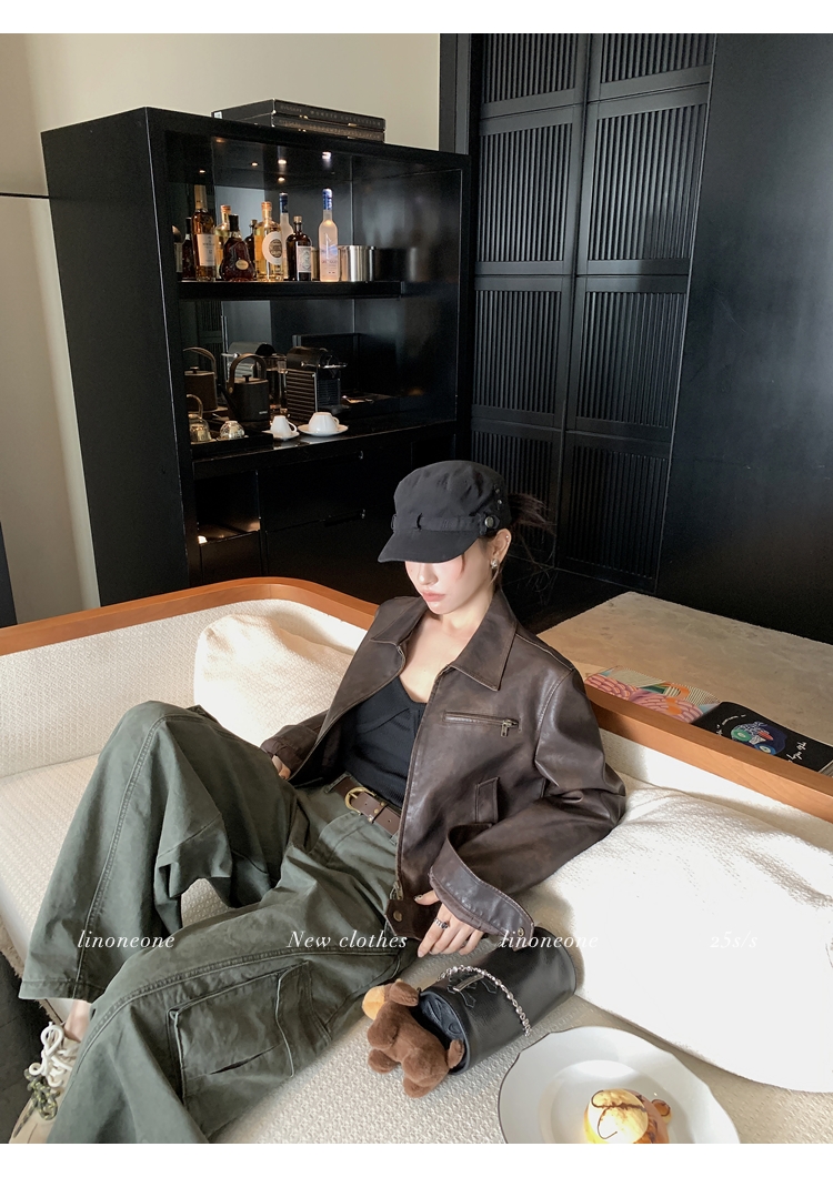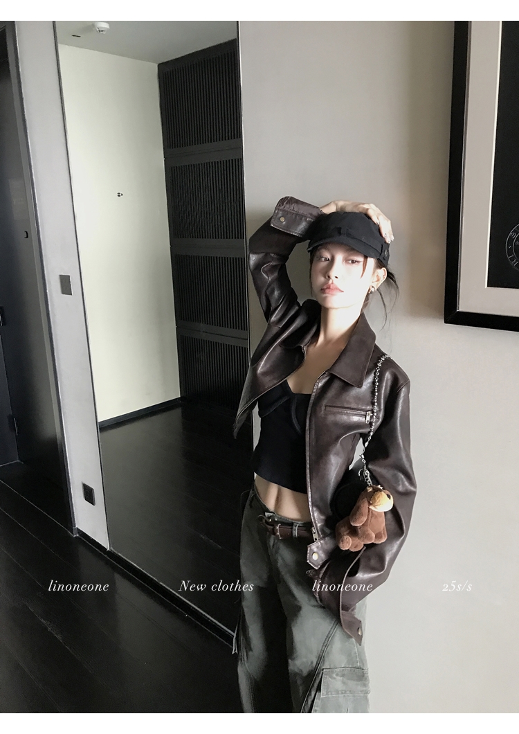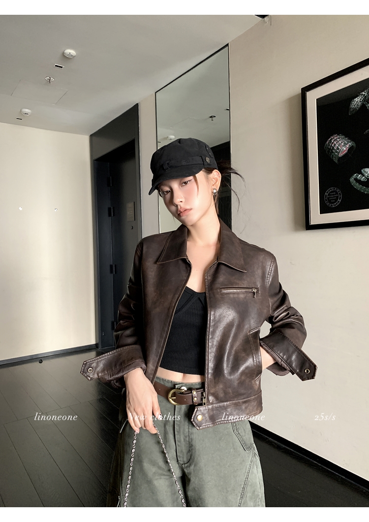 LIN Motorcycle Girl Vintage Brown Distressed Texture Leather Jacket