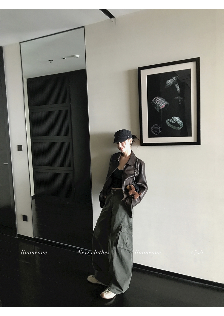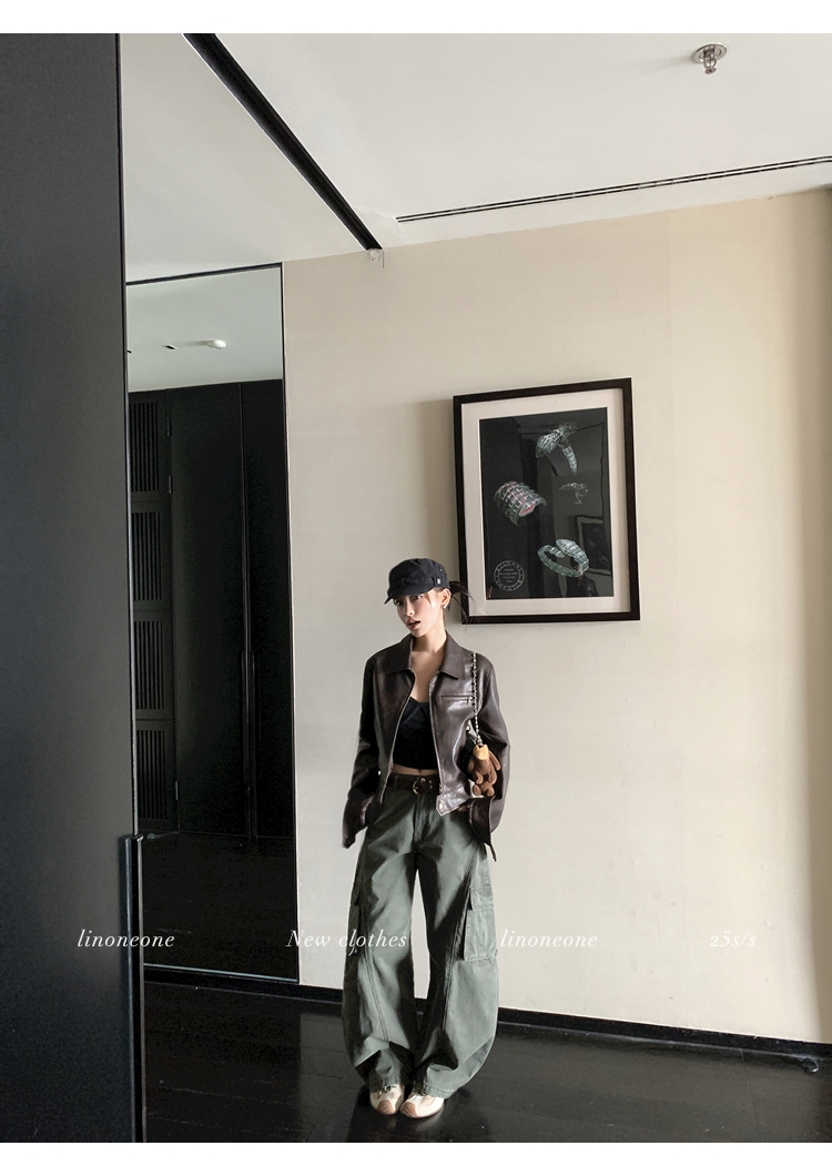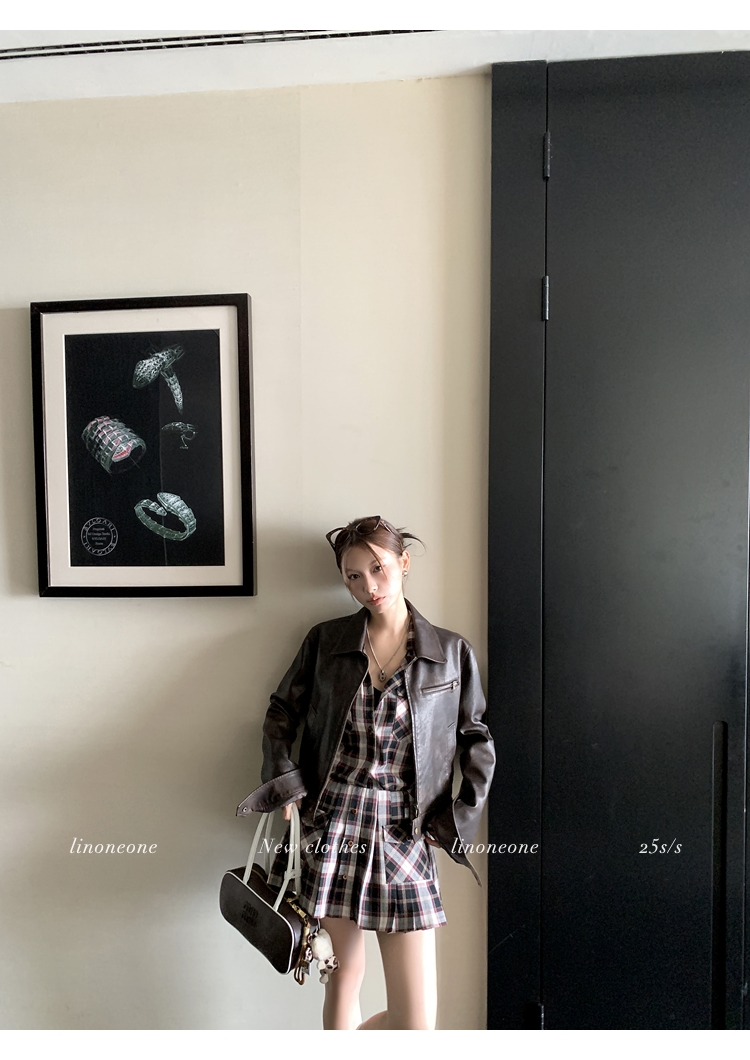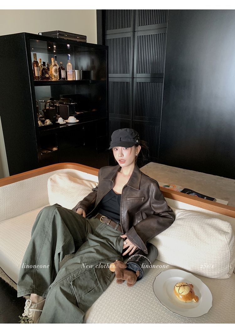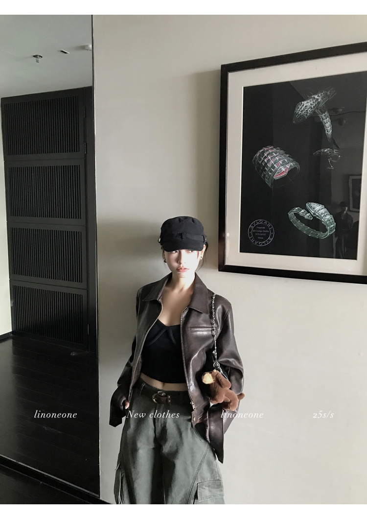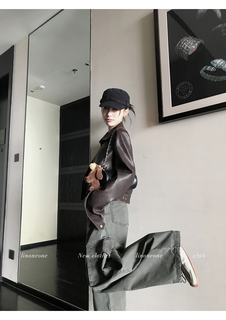 LIN Motorcycle Girl Vintage Brown Distressed Texture Leather Jacket