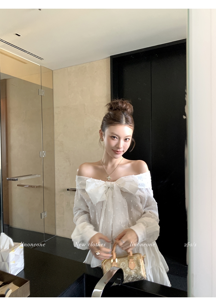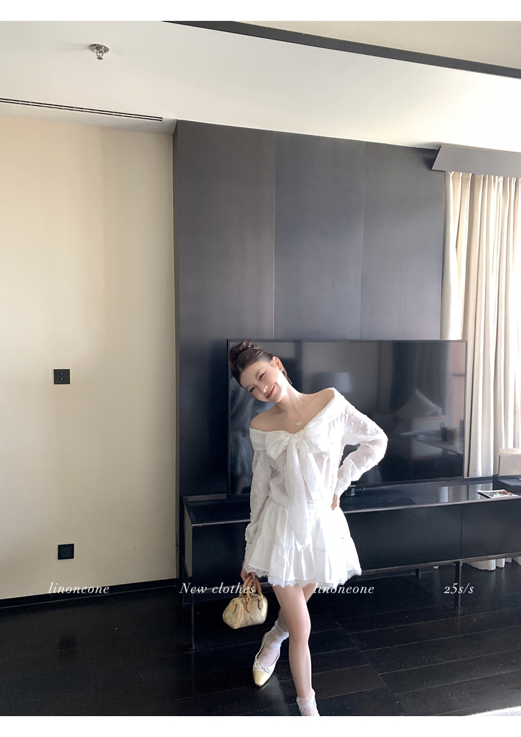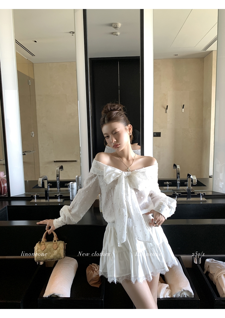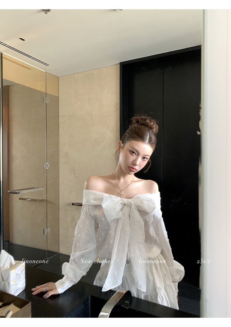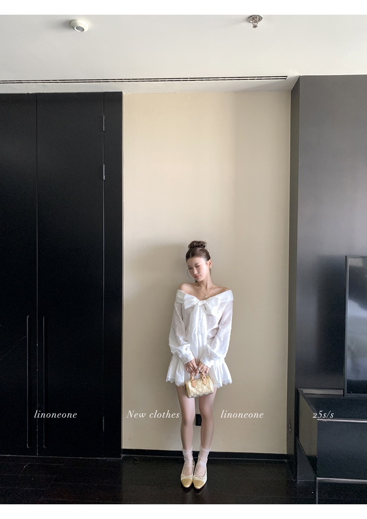 LIN Alice French One-shoulder Textured Bow Tie Shirt