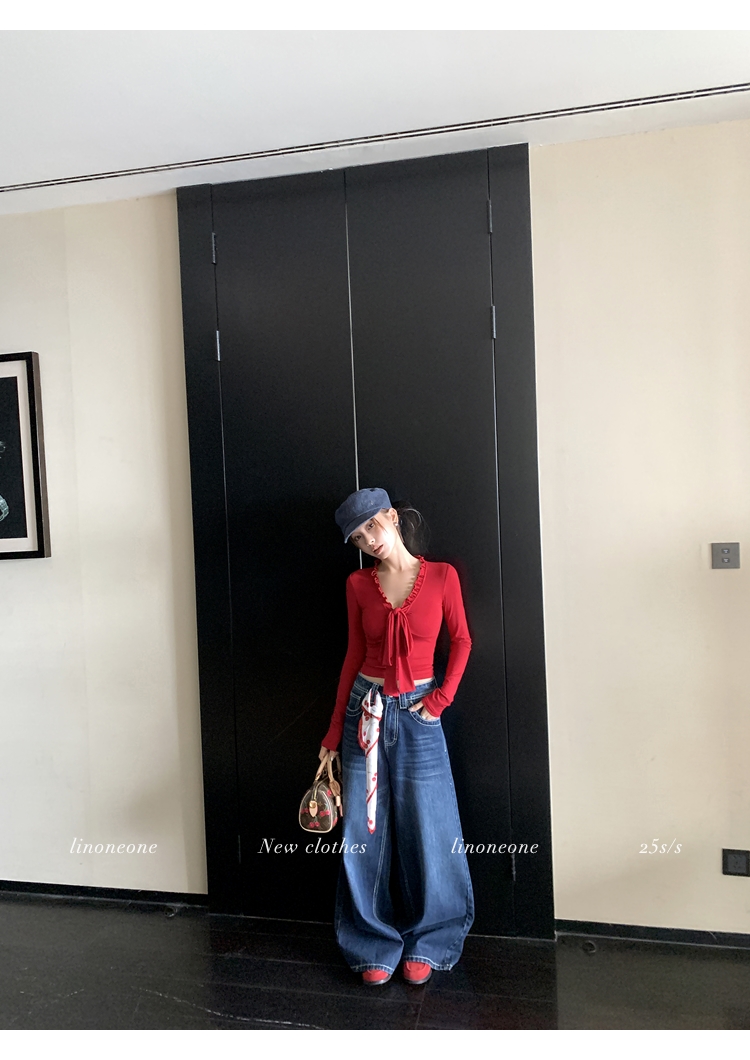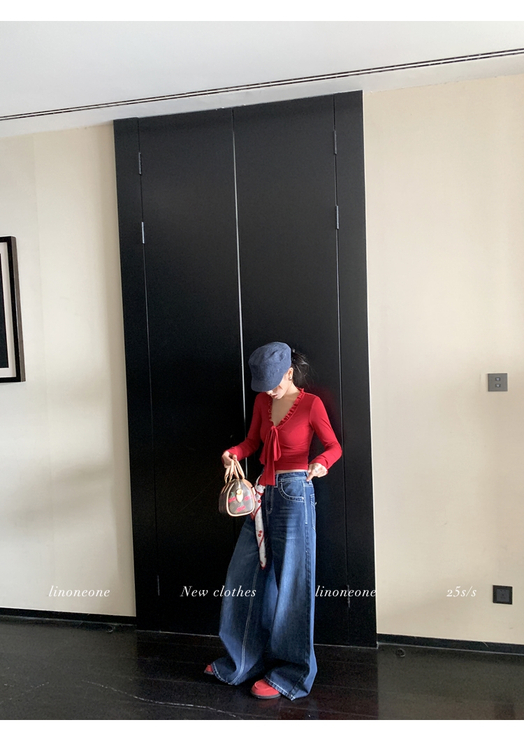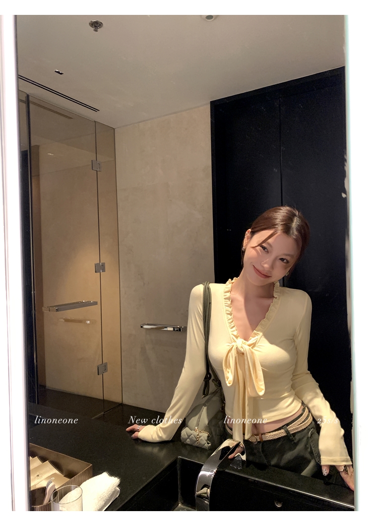 LIN Romantic Berry V-Neck Bow Tie Slim Fit Stretch Long Sleeve T-Shirt