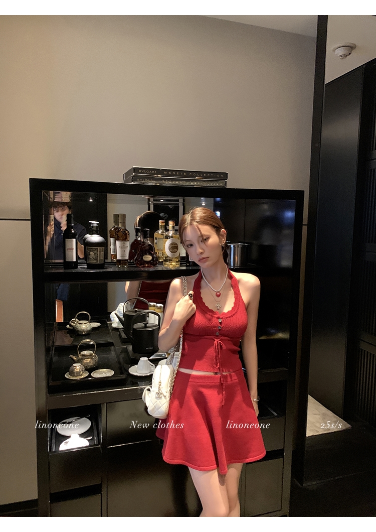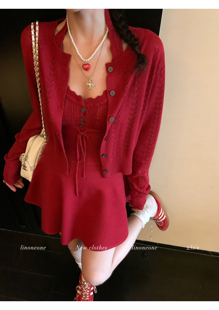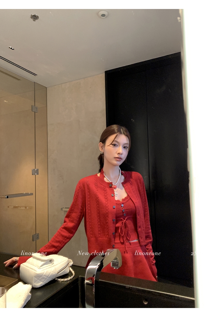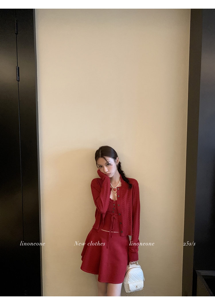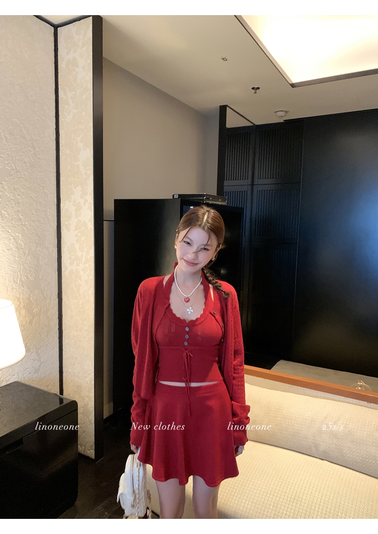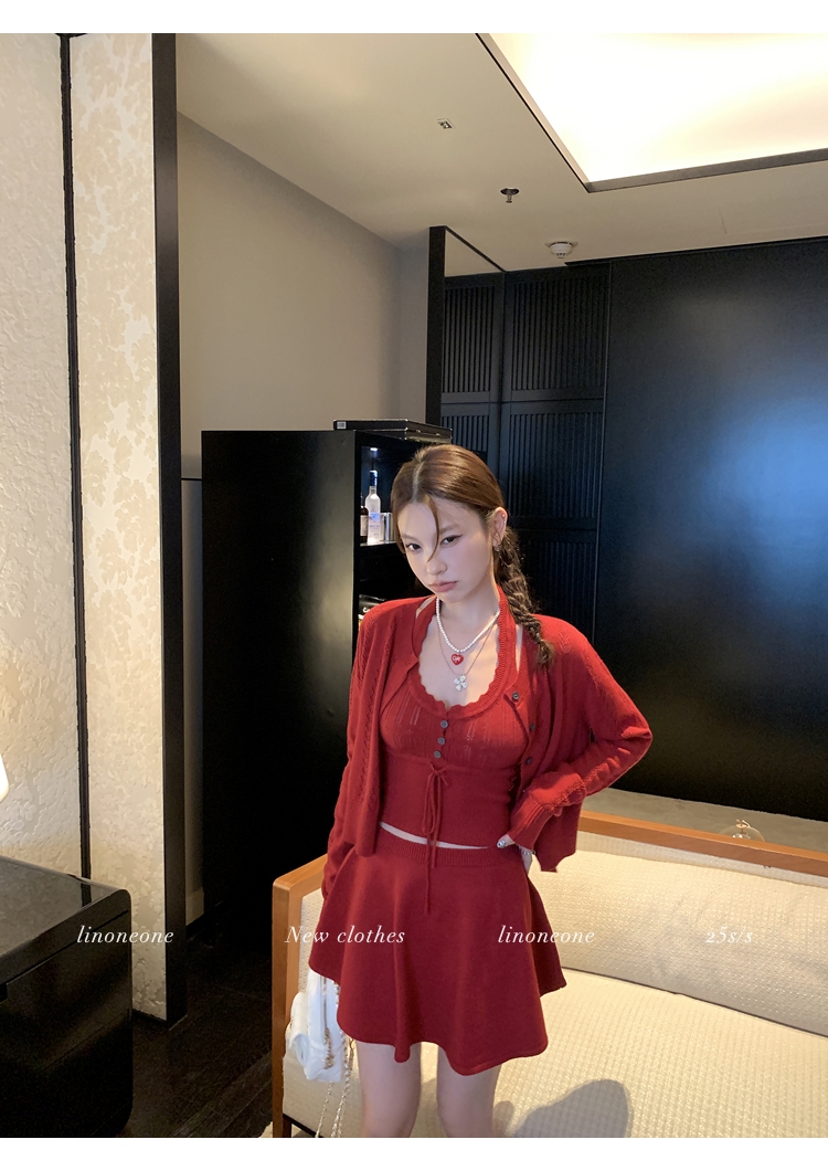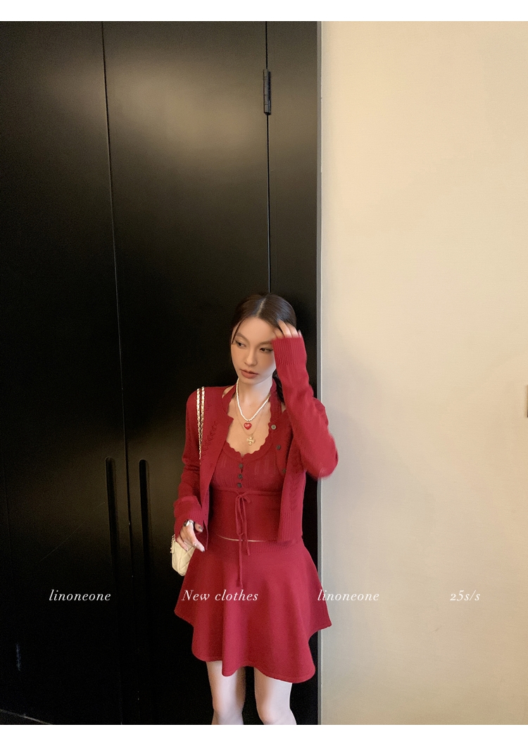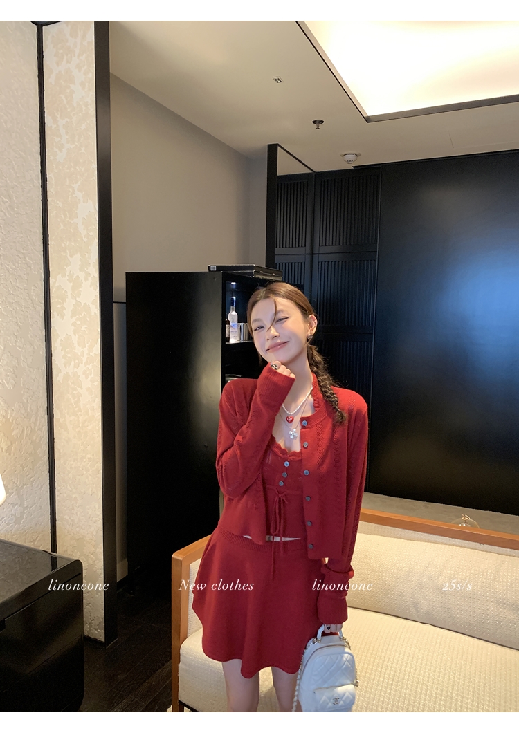 LIN red crocheted wool knitted cardigan / halterneck vest / skirt set